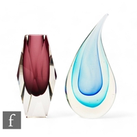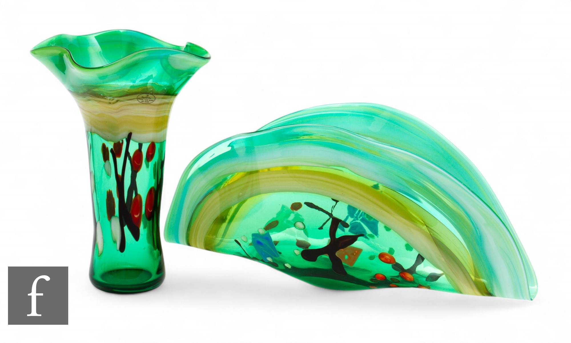 Viz Glass - A contemporary Murano glass vase of sleeve form with flared wave rim, decorated with opal and ruby spots and black trails below an opal border, all against a green ground, retains label, height 34.5cm, together with a large folded dish in a similar design. (2)