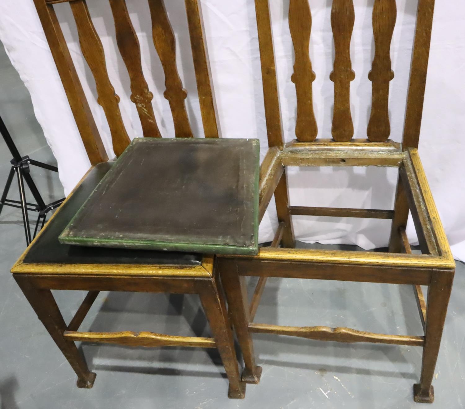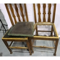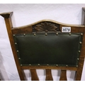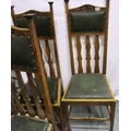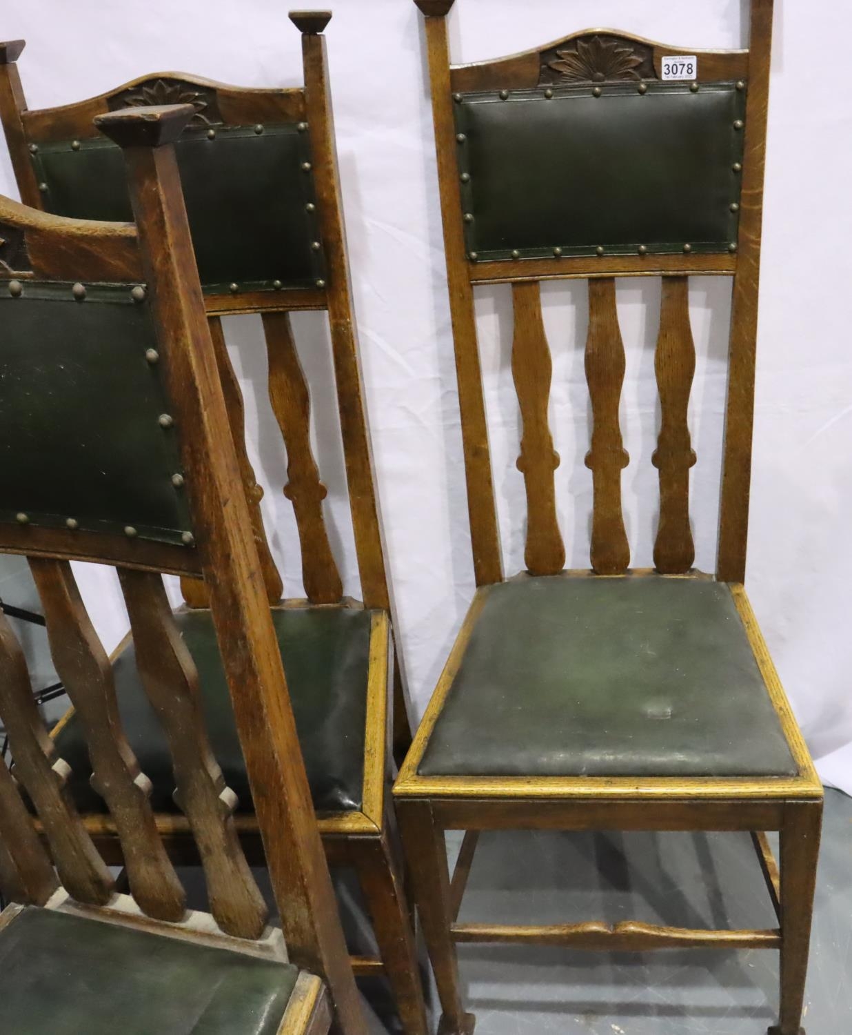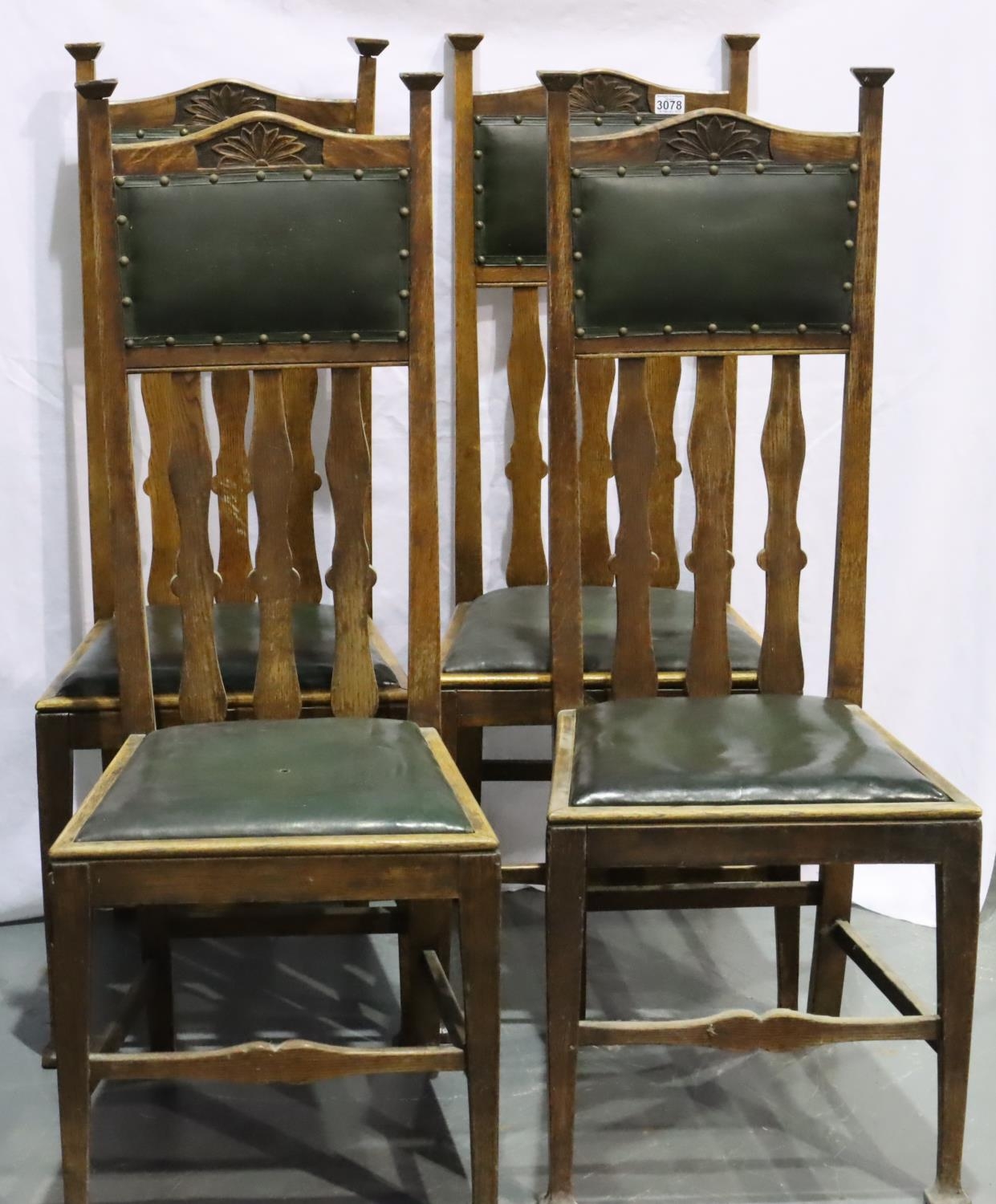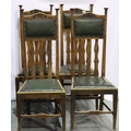 Set of four Victorian oak high back dining chairs in the Arts and Crafts manner, with green leatherette upholstered drop in seats, each H: 121 cm. Not available for in-house P&P, contact Paul O'Hea at Mailboxes on 01925 659133