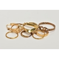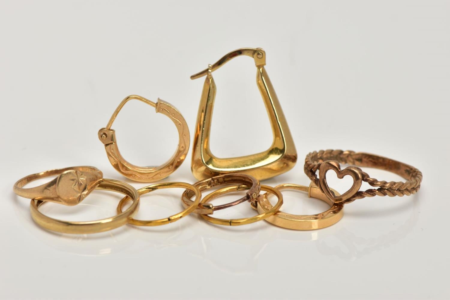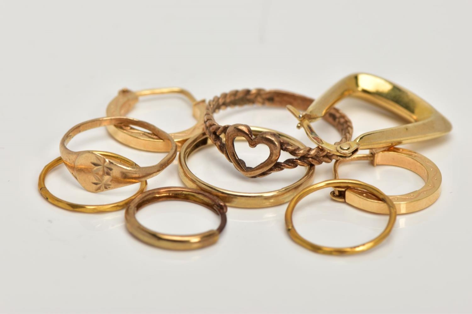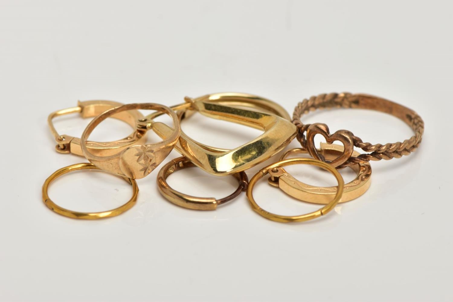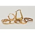 A BAG OF ASSORTED 9CT GOLD AND YELLOW METAL JEWELLERY, to include two pairs of sleeper earrings, two rings and loose earrings, all with marks to indicate 9ct gold, approximate gross weight 4.9 grams