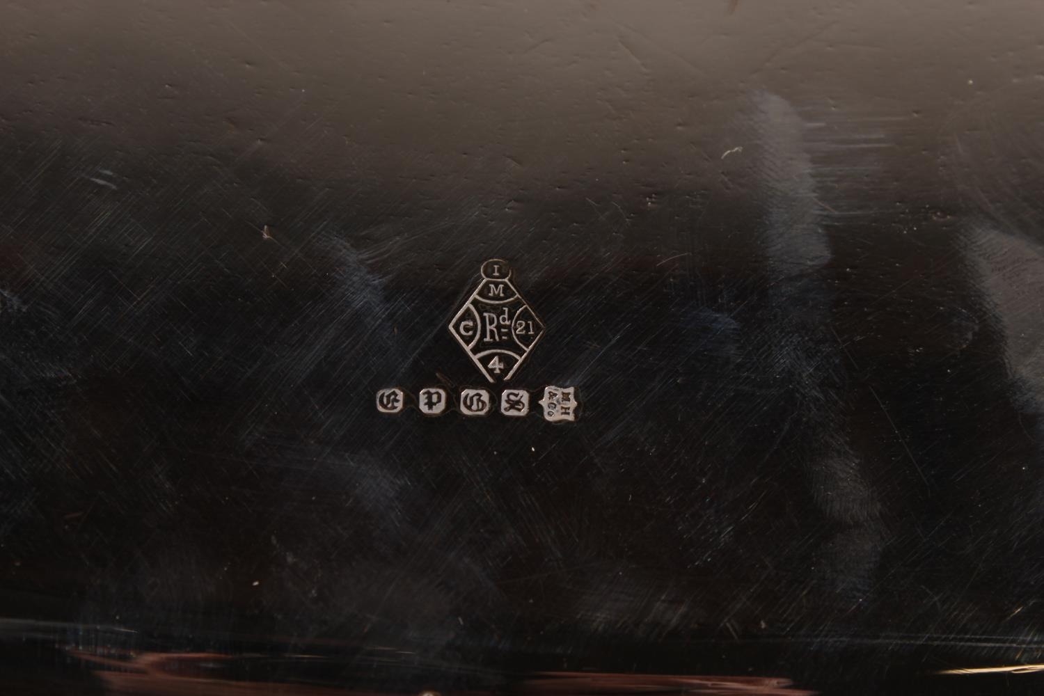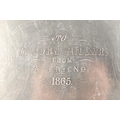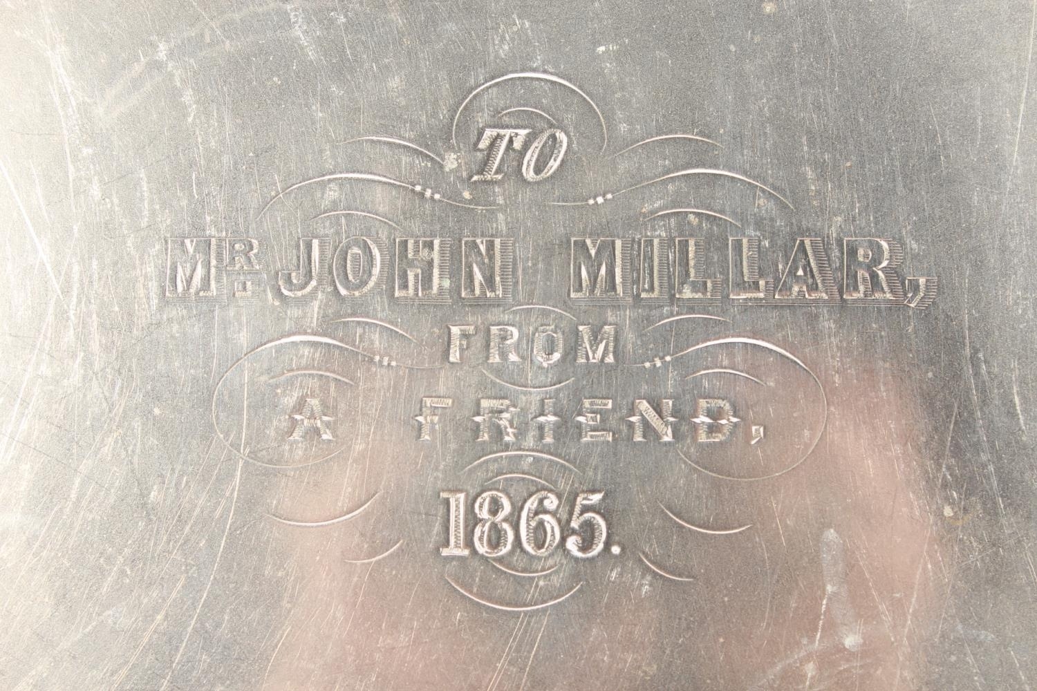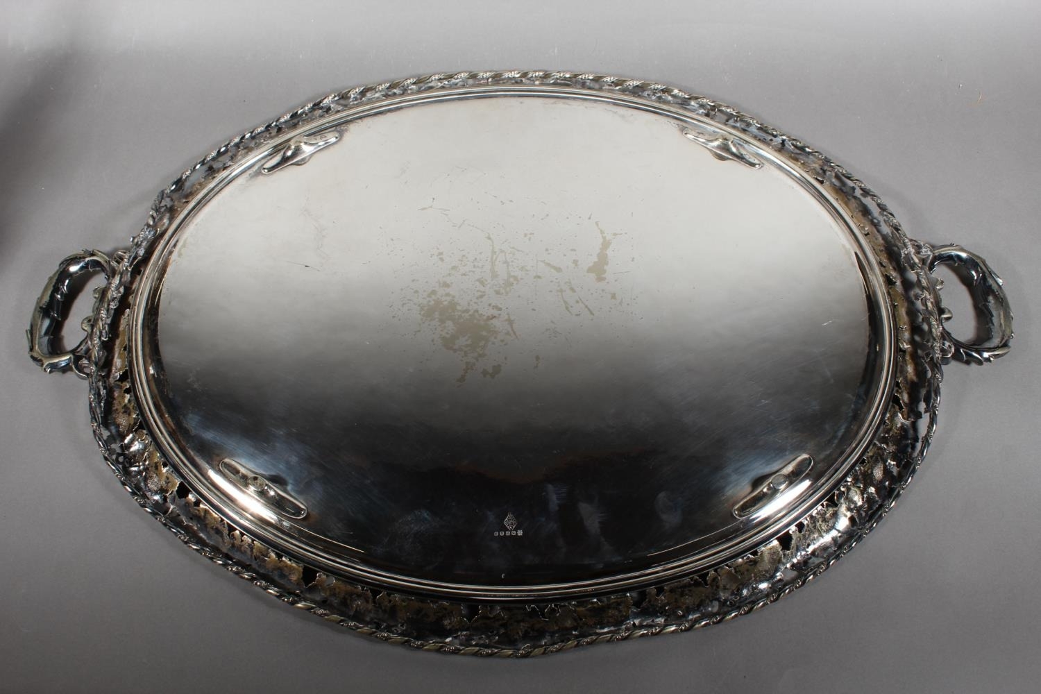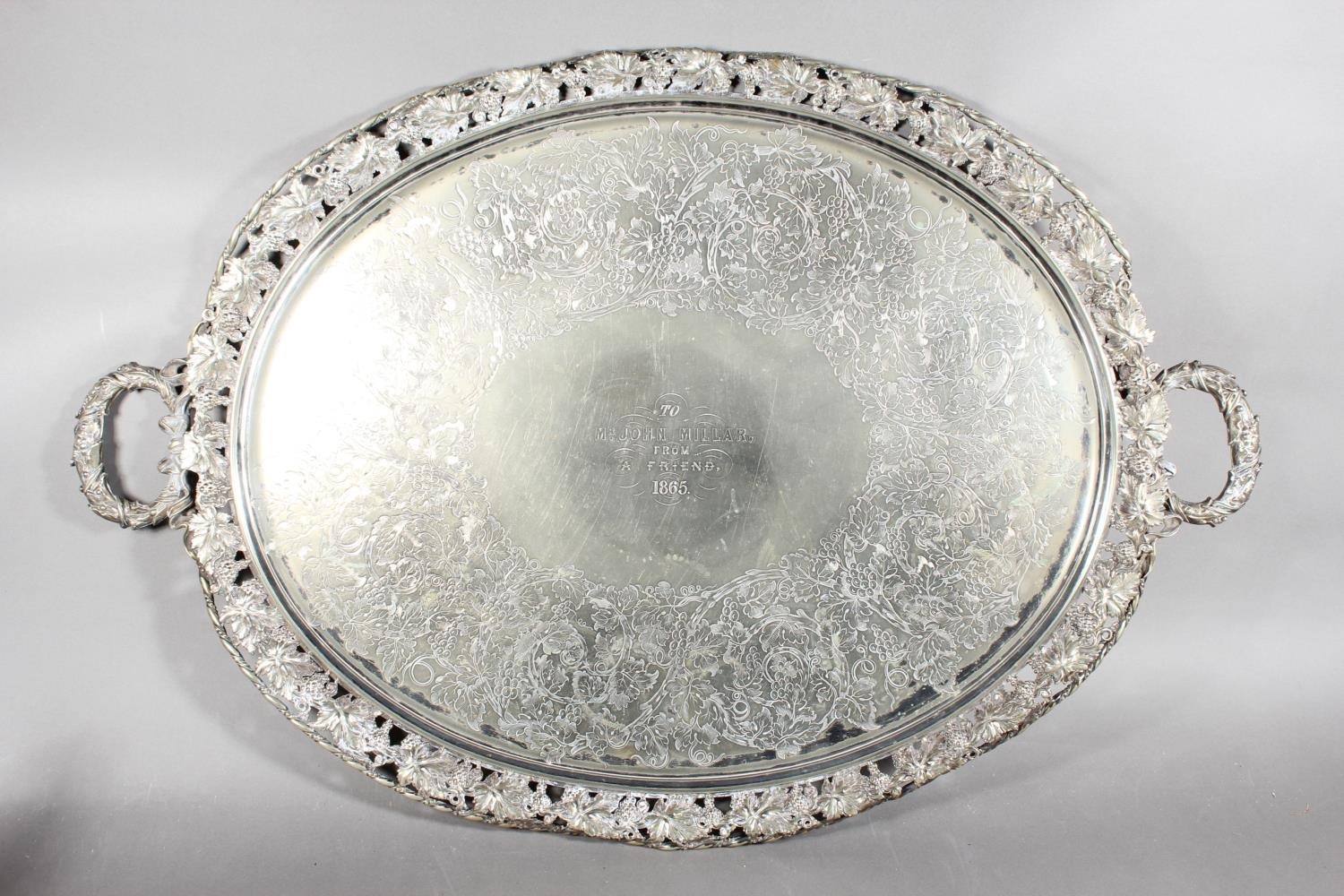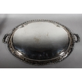 Silver-plated twin-handled tray with foliate border and decoration.