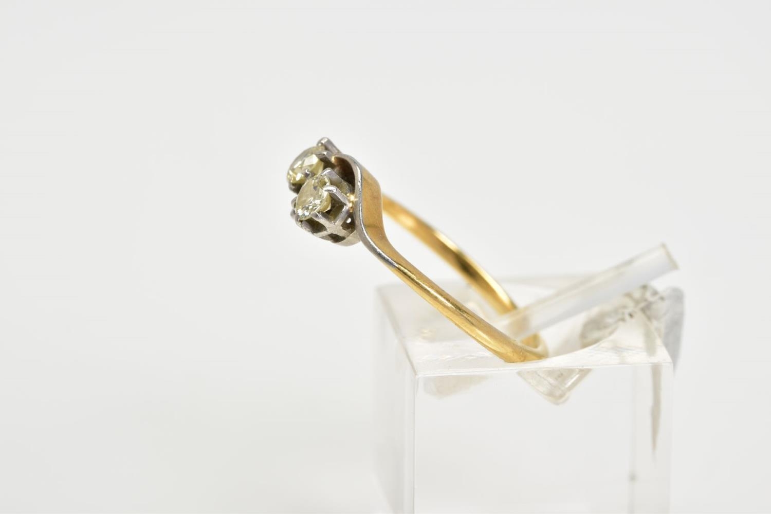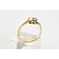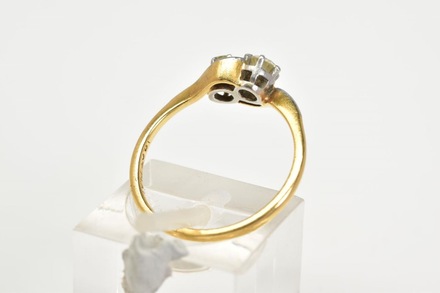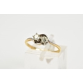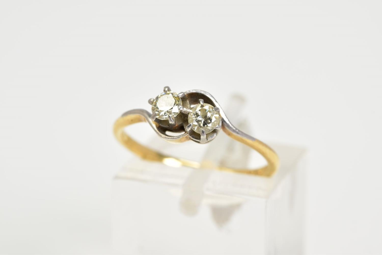 A YELLOW METAL DIAMOND RING, of crossover design set with two round brilliant cut diamonds, total estimated diamond weight 0.30ct, stamped 18ct plat, ring size K, approximate gross weight 2.5 grams
