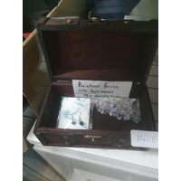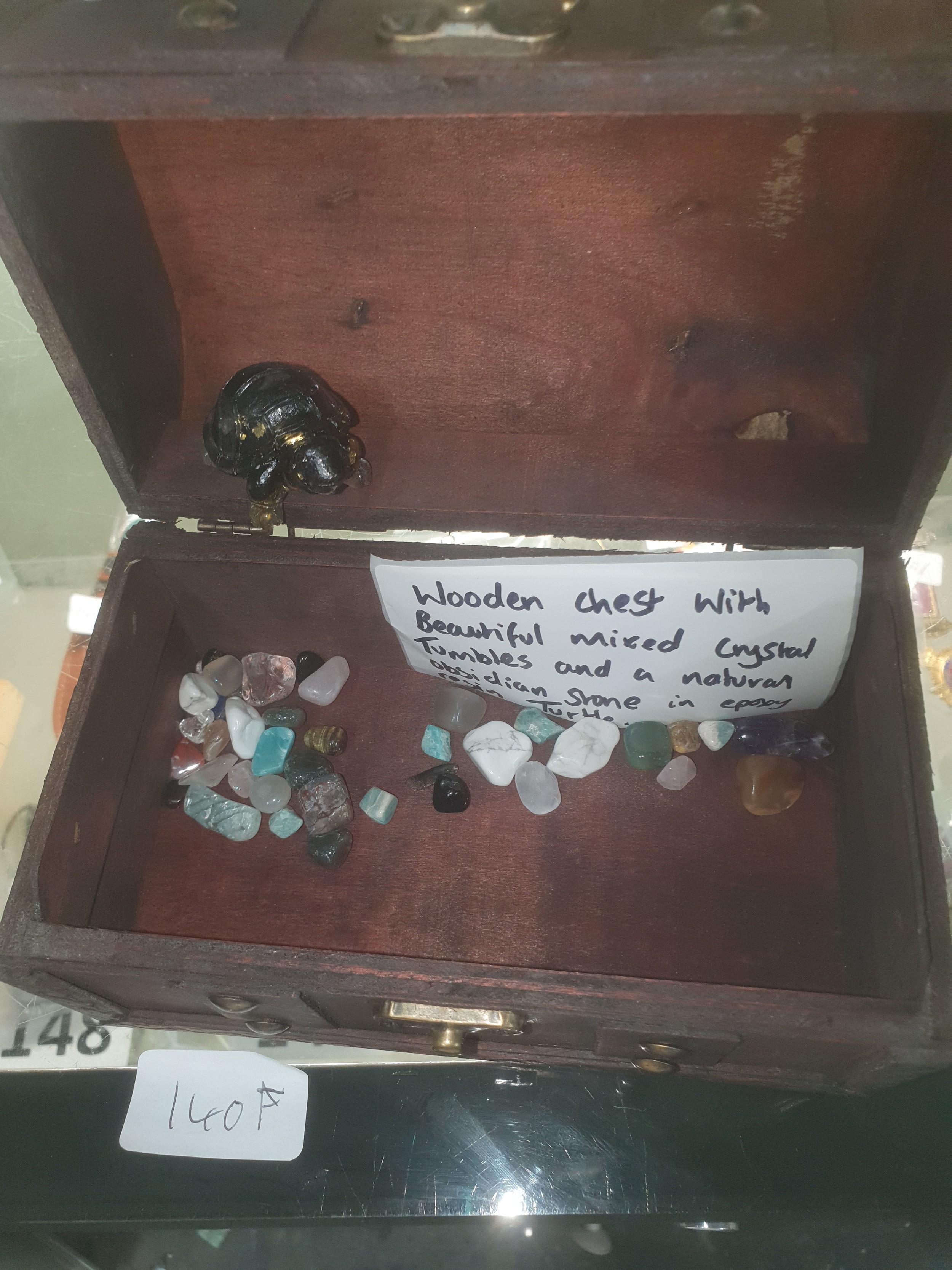 wooden chest with beautiful mixed crystal tumbles and a natural stone obsidian in epoxy resin turtle