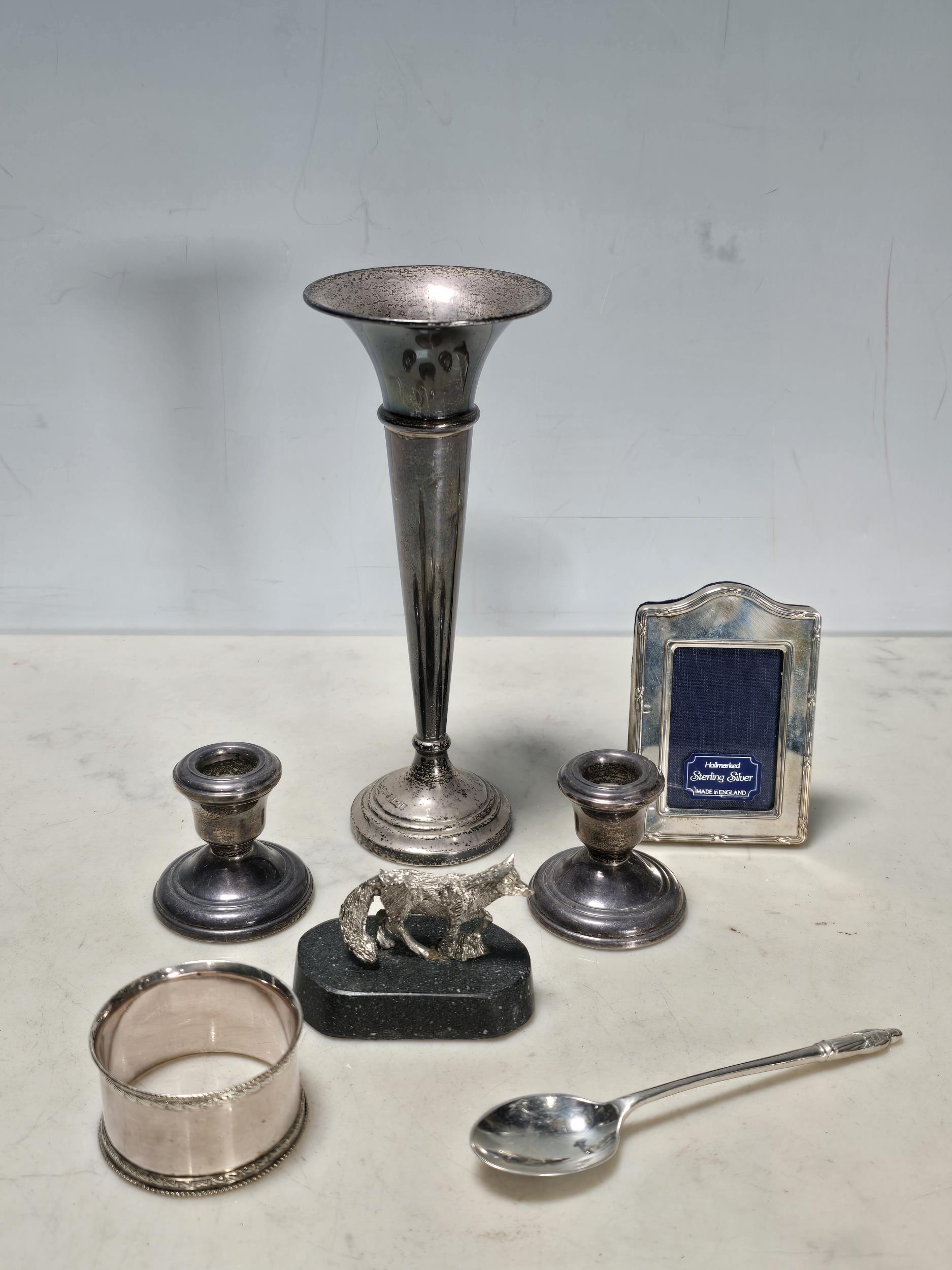 A small modern silver Photograph Frame, 3in, a silver trumpet shaped Vase, 6in H, a pair of silver miniature Candlesticks 1 3/4in H, a white metal Fox Paperweight, a plated Spoon and a plated Napkin Ring (Cab)