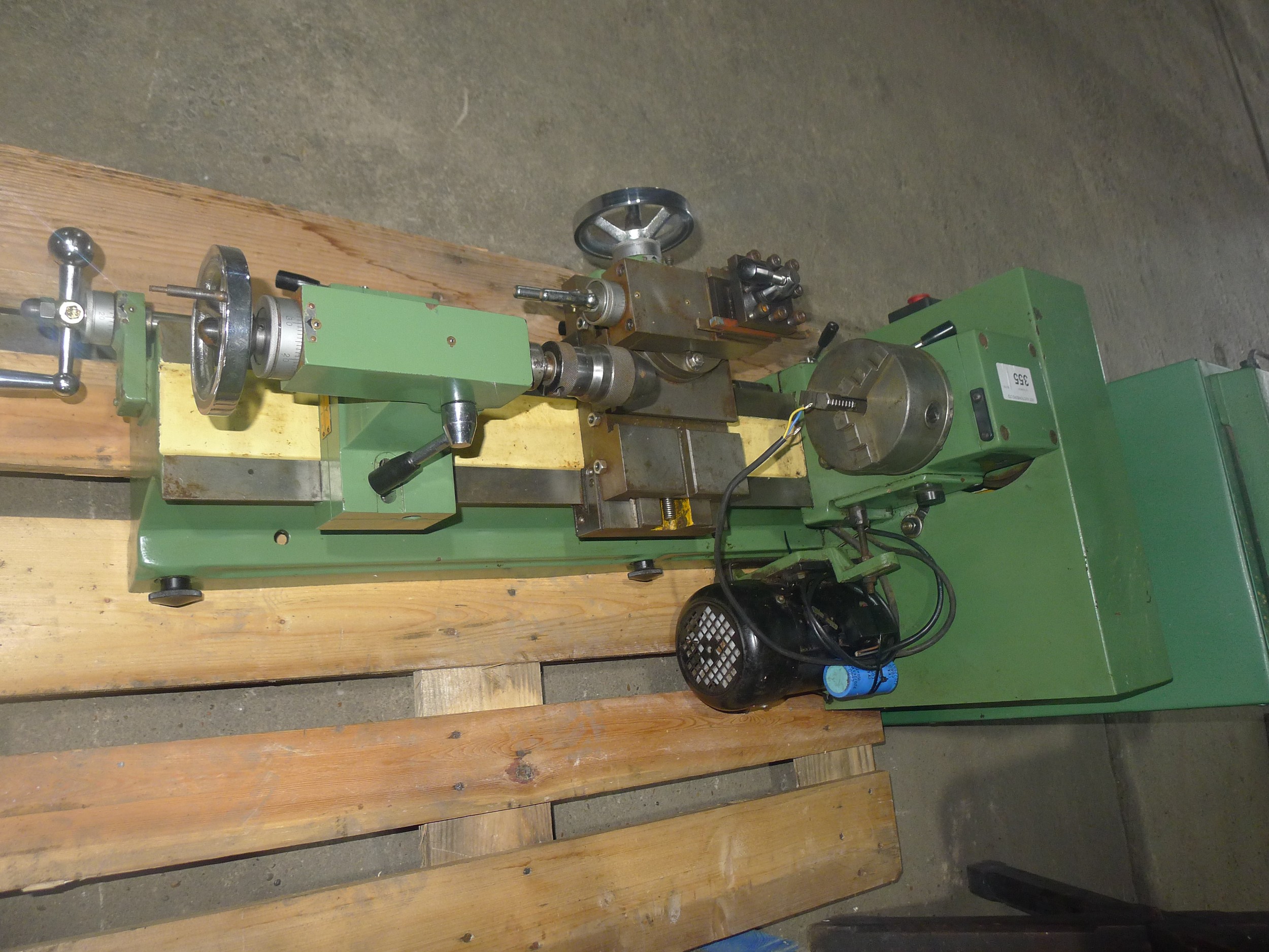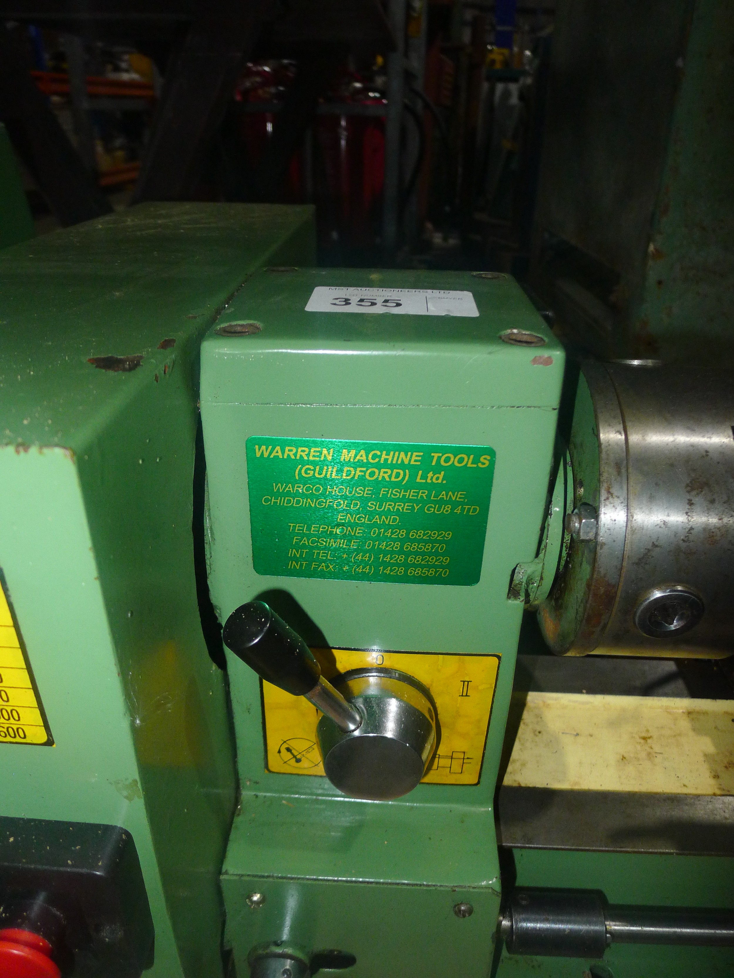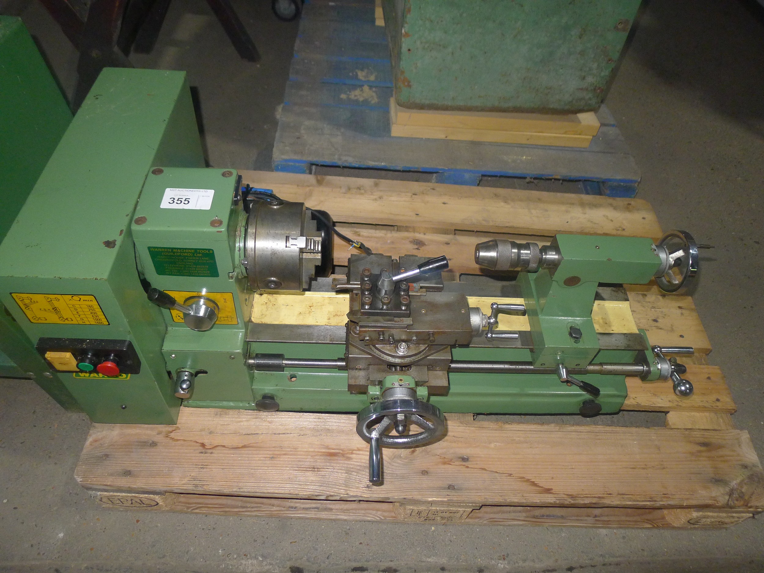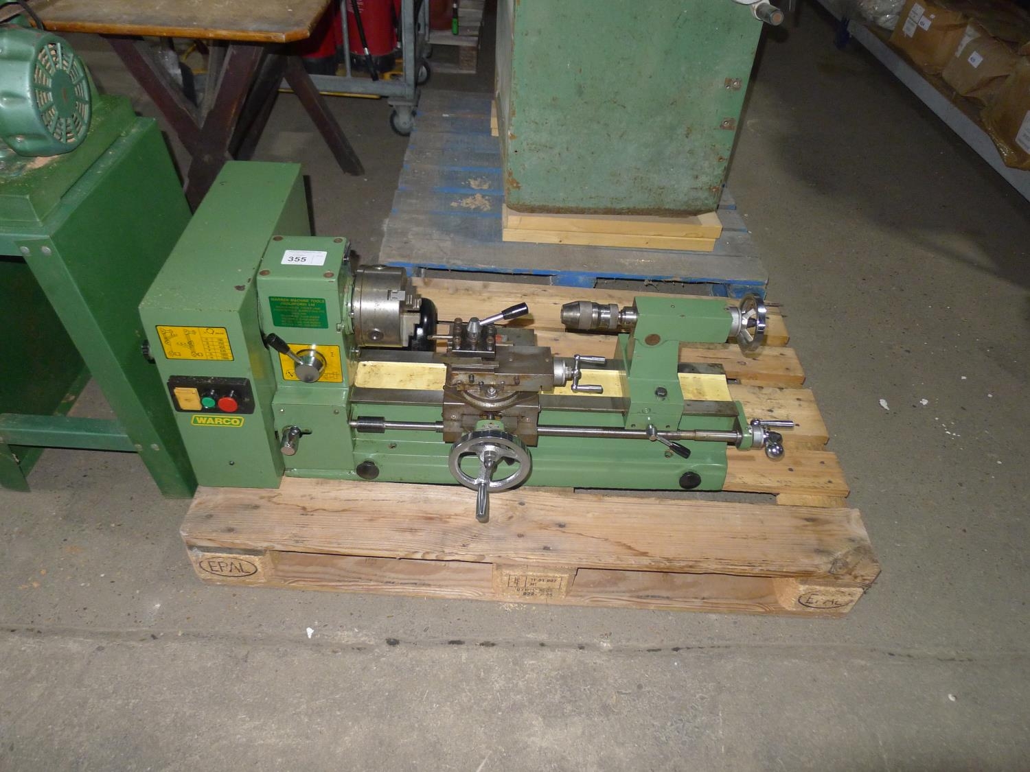 1 bench top metal turning lathe by Warco, no model visible, bed length approx 67cm, supplied with a 3 jaw chuck and a tool post, 240v. Please note that the electrics require attention