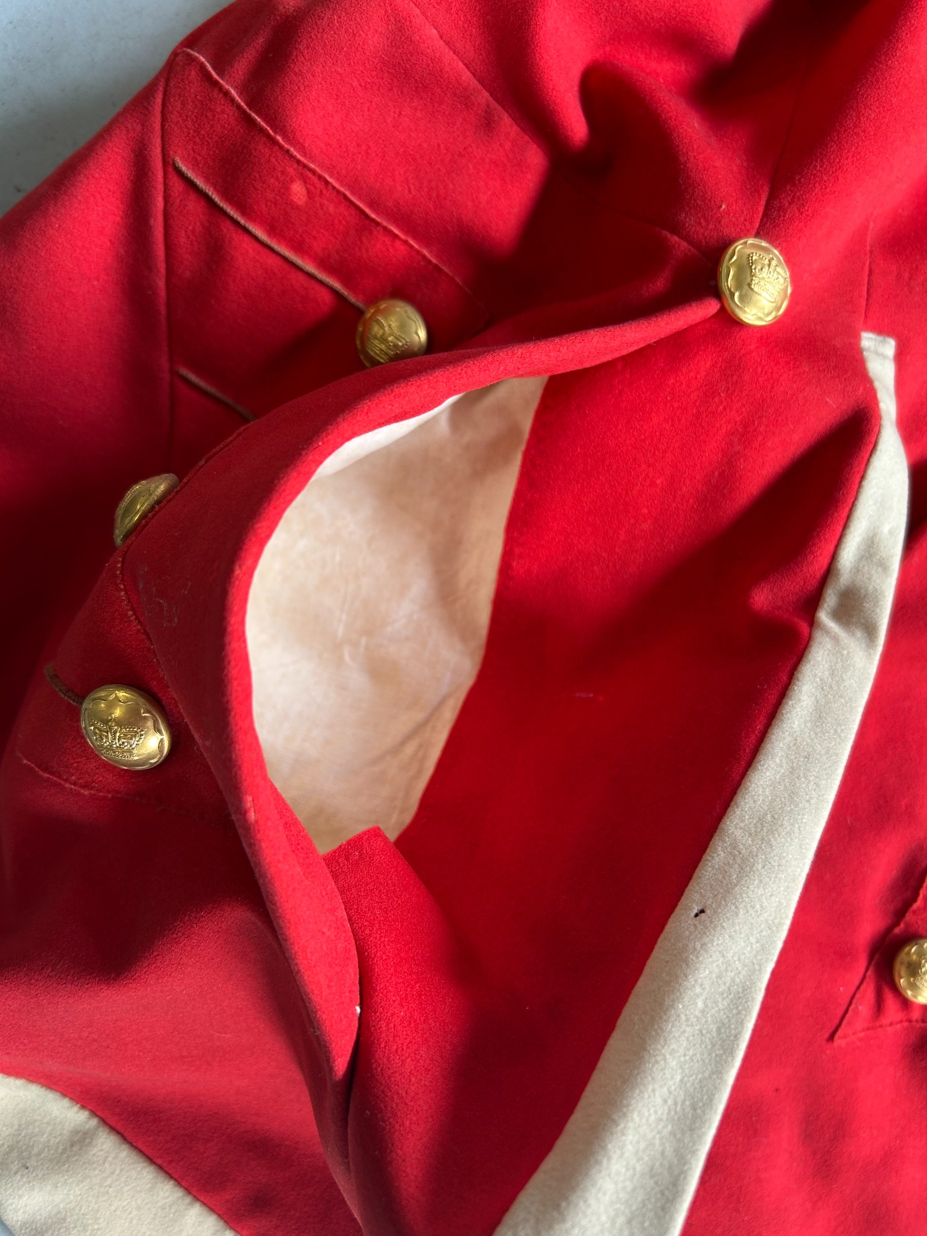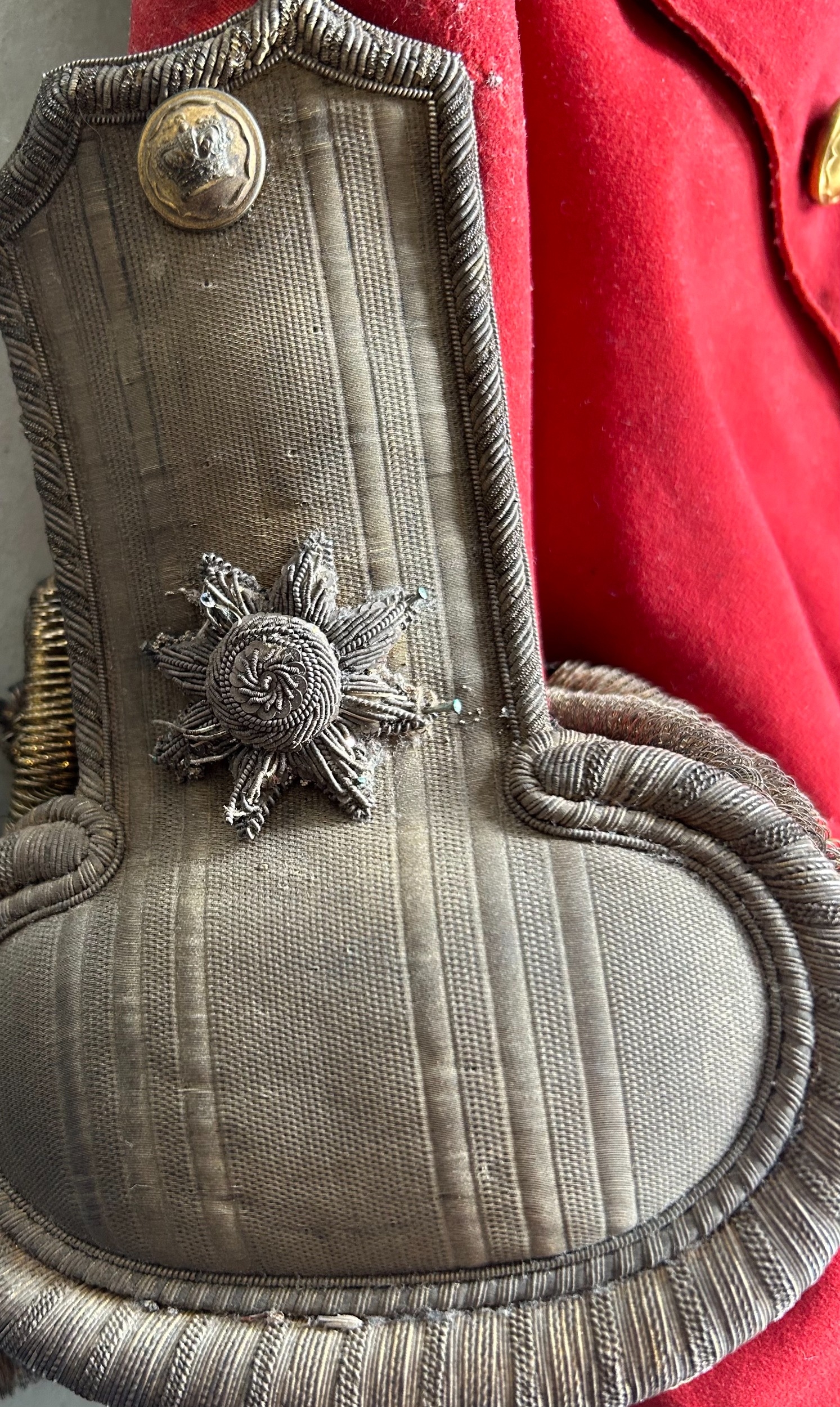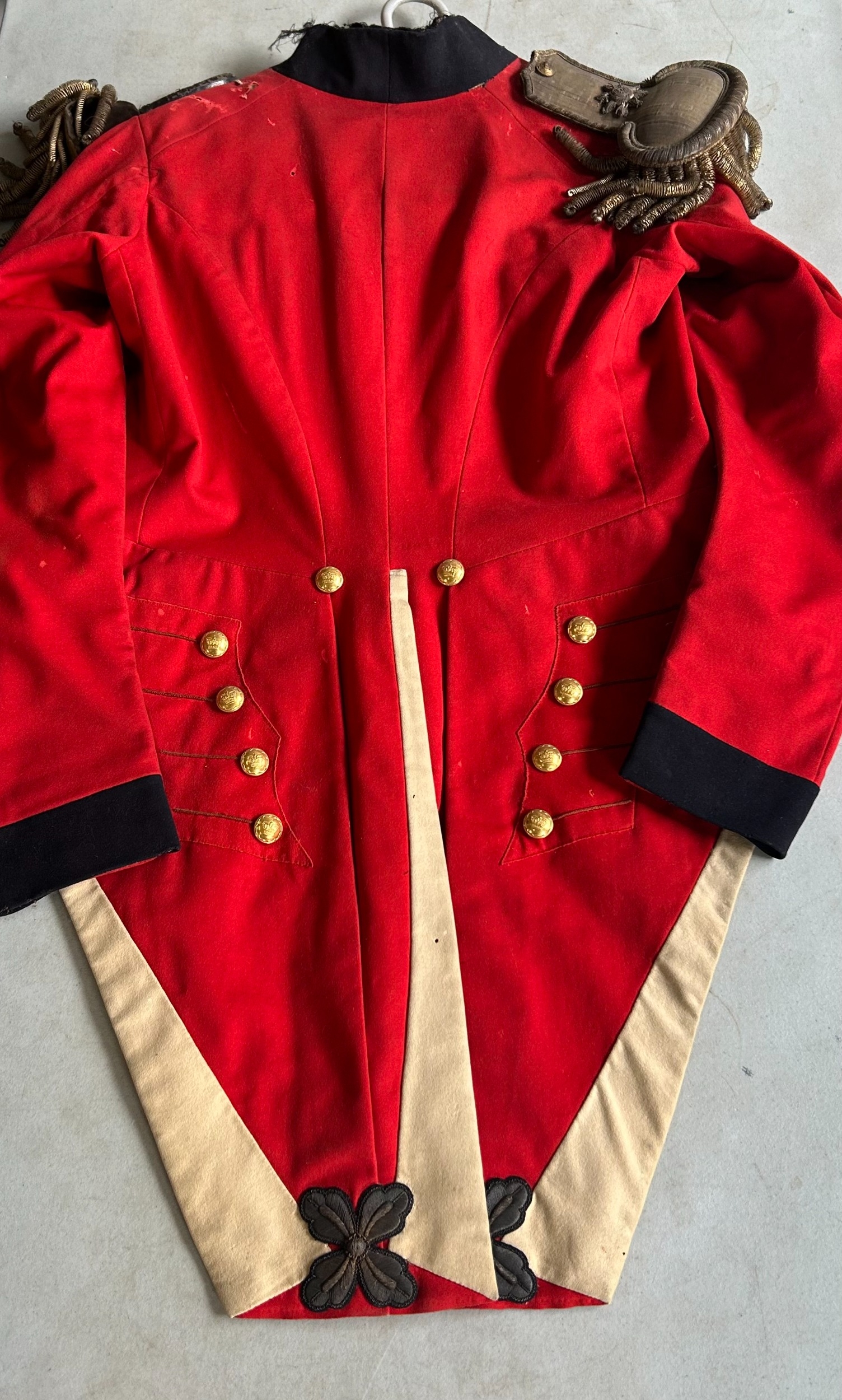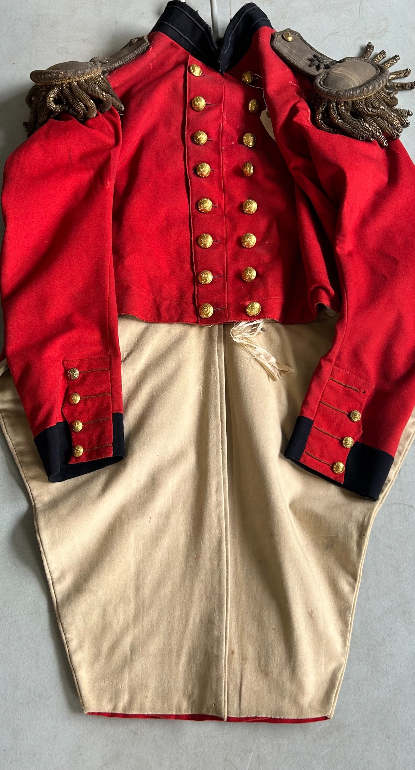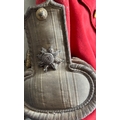 An 1822 pattern Major's Scarlet Coatee with silver bullion epaulettes and coat tail ornaments and gilt buttons, GC, one cuff button missing, slight moth, collar and lining worn.