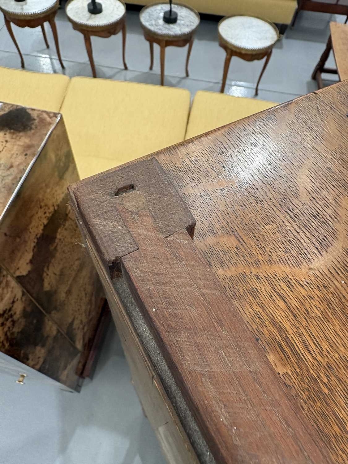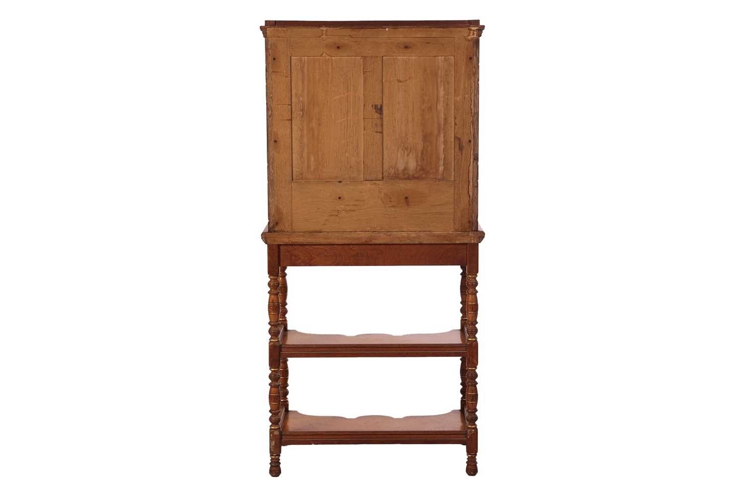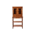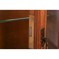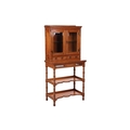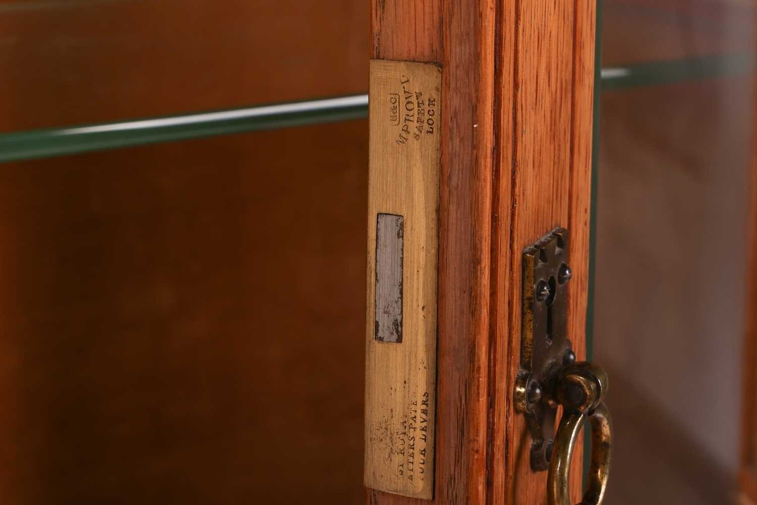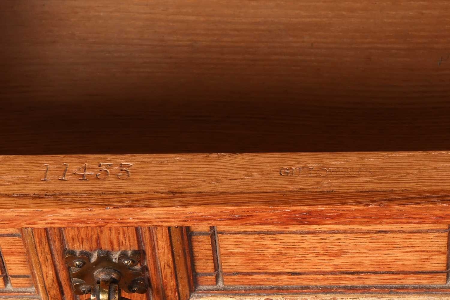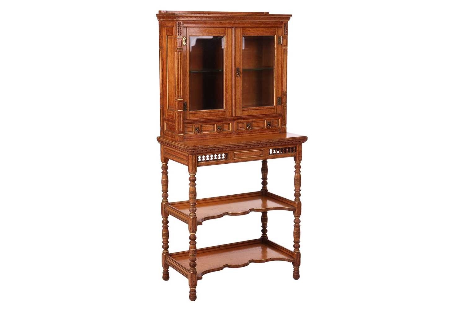 Gillow & Co: a Victorian Aesthetic Movement cabinet in light oak, possibly by Bruce Talbert, with bevelled glass doors over a pair of drawers above a base, with turned gallery and shaped shelves, painted gilt highlights and carved sunflower detail, stamped 'Gillow & Co' to the drawer, and numbered 11433, 168 cm high x 82 cm x 46 cm. Looks as though the rail on the top has been cut down (possibly from a galleried rail), see images. In good clean conditon, and structurally sound.