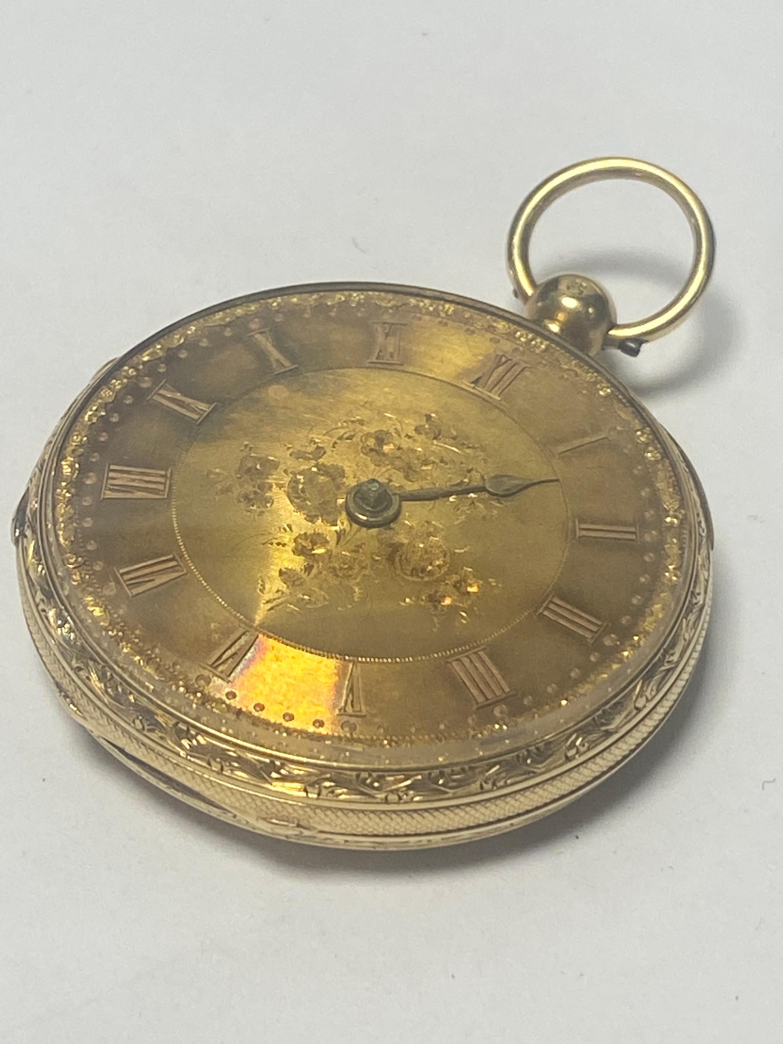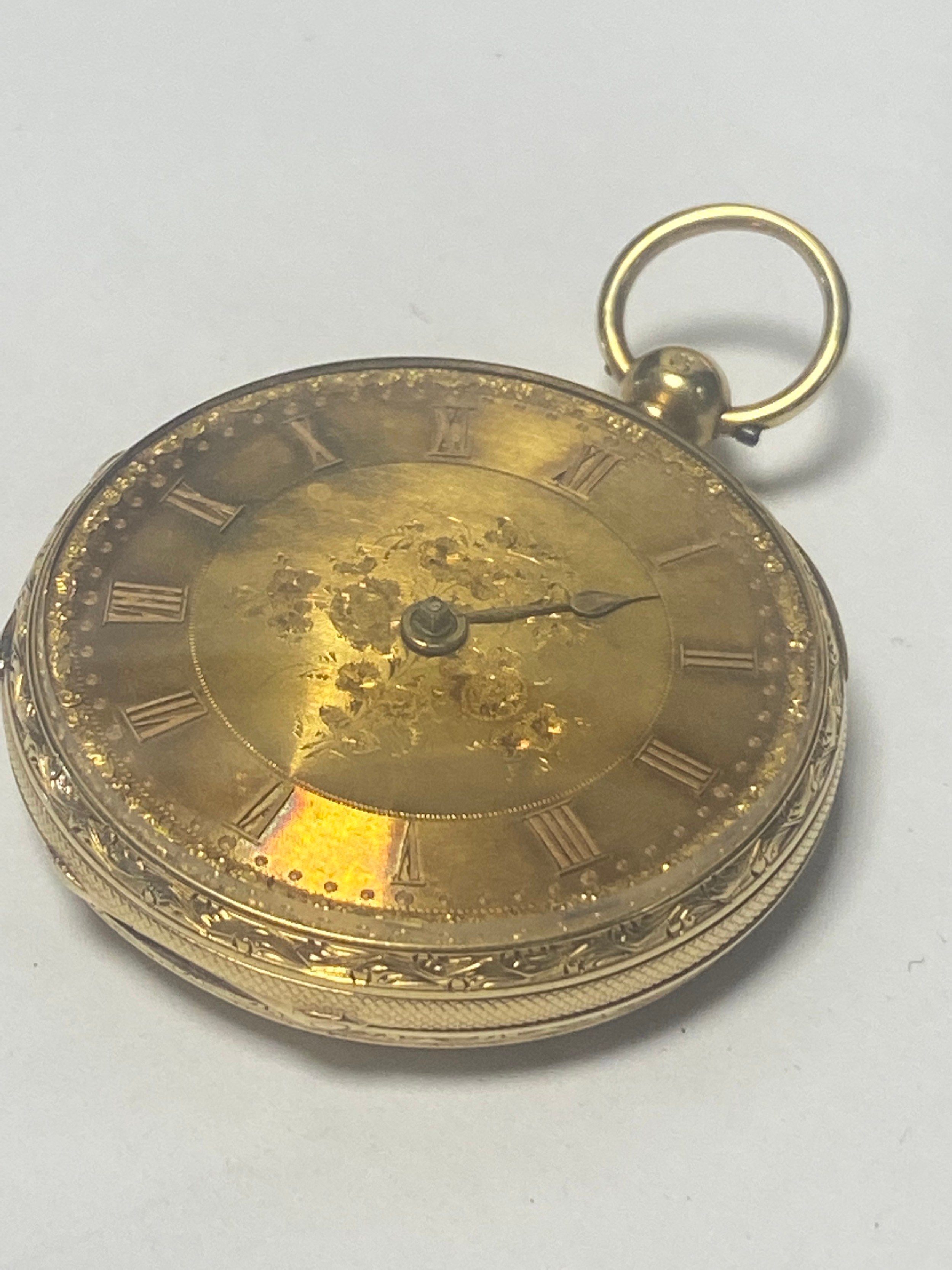 An 18ct gold open face pocket watch, the case hallmarked for 1851, the face engraved with floral decoration and with Roman markers -