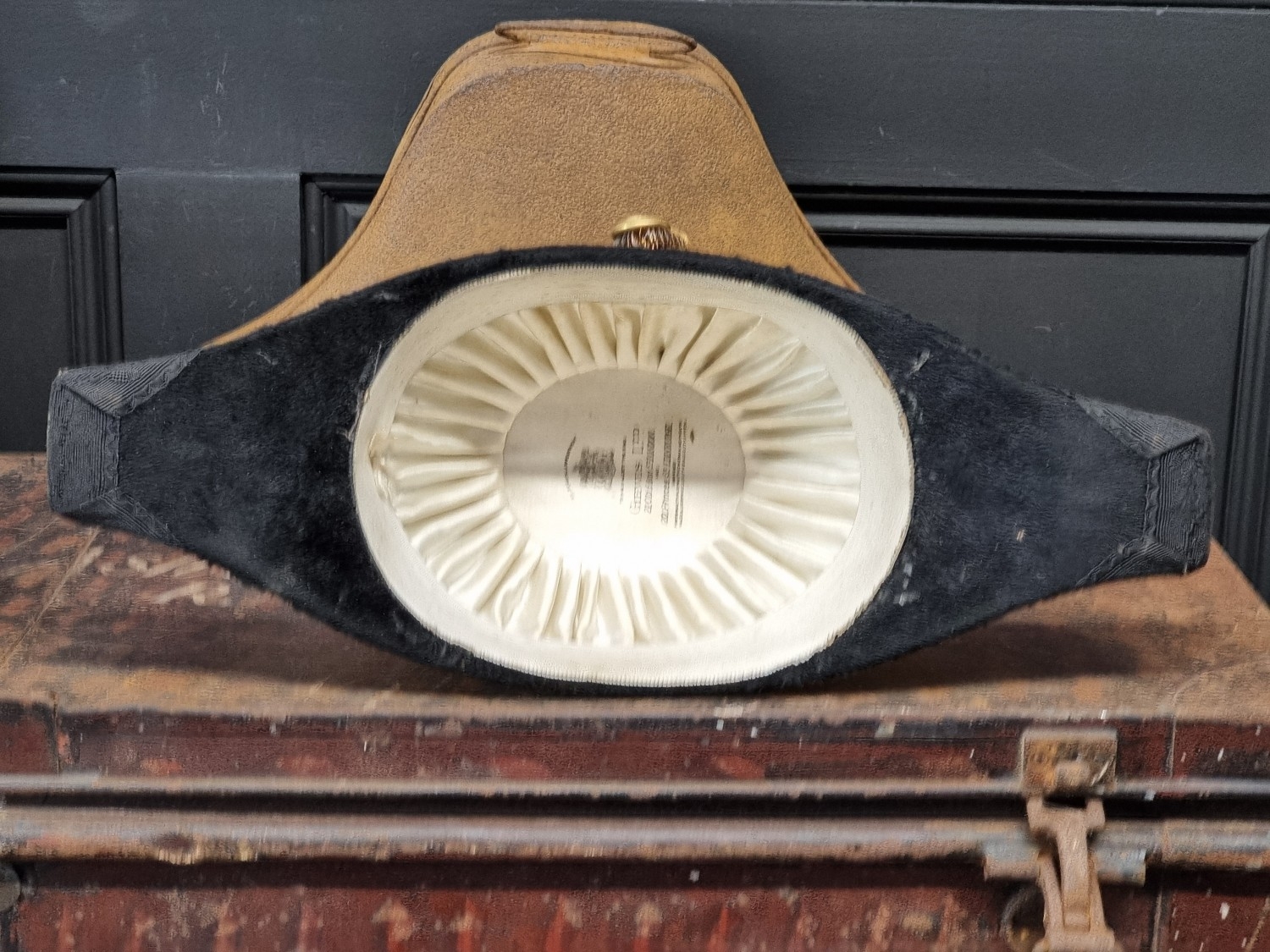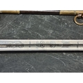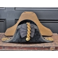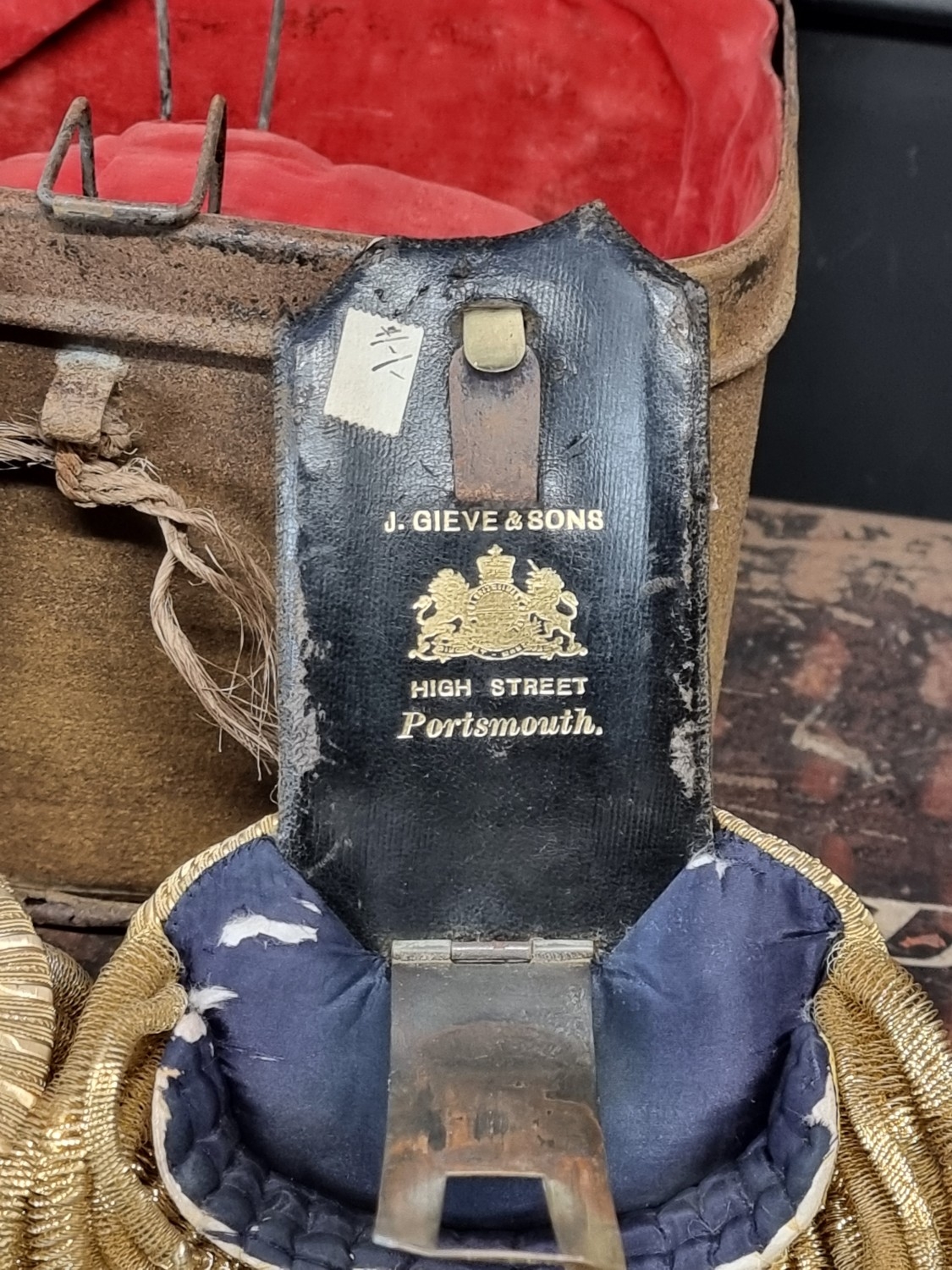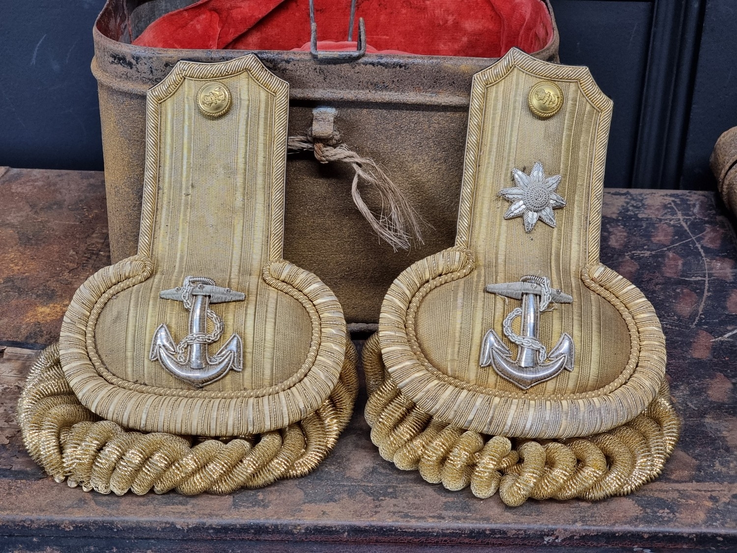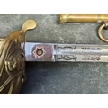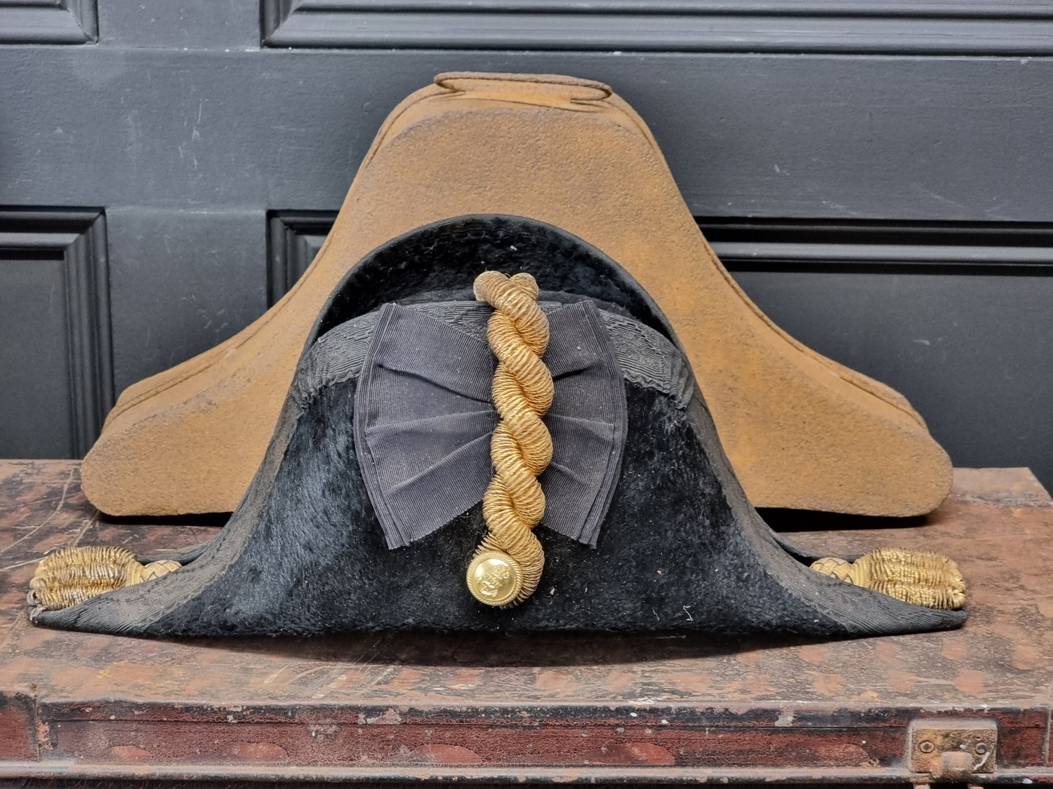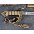 An interesting group of Royal Naval officers items, comprising: a George V 1846 pattern sword, a cased bicorn hat and epaulettes; steel uniform trunk; three WWII medals; and petrol lighter.