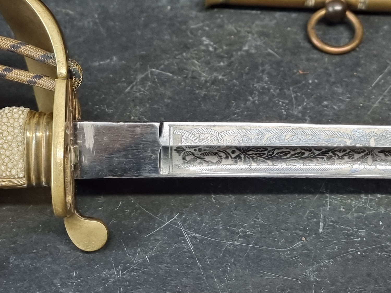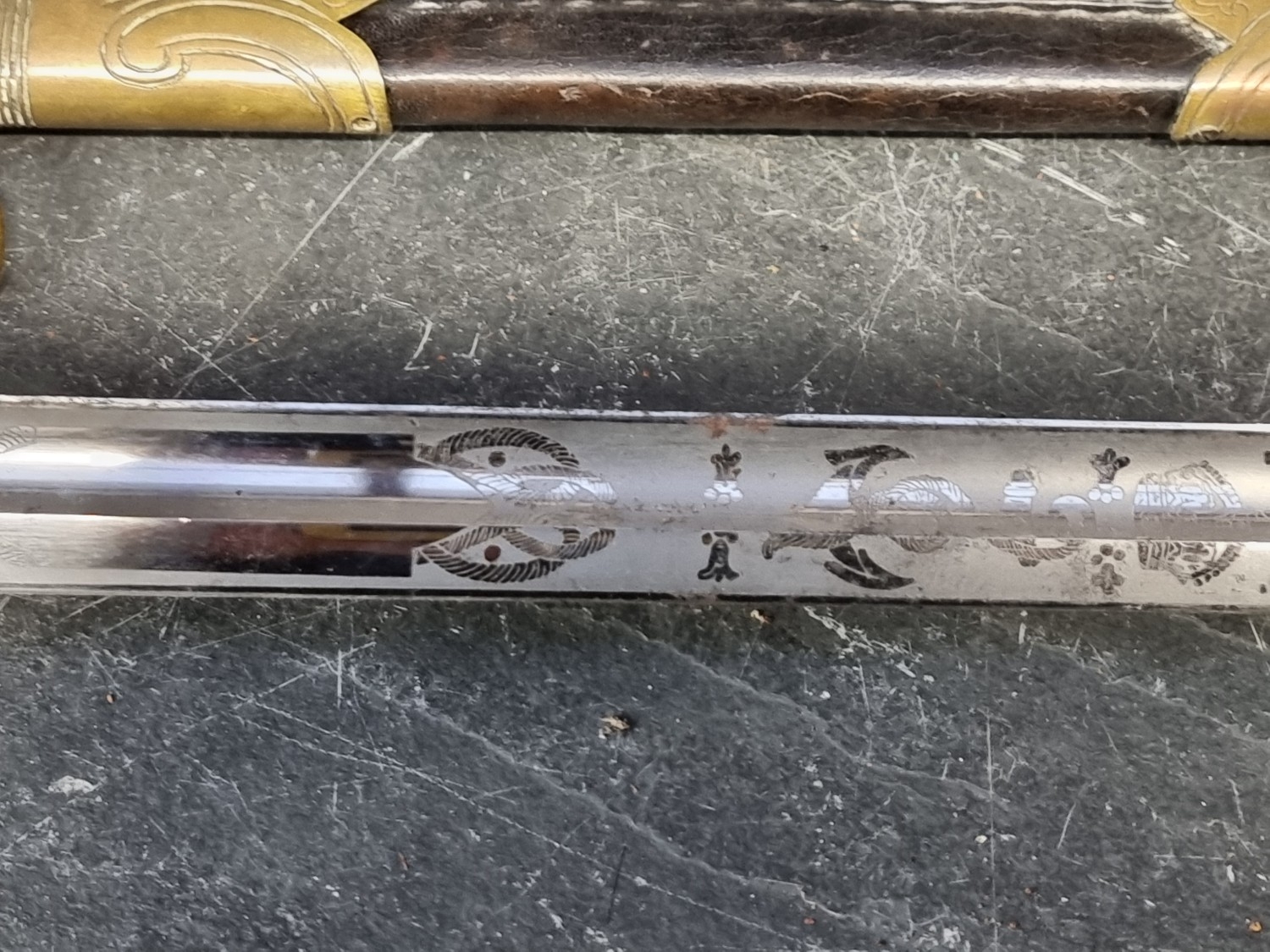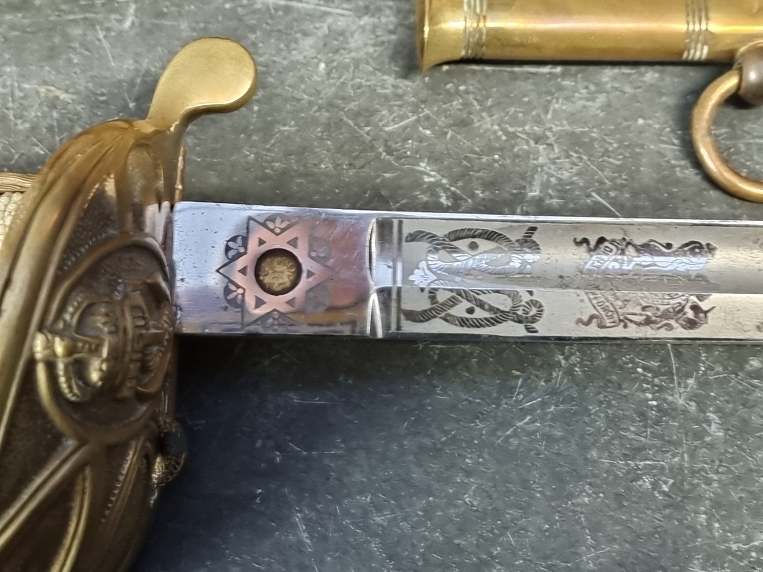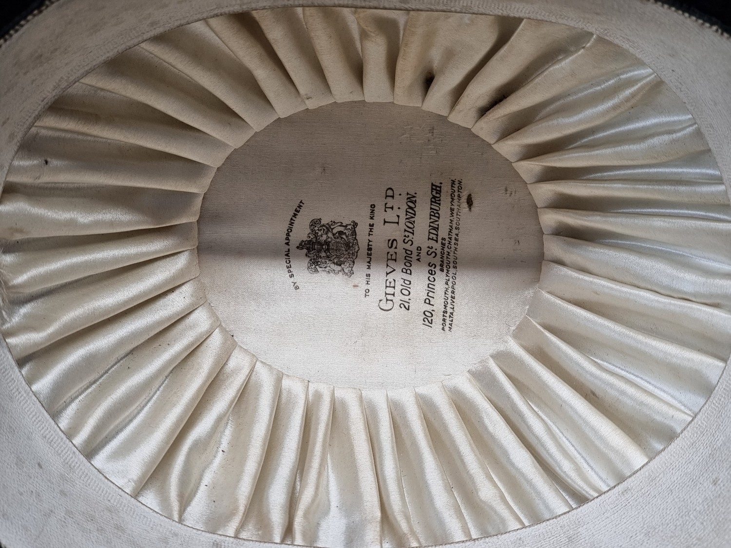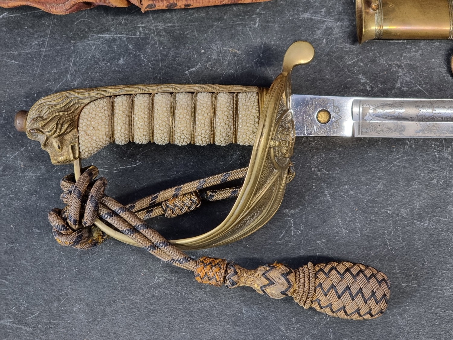 An interesting group of Royal Naval officers items, comprising: a George V 1846 pattern sword, a cased bicorn hat and epaulettes; steel uniform trunk; three WWII medals; and petrol lighter.