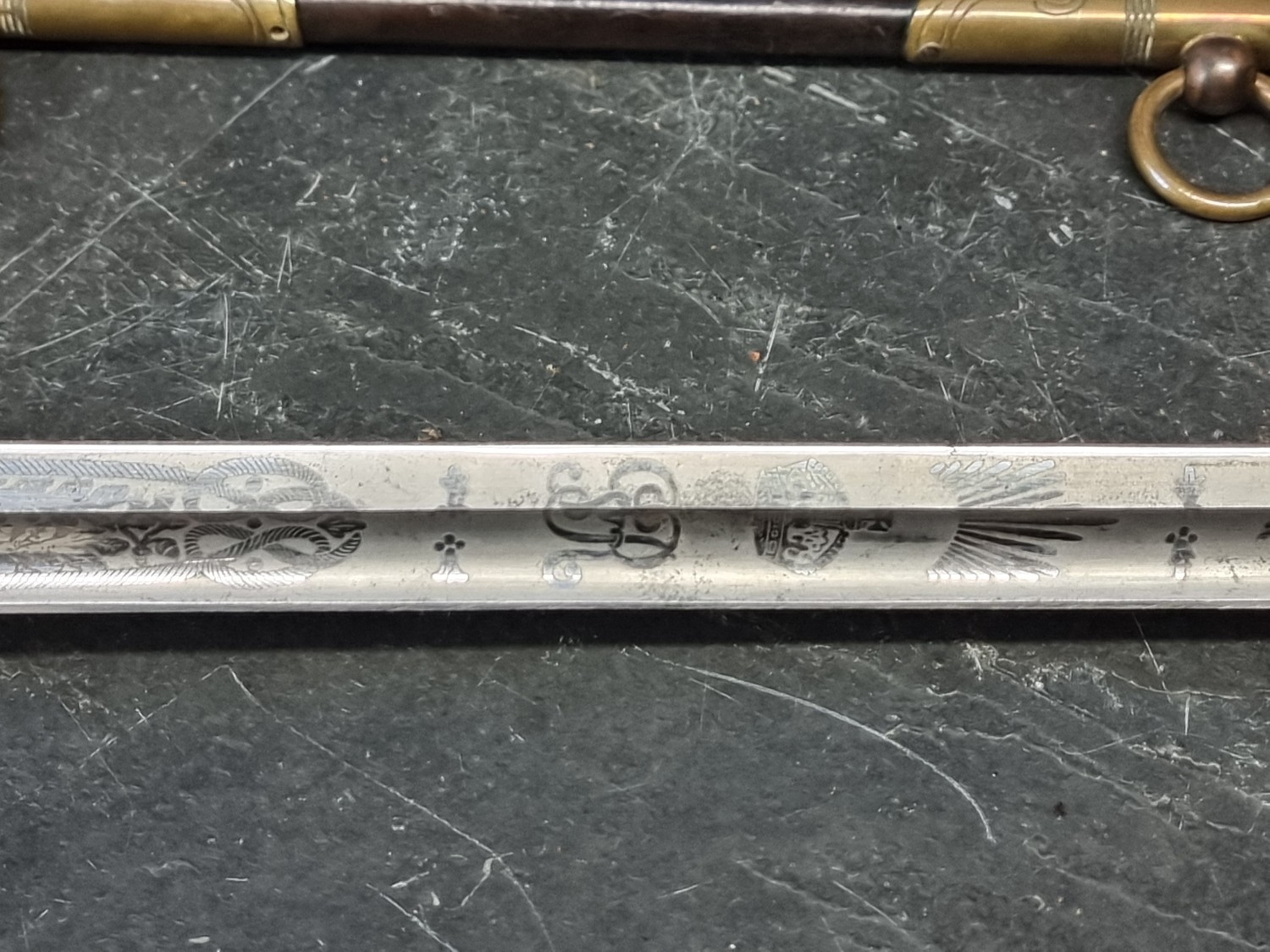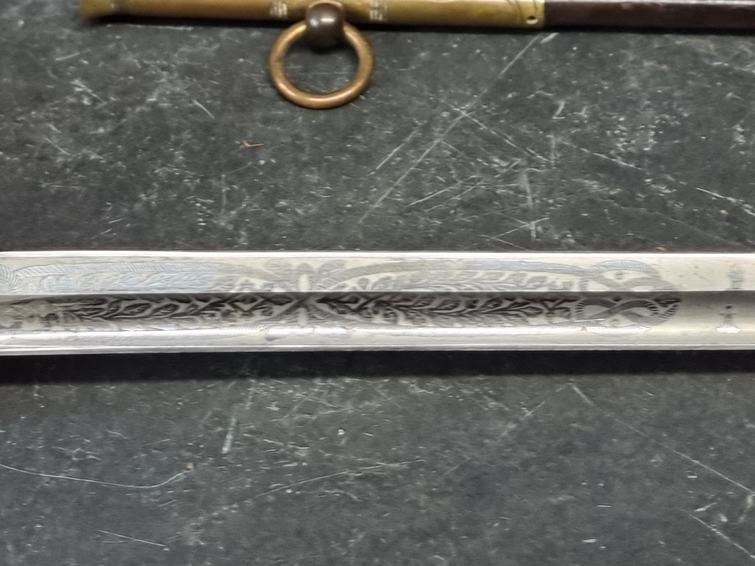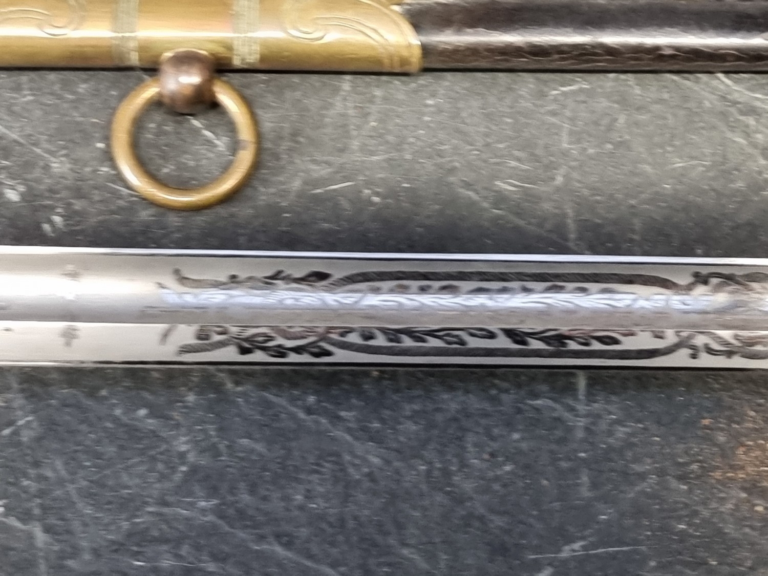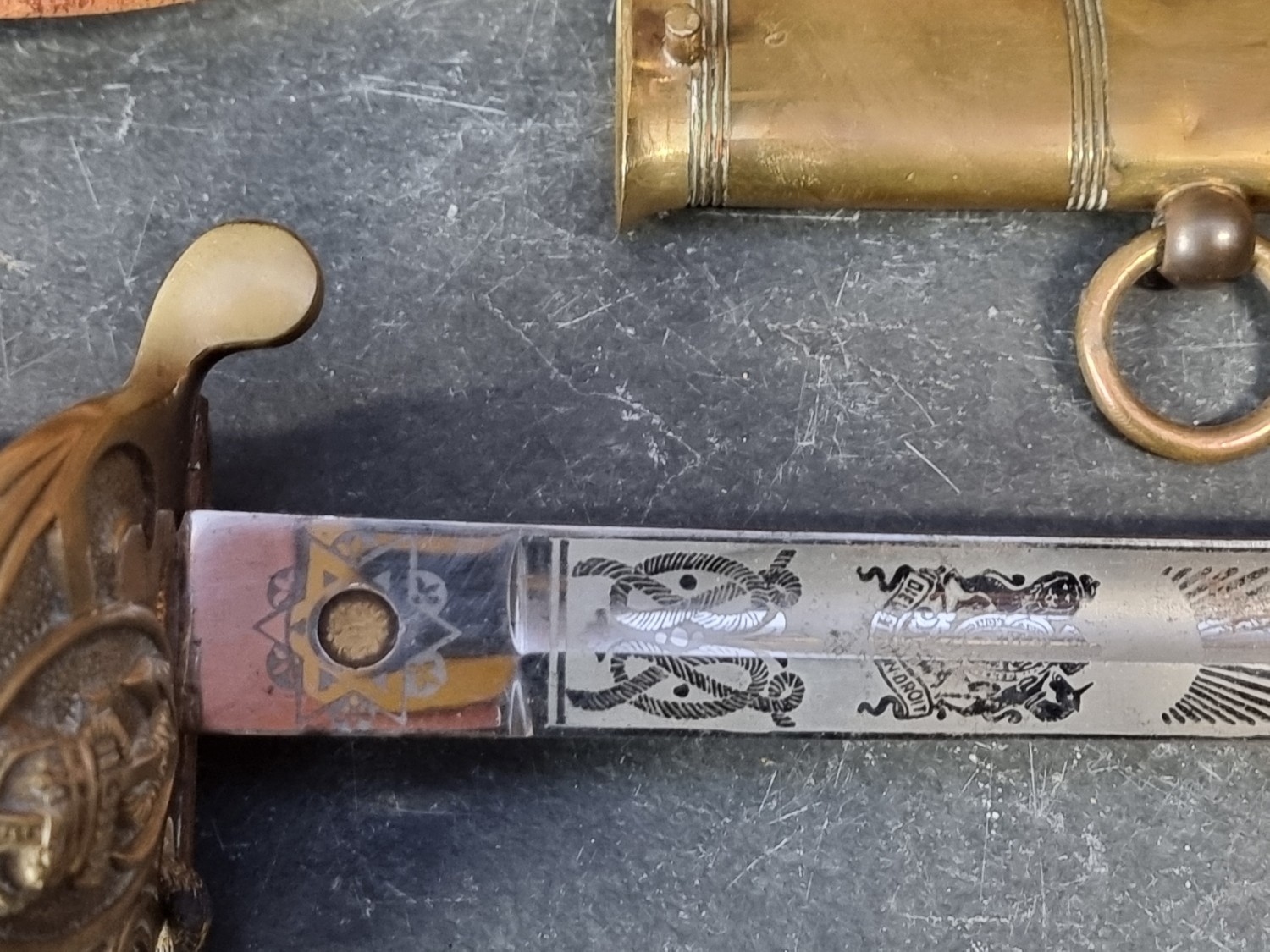 An interesting group of Royal Naval officers items, comprising: a George V 1846 pattern sword, a cased bicorn hat and epaulettes; steel uniform trunk; three WWII medals; and petrol lighter.