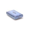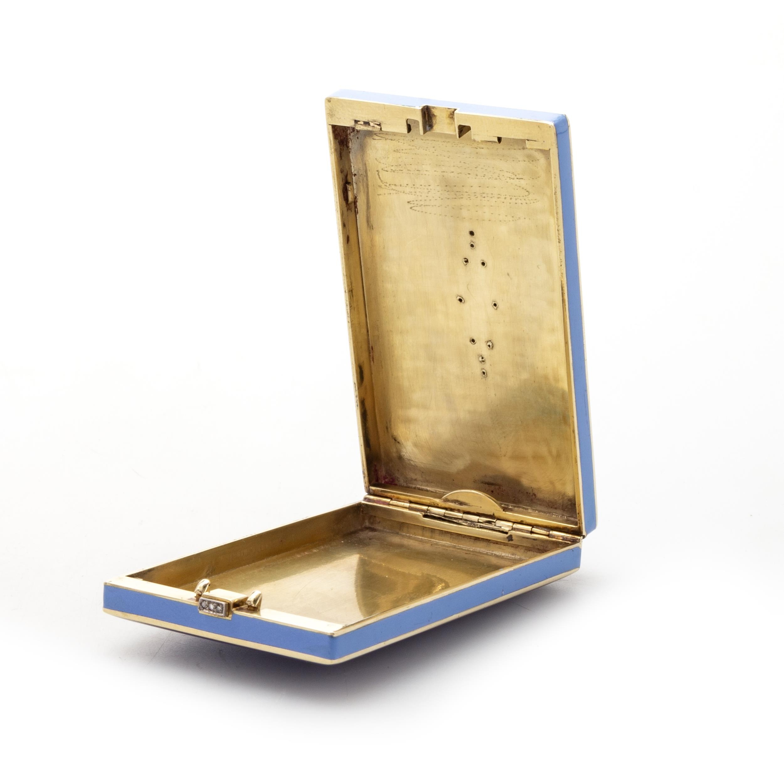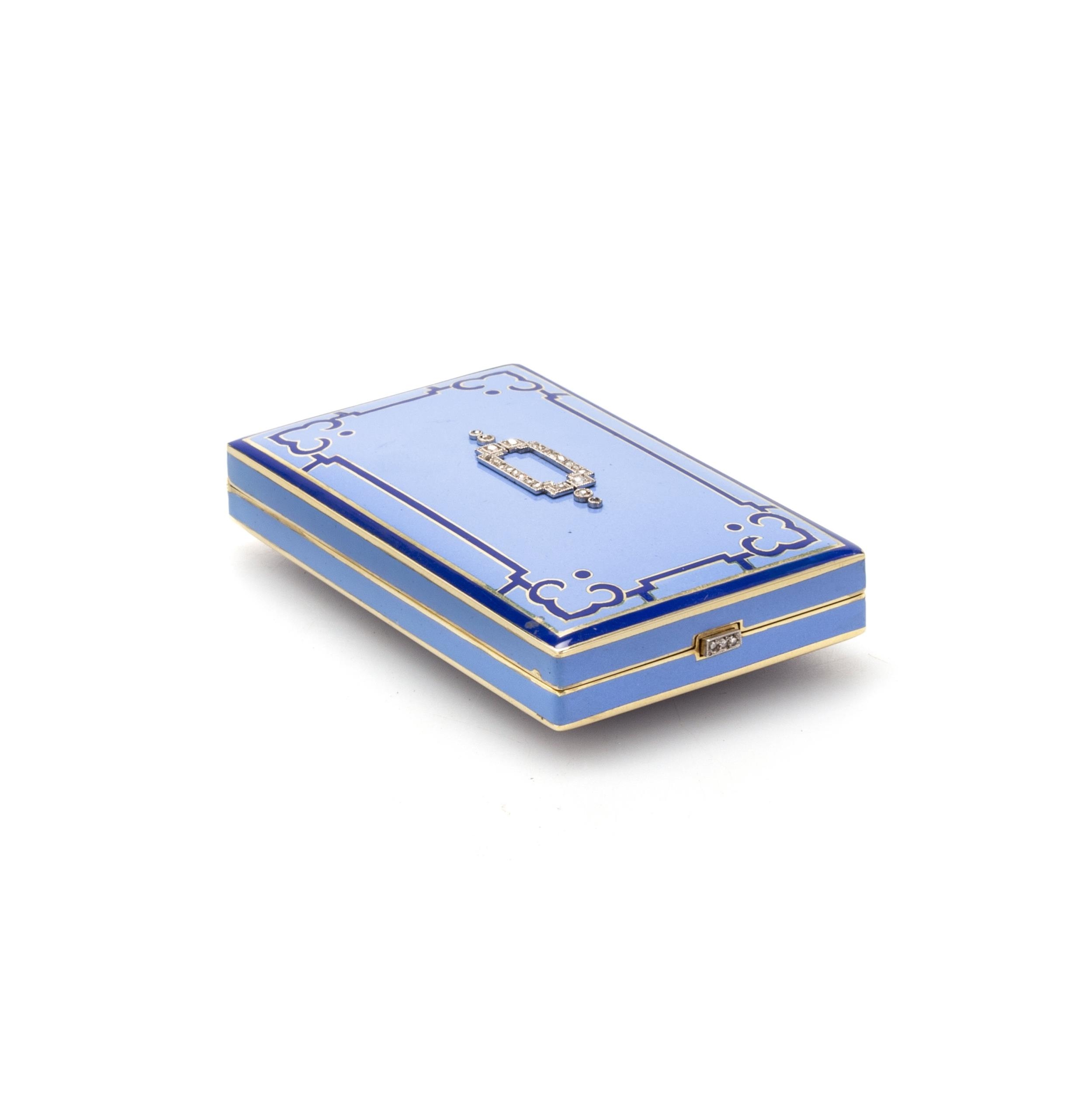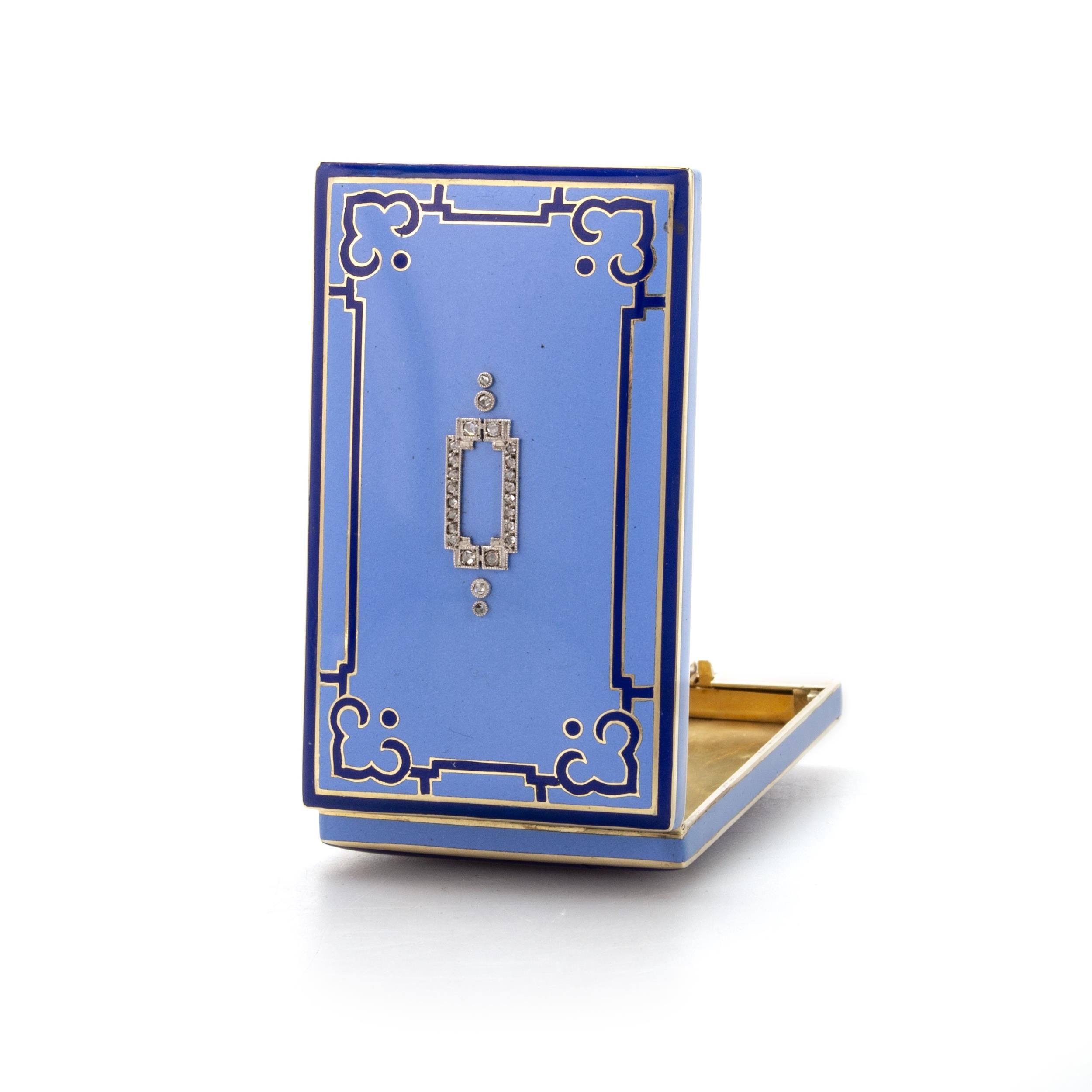 unmarked yellow metal, the hinged cover set with rose cut diamonds in platinum in a geometric design, on a pale blue enamel ground, with dark Moorish style border, diamond set push-button thumbpiece, opening to reveal a plain interior. 6.5cm by 4cm, 78.2 grams gross