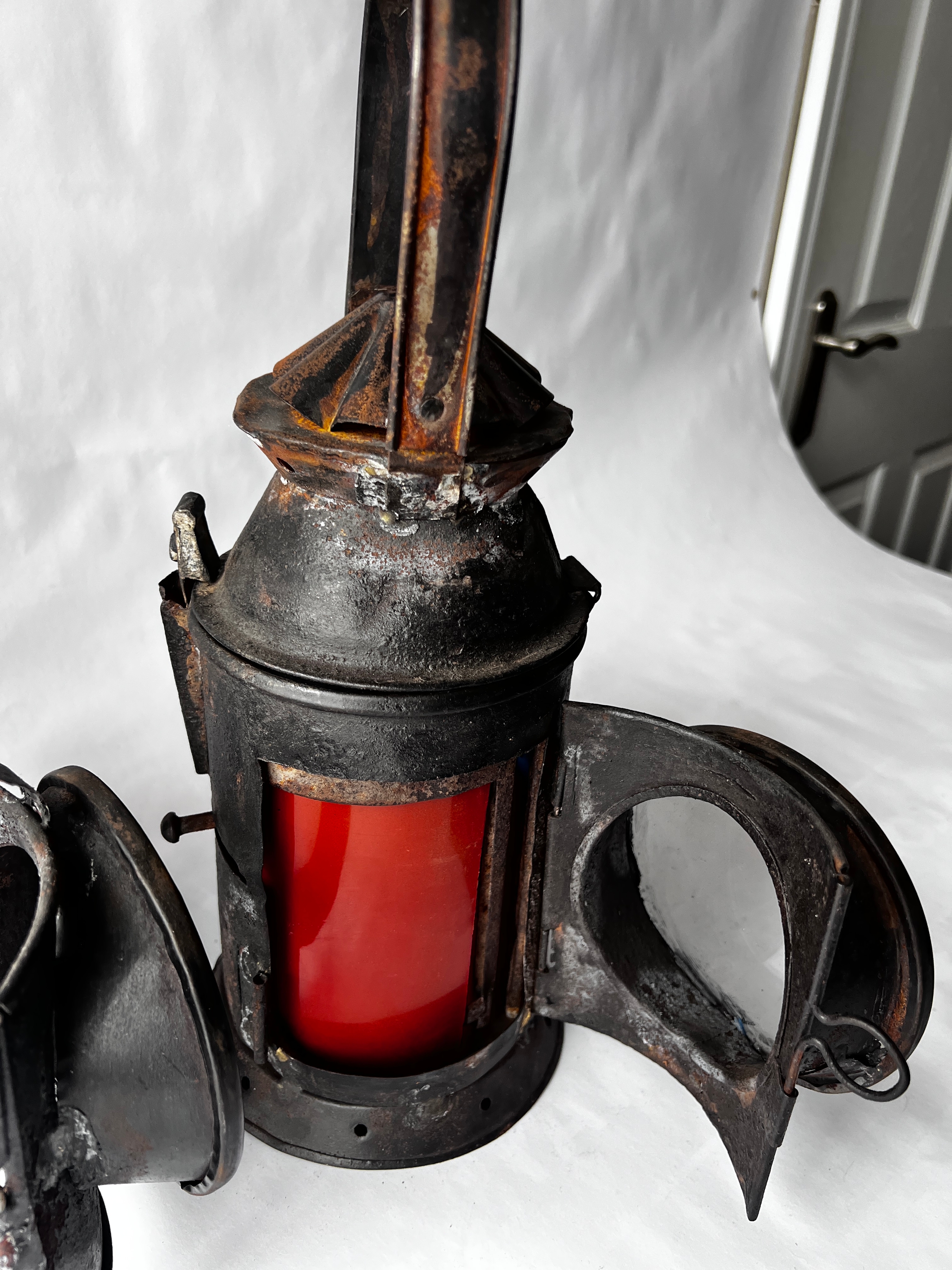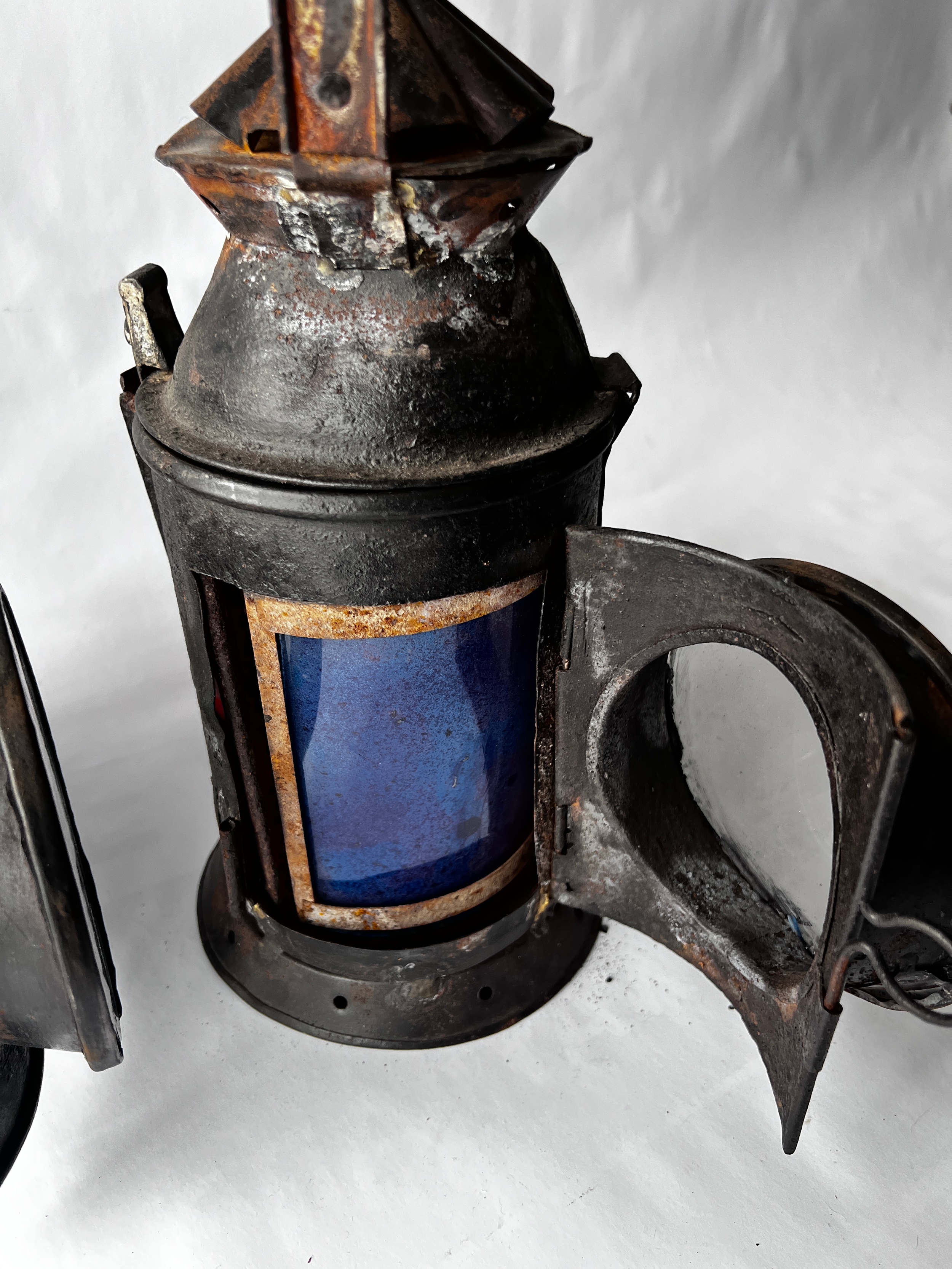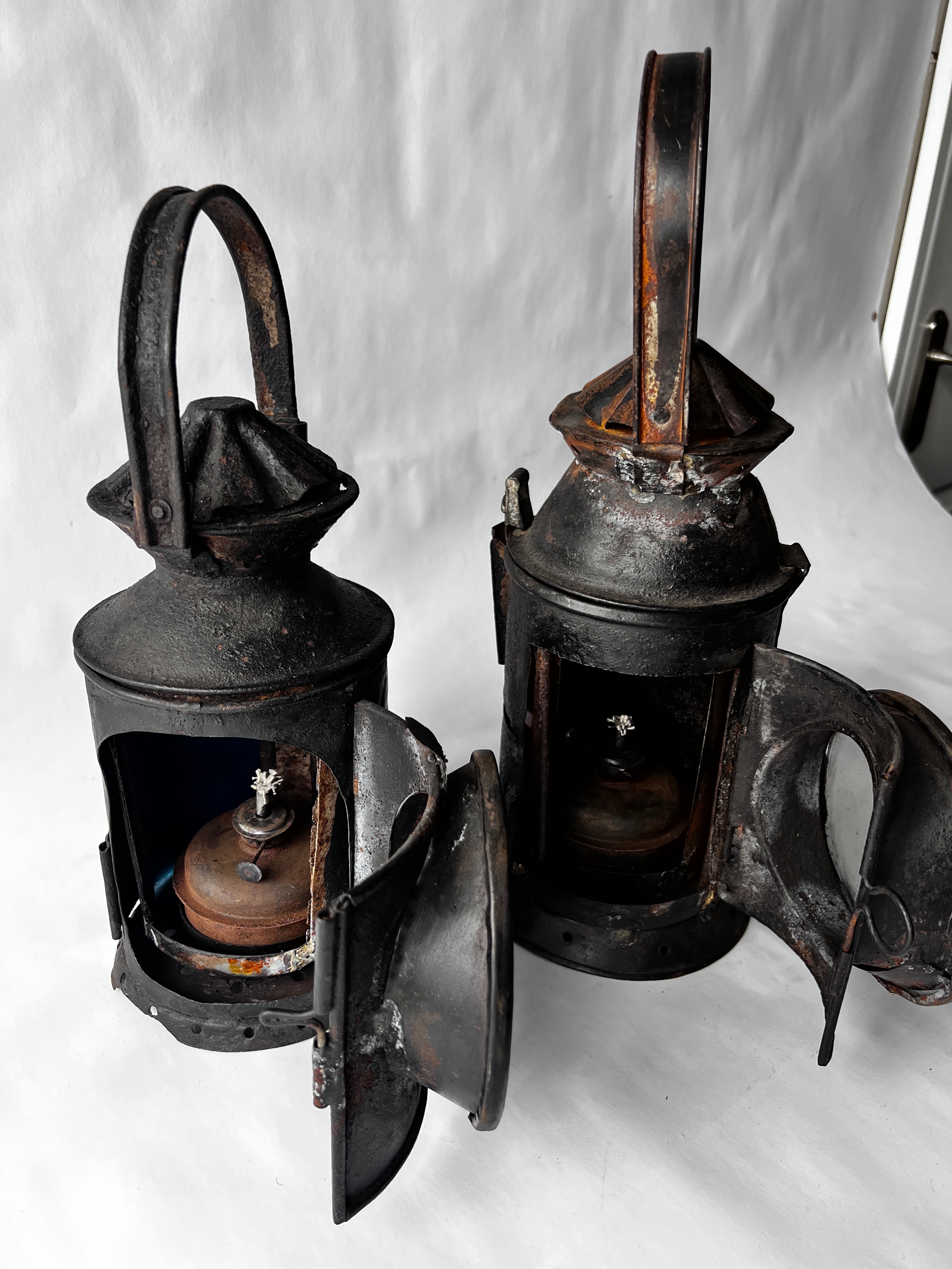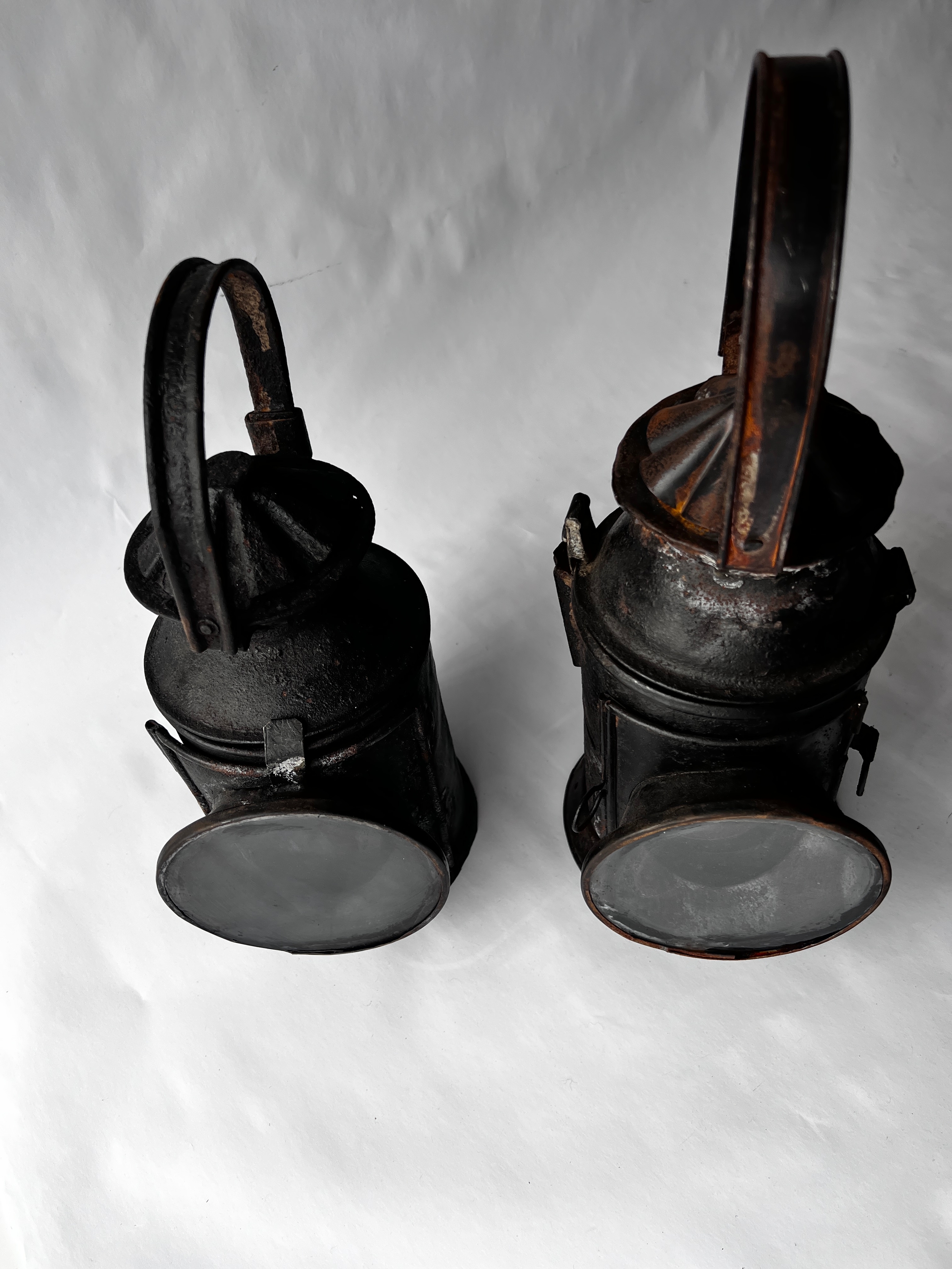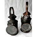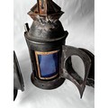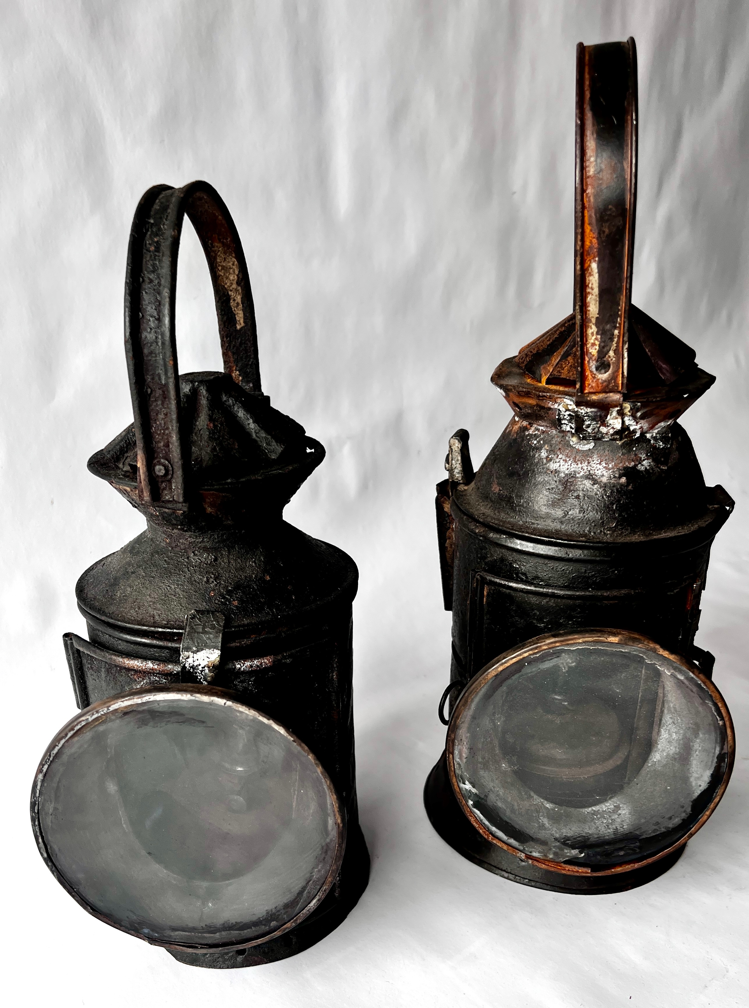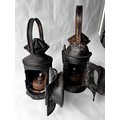 Two vintage Indian Railway Signal Lamps complete with internal lenses and oil burners.