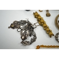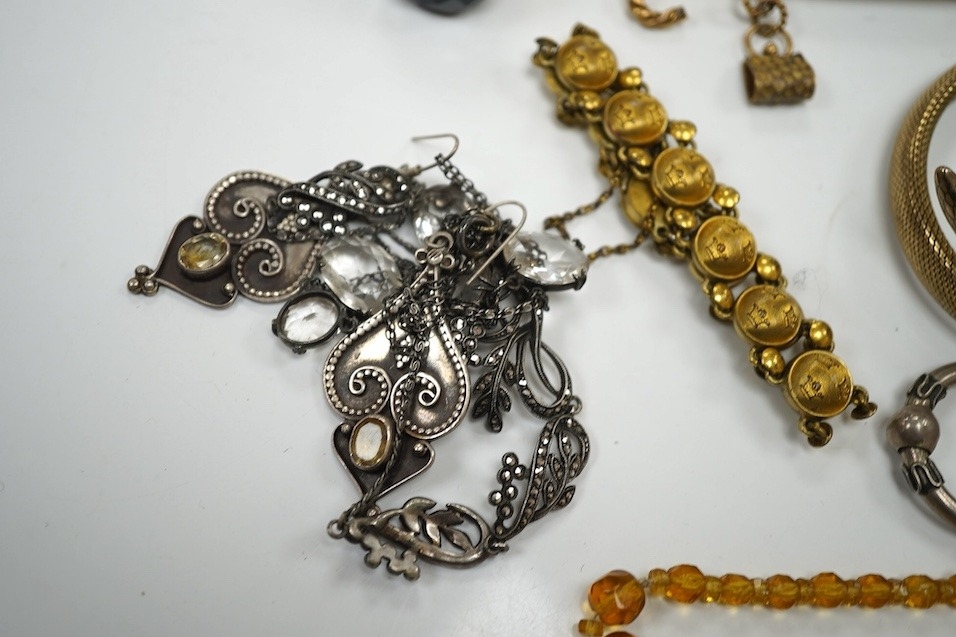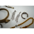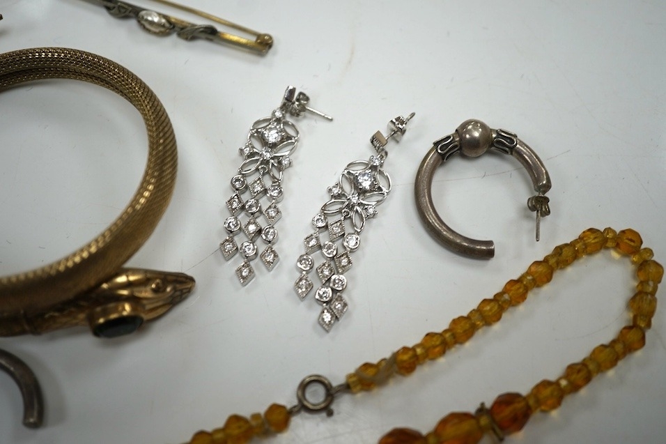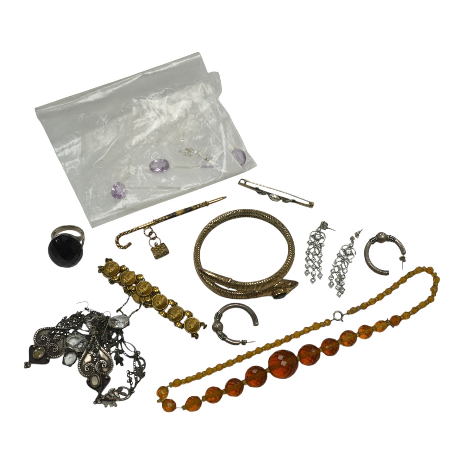 A small quantity of small loose diamonds, five loose round cut amethysts, a small group og white metal, 925 and costume jewellery including a serpent bangle.