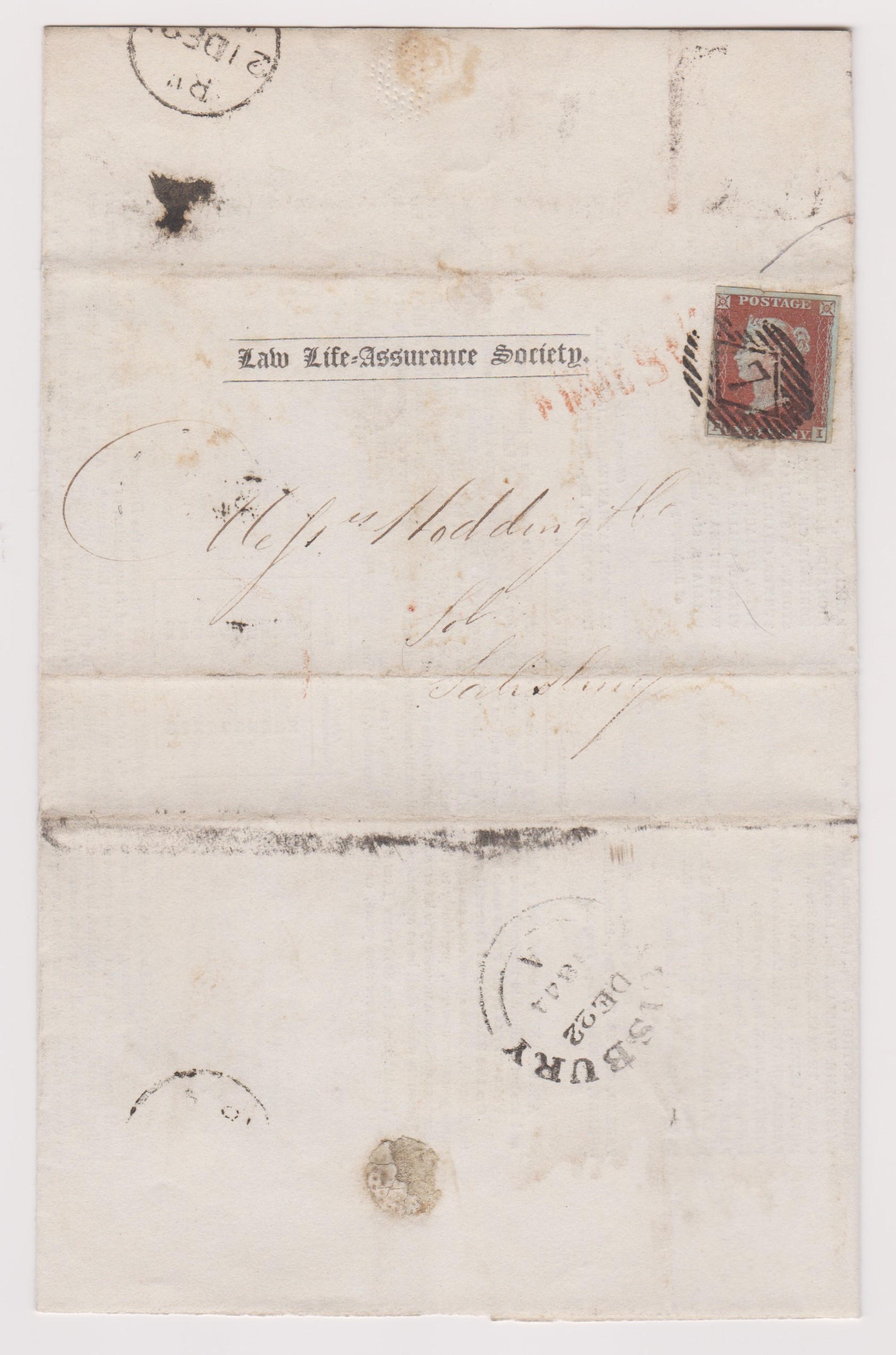 Great Britain 1844-Low Life-Assurance Society document posted to Salisbury SG8-1d cancelled with oval numeral strike-Salisbury Dec 22 1844 cancel