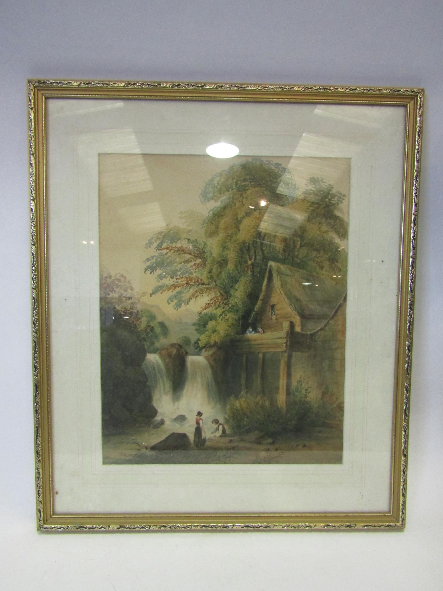 A gilt-framed watercolour depicting a waterfall, unsigned, 40cm x 32cm image size