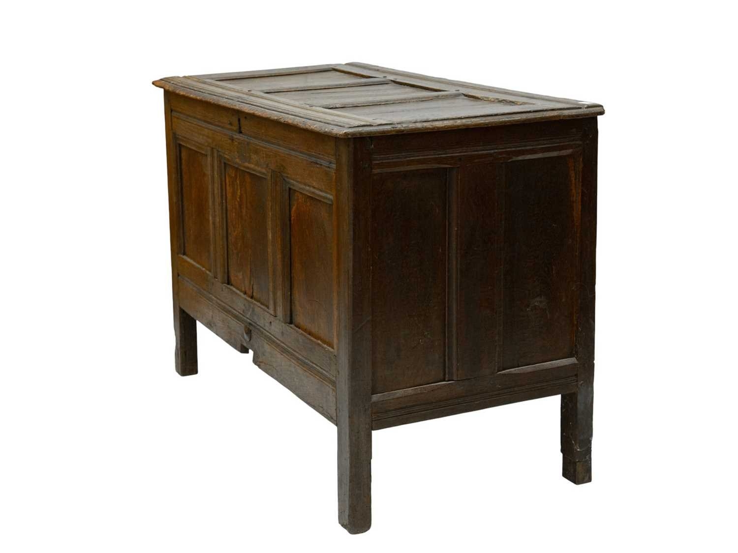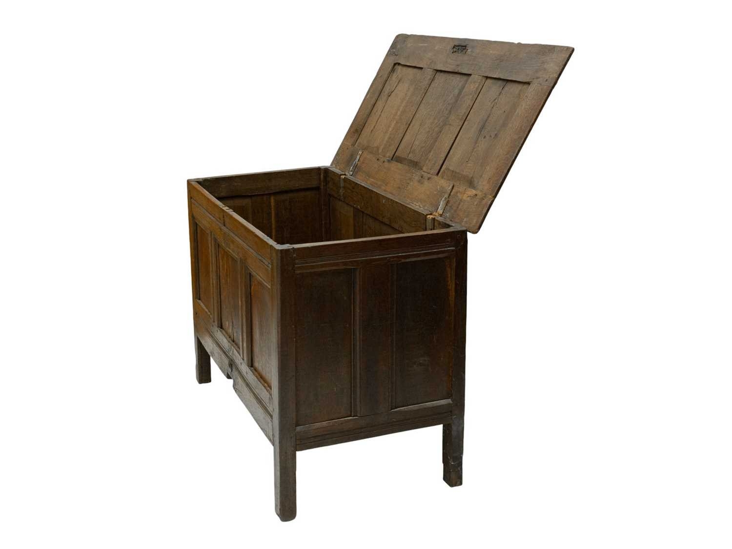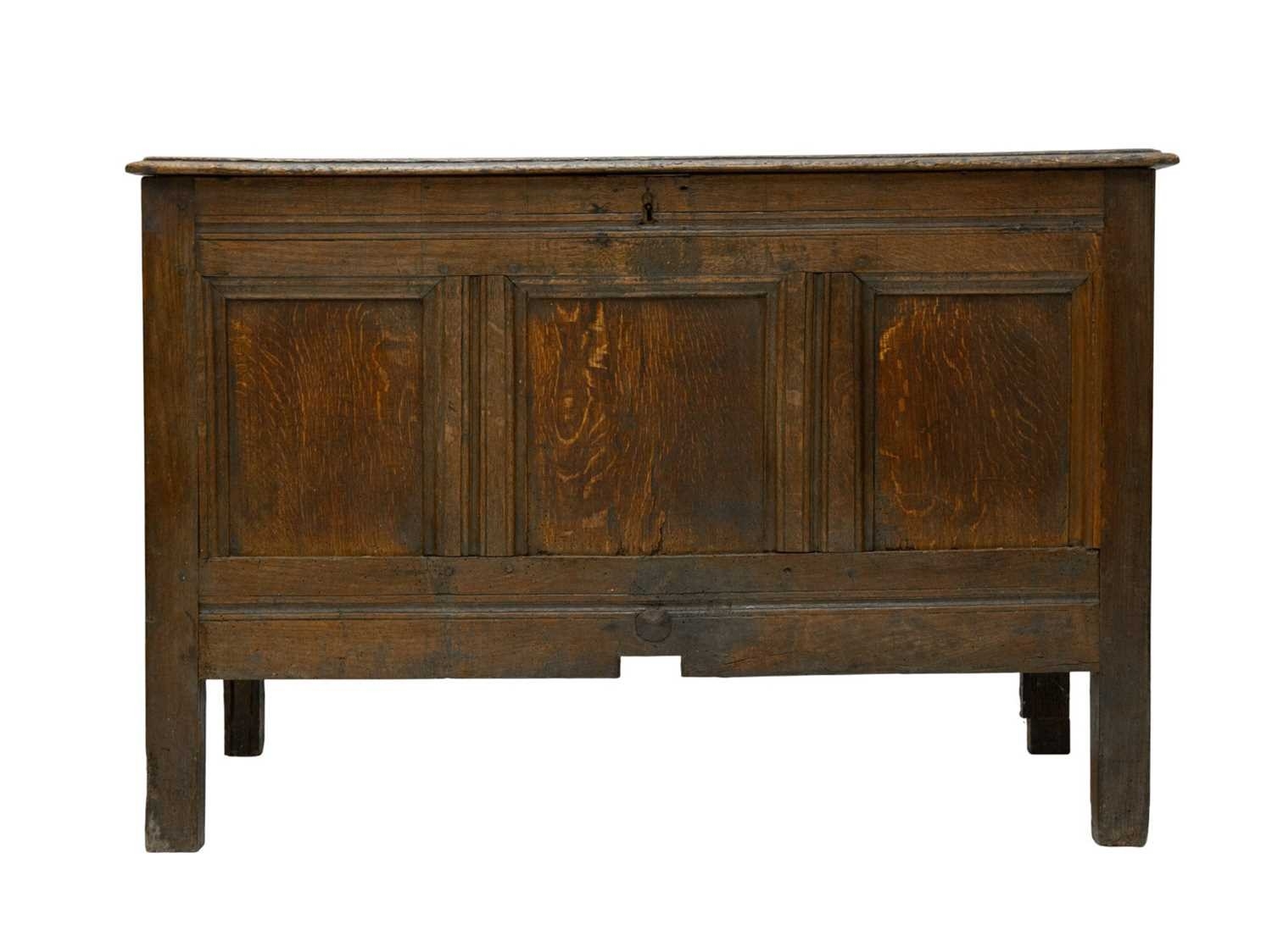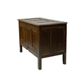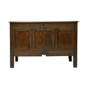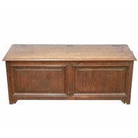 An oak panel coffer. 18th century, height 75cm, width 111cm, depth 56cm.