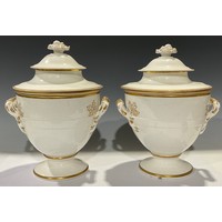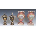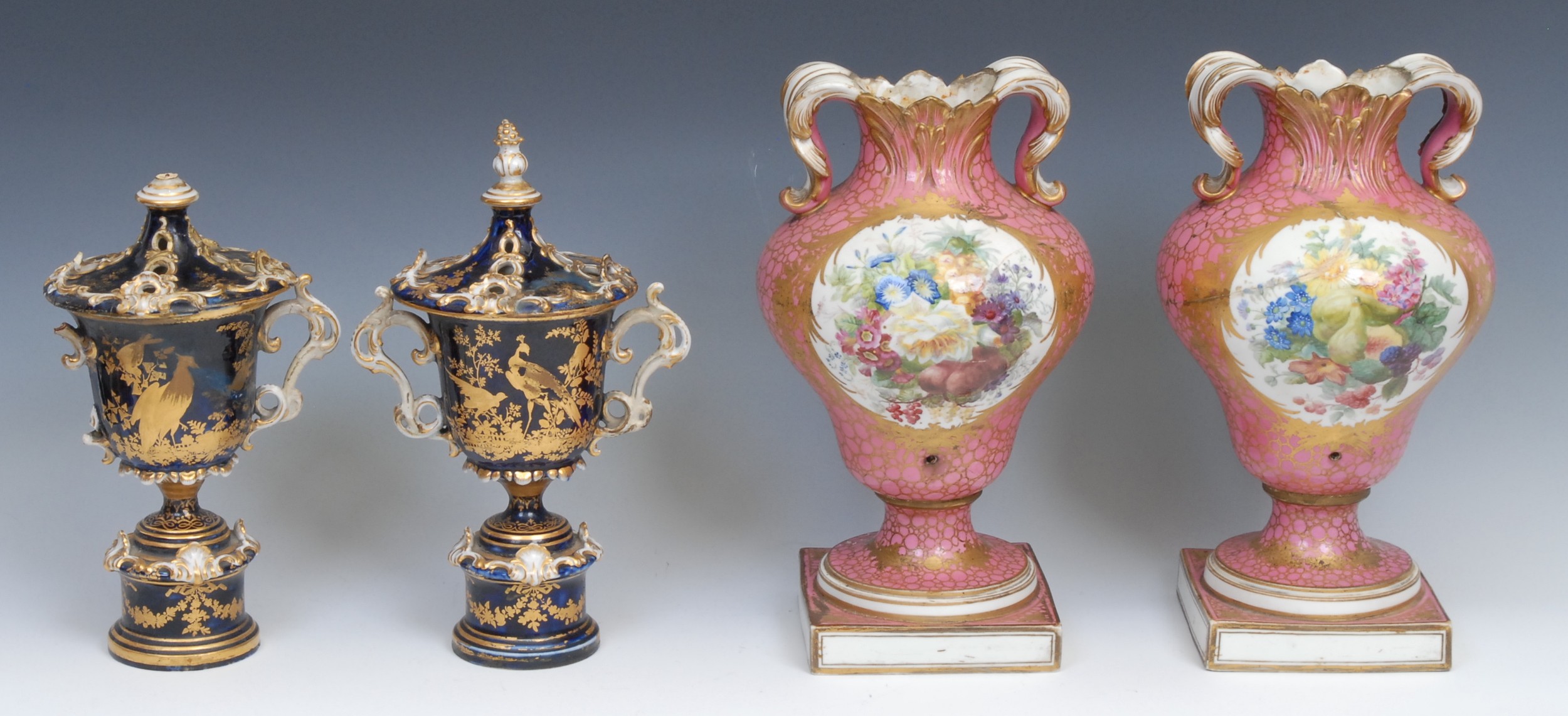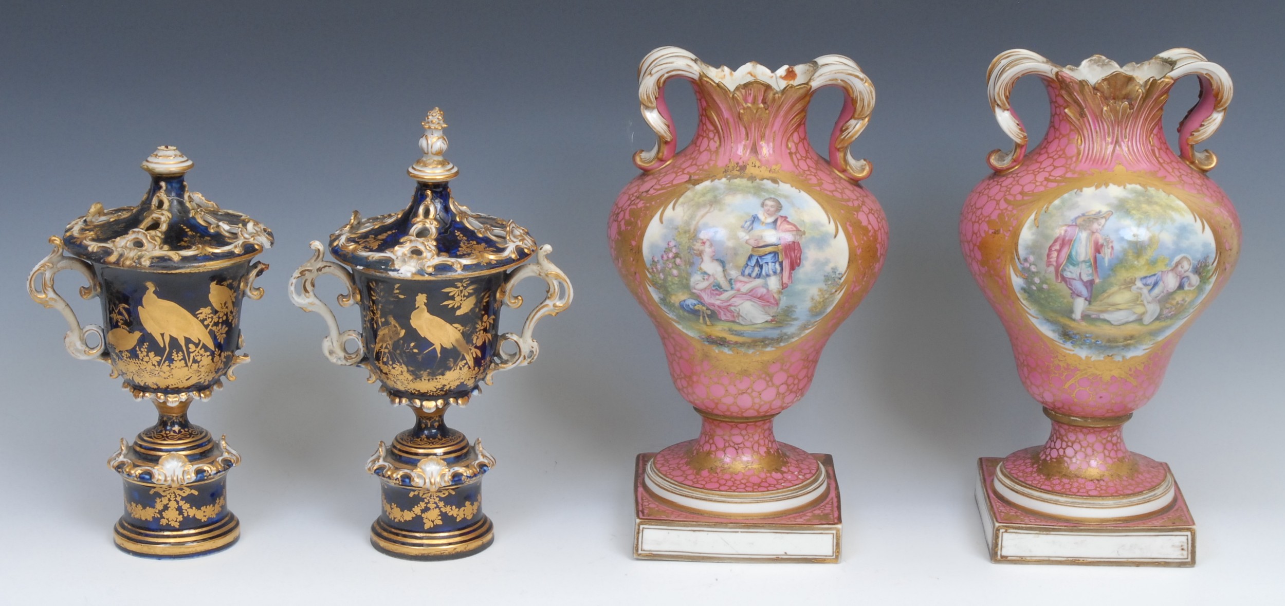 A pair of Continental ogee vases, painted in the manner of Sevres, with panels of courting couples, the verso with fruit, on rose pompadour ground, 29cm high, c.1860, faults; a pair of Continental pot pourri vases, gilt decorated with fanciful birds on a cobalt blue ground, 26cm high, faults (4)
