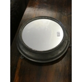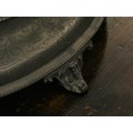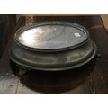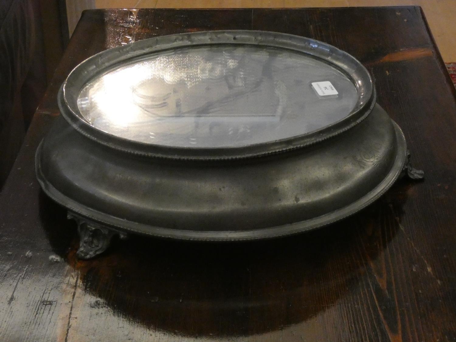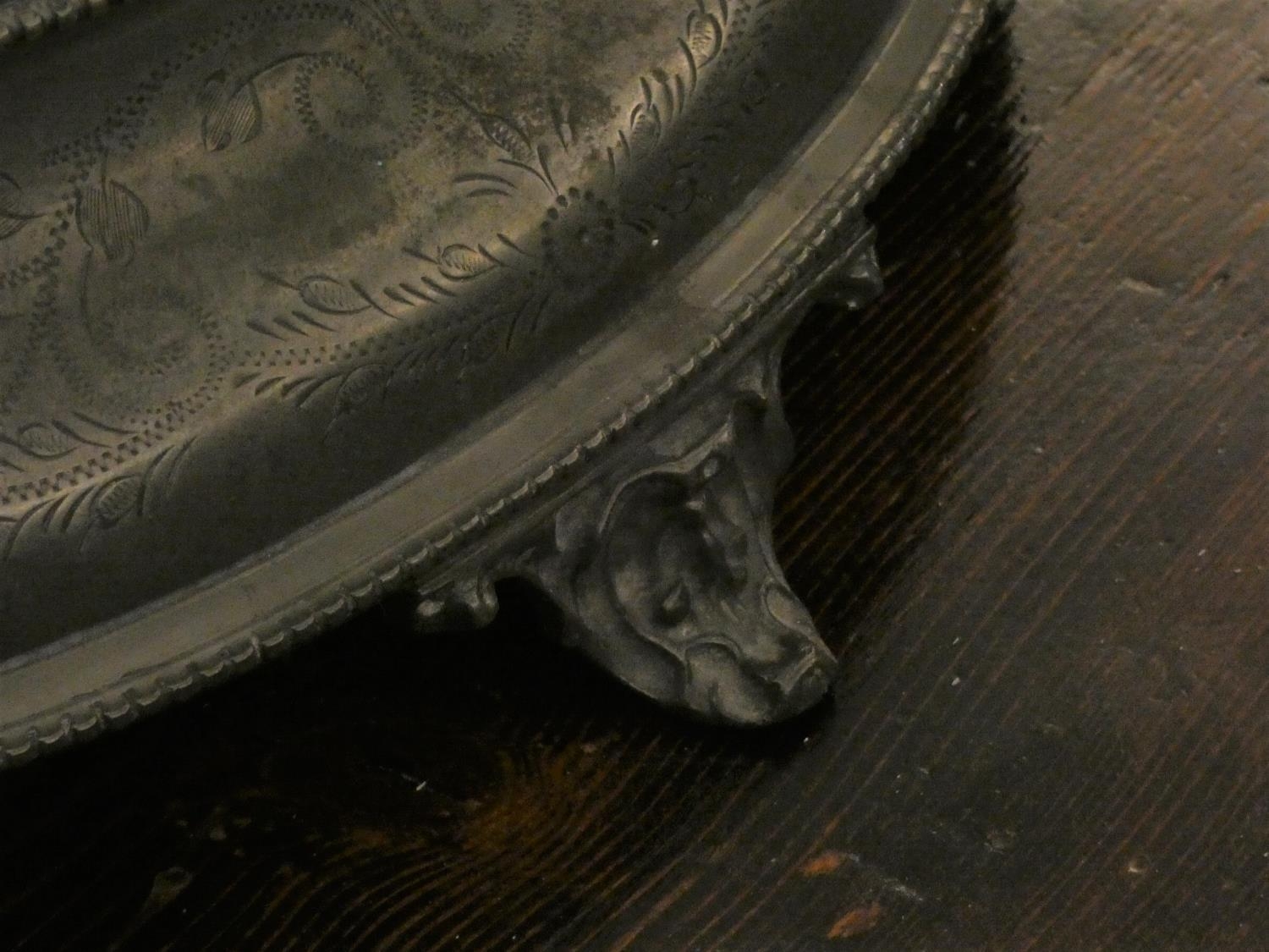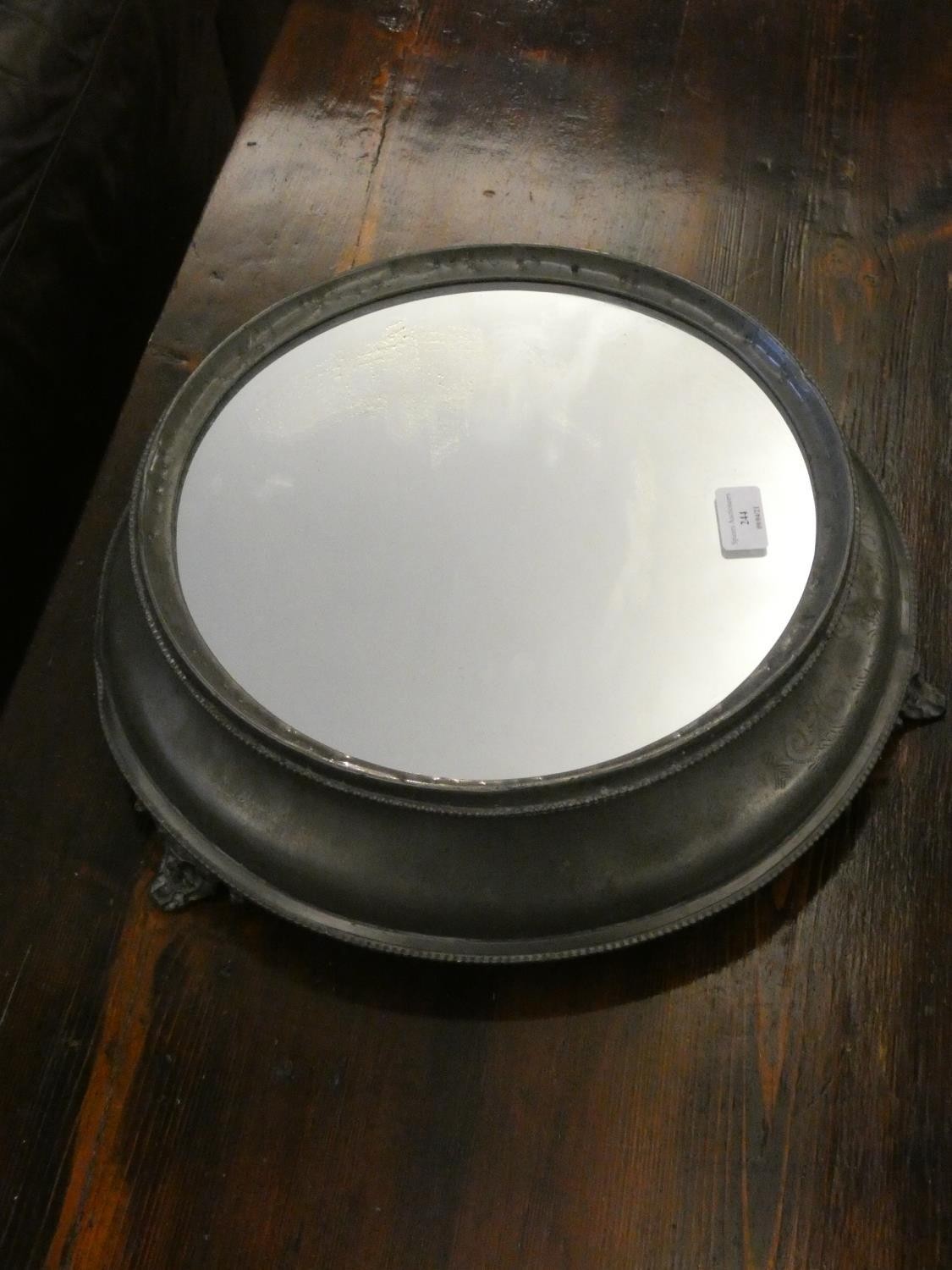A Victorian pewter cake stand with the original mirrored plate, beaded egg and dart borders framing foliate and scroll engraving. 34cm diameter.