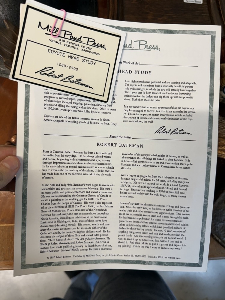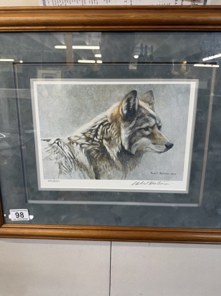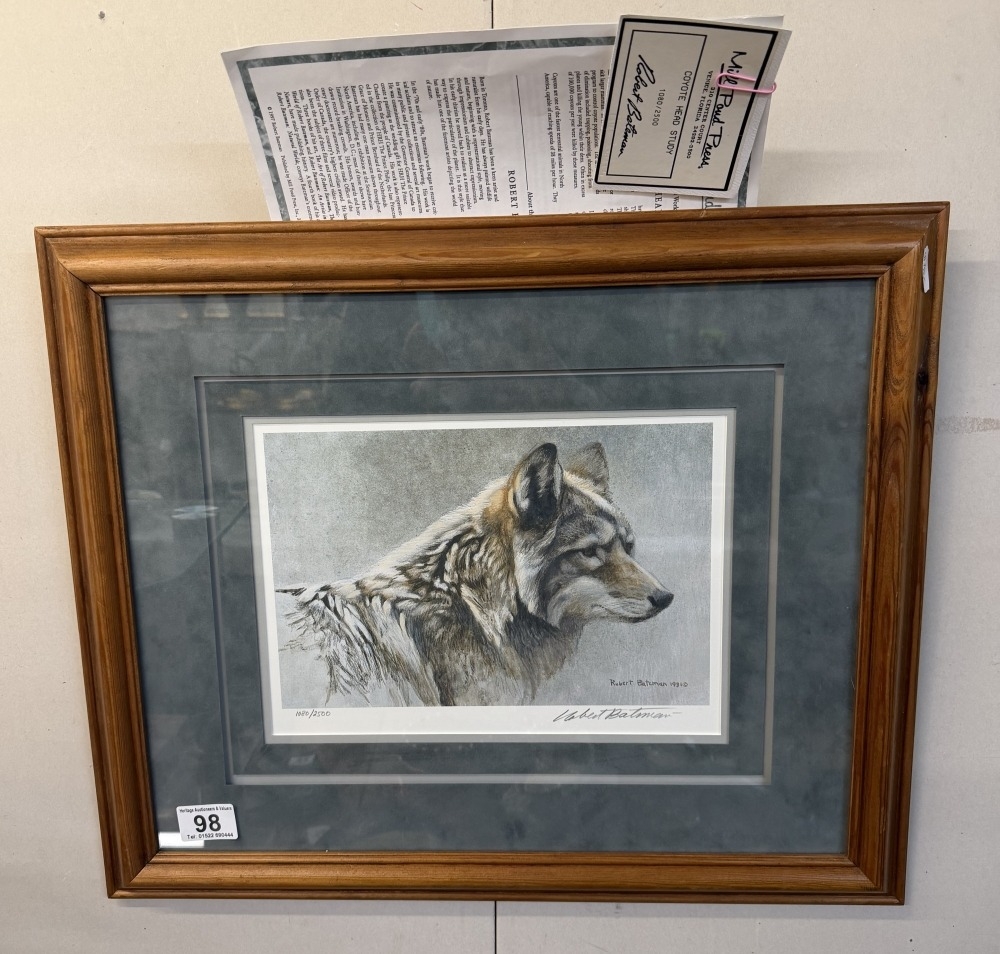 A Limited Edition 1080 / 2500 signed Robert Bateman 1991 print of a wolf with COA