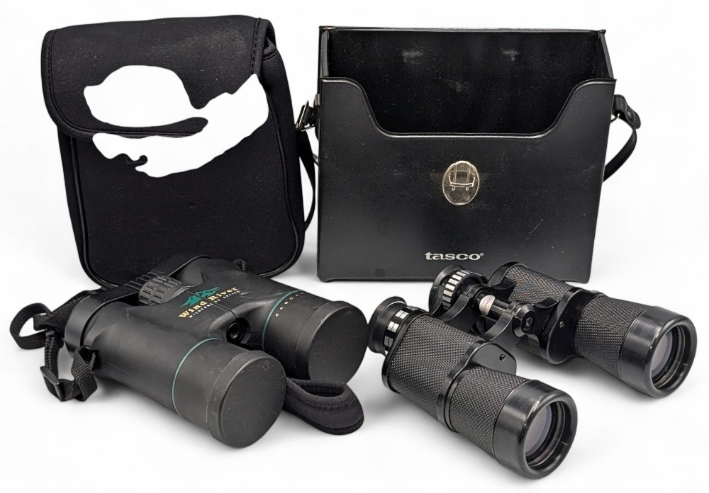 High Quality Wind River Optics, the cascades 8 x 42 field 6.5o waterproof binoculars imported by Leipold, front and back lens clips padded neck strap in original napoleon case, comes with a Tasco binoculars fully coated wide angle 10x42 367ft at 1000 yds, light weight model 260-a No. 47624, used condition in hard case with shoulder strap. Some damage noted to eye rubbers