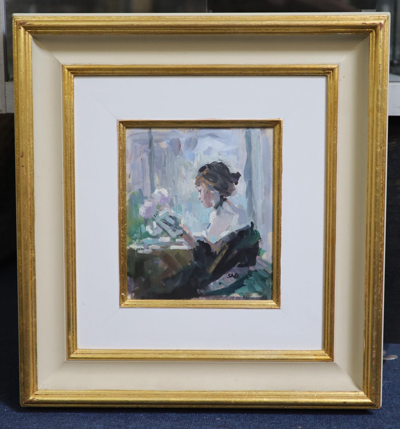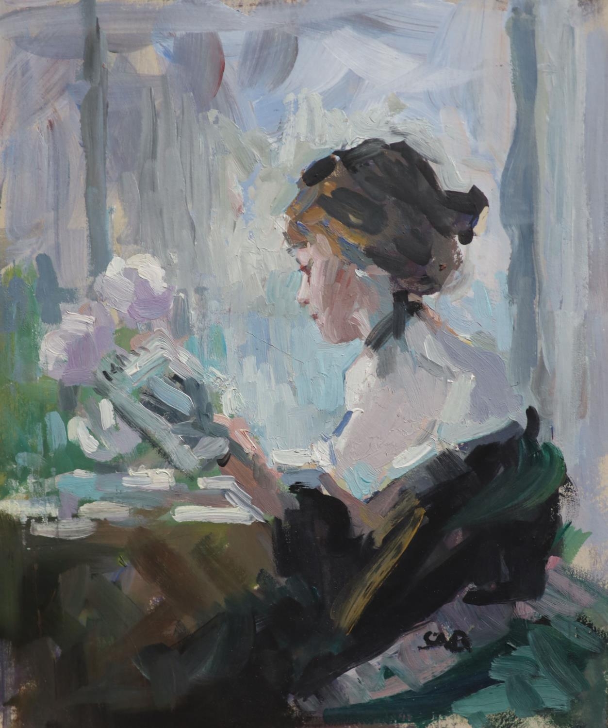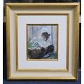 Good untouched condition a very faint diagonal scratch running across the work from the move flowers downwards through her shoulder at 45°. Some of the plane card background shows through unpainted around the margins. The initials are in the black of her dress. Housed in a kilt and painted frame no labels verso
