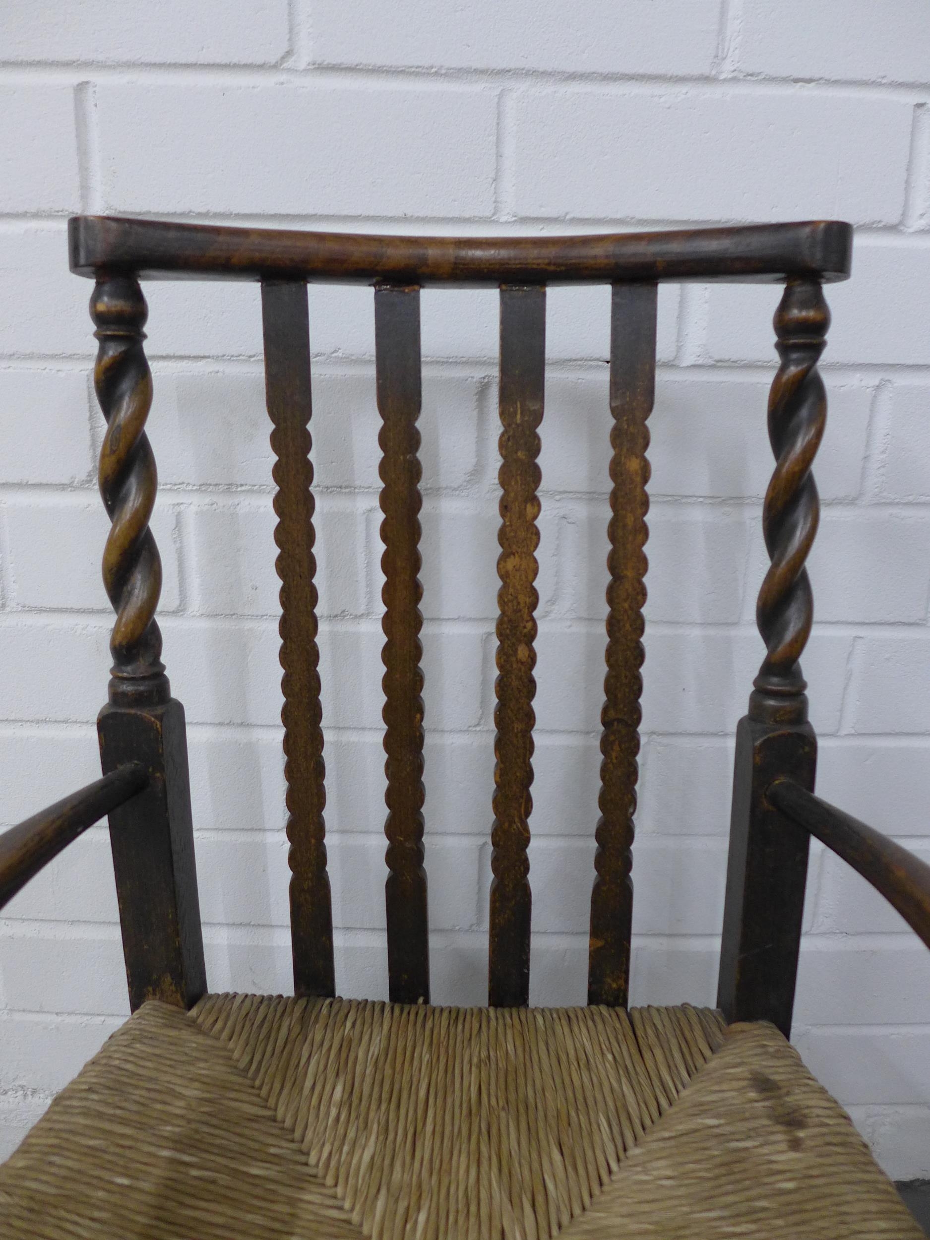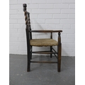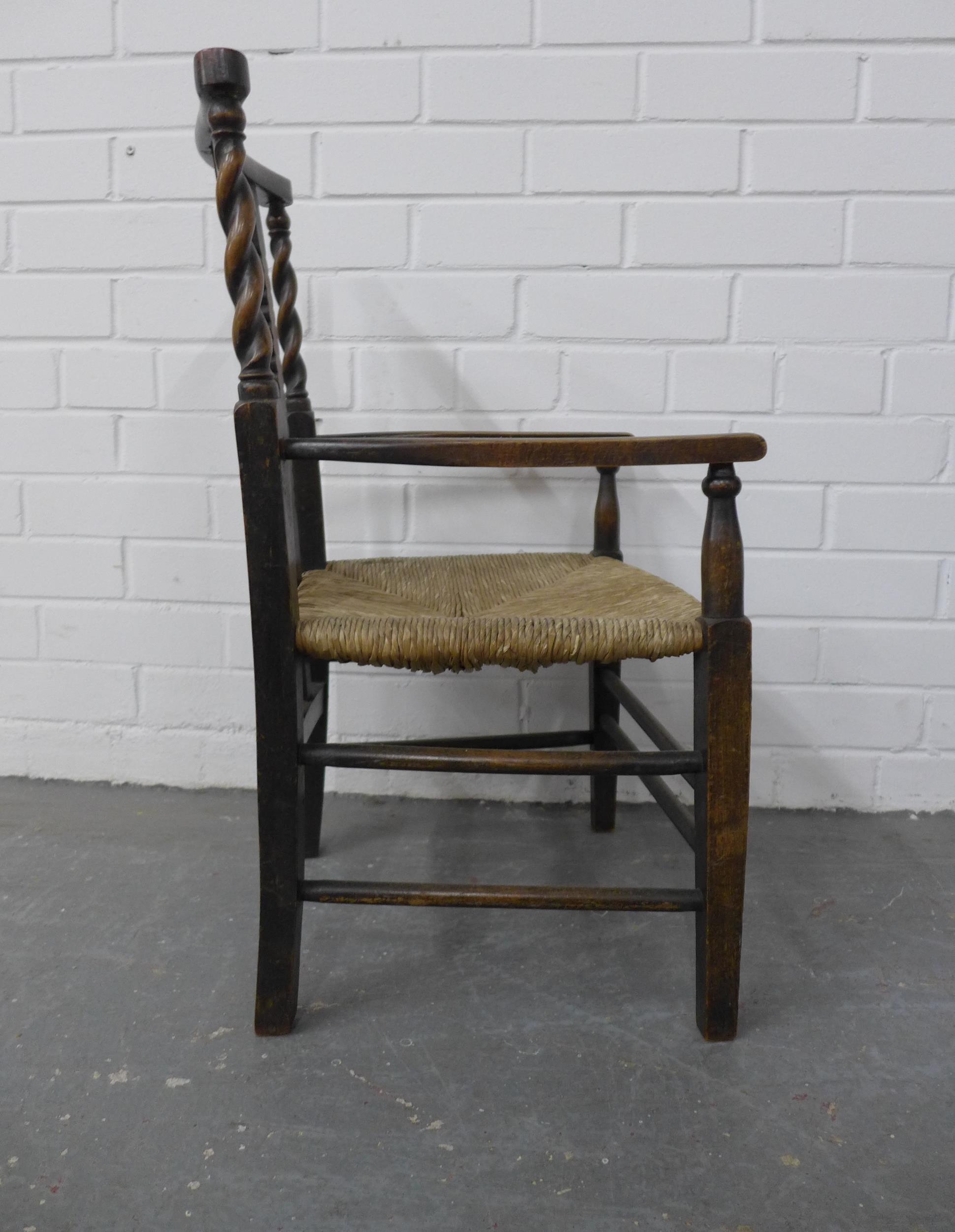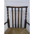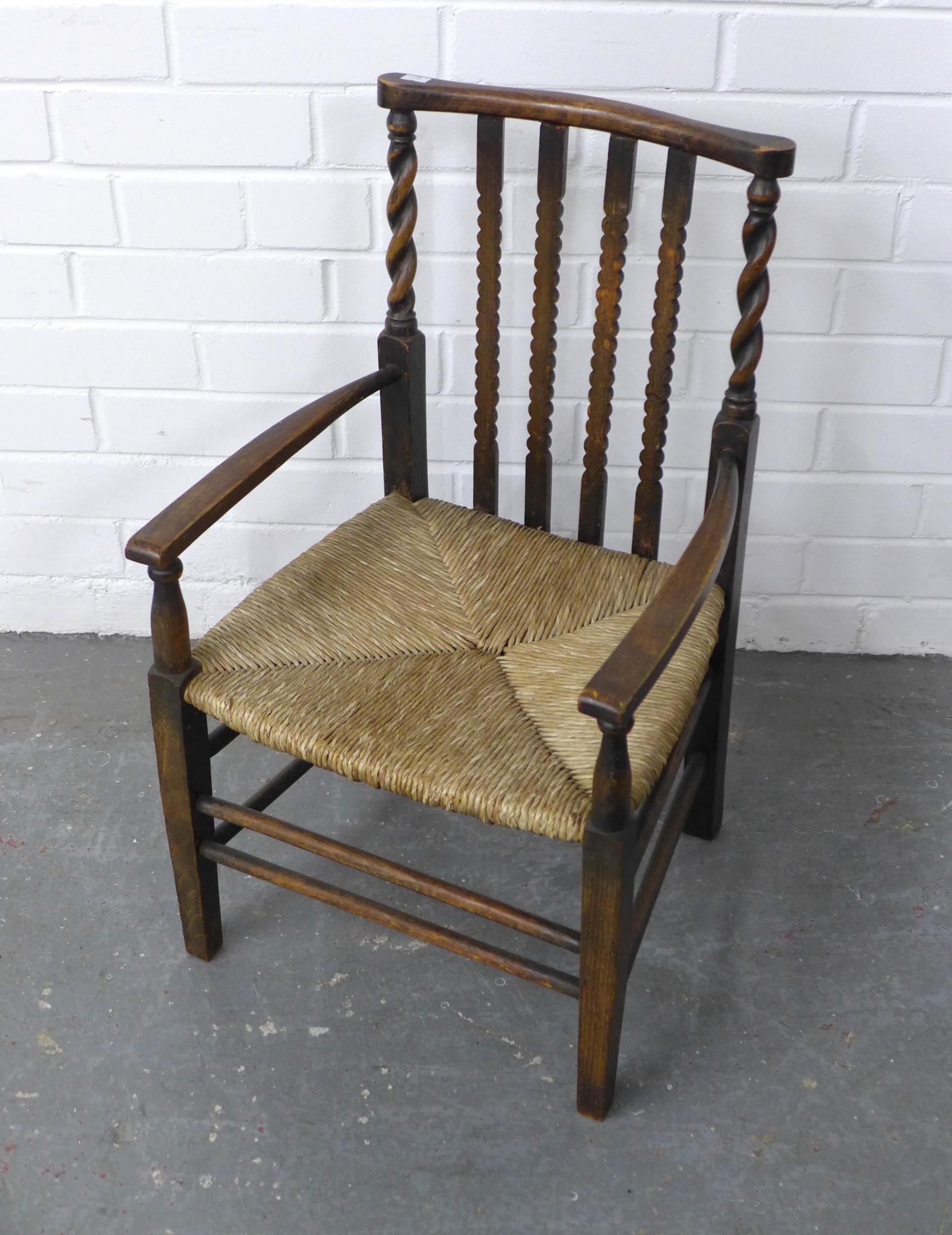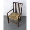 Child's Arts & Crafts elm chair with rush seat and barley twist side rails, 39 x 66cm