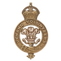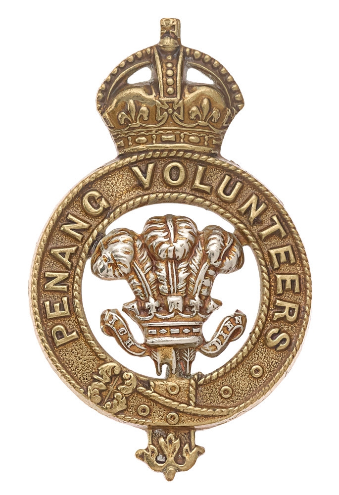 Penang Volunteers Malay cap badge c. 1902-21. Good scarce British made die-stamped brass crowned title strap; white metal Prince of Wales plumes to voided centre.