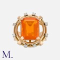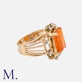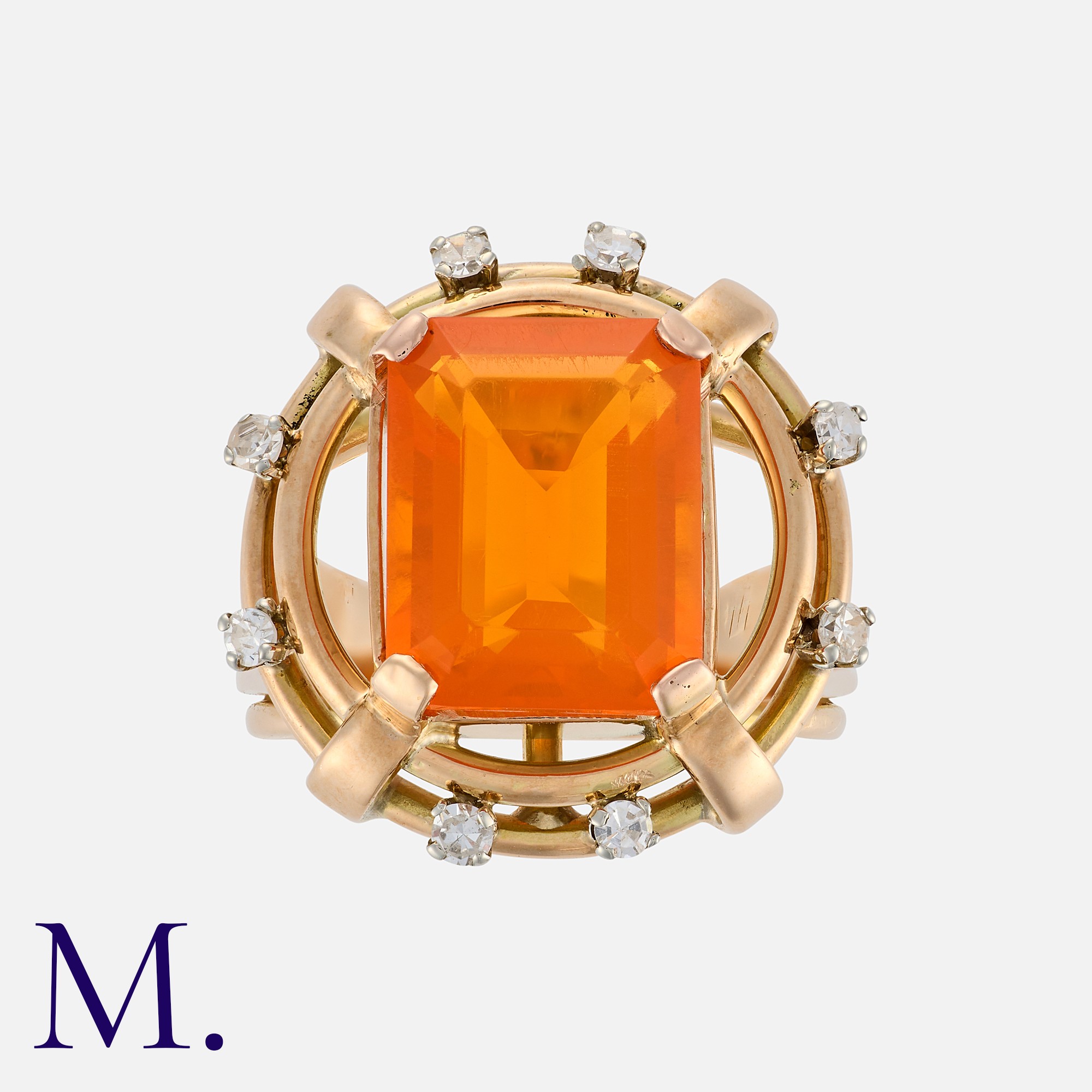 A Fire Opal and Diamond Ring in 18 carat gold, set with an octagonal step cut fire opal of approximately 3.75 carats, in a circular border accented with round cut diamonds. Marked 750 for 18 carat gold.