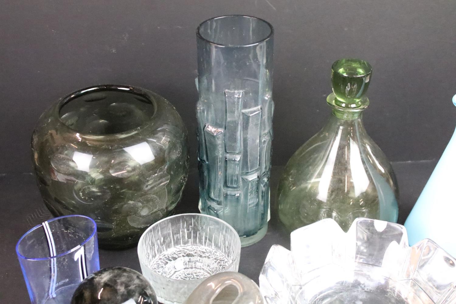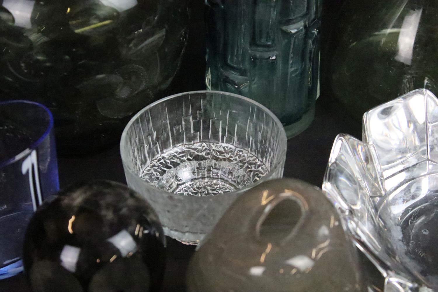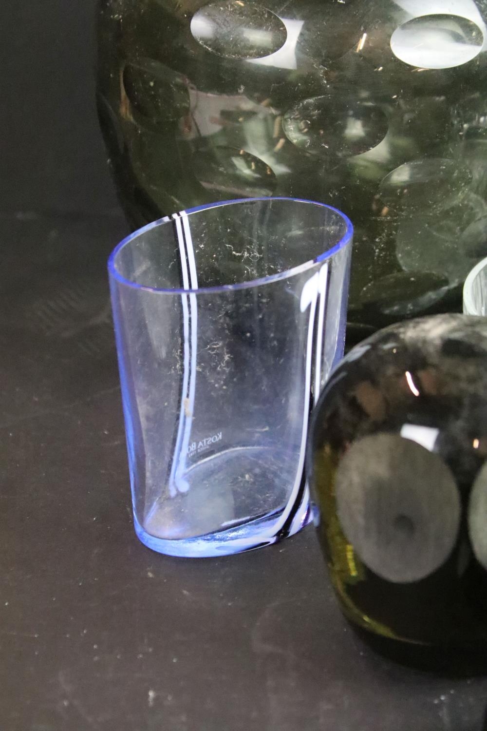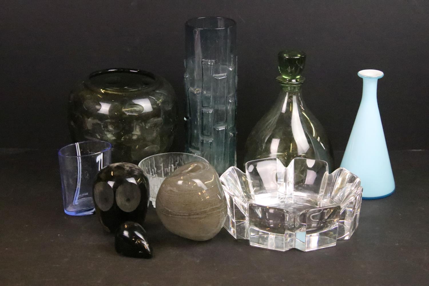 Selection of modern glass to include Orrefors chucky art glass dish, Kosta Boda small blue rainbow vase, Wilhelm Wagenfield style cut glass bowl vase, green glass decanter, Bo Borgstrom textured bamboo vase and other glass items