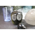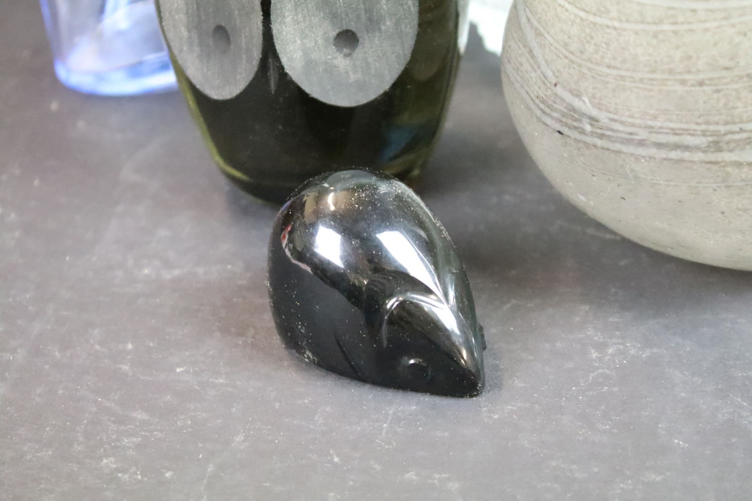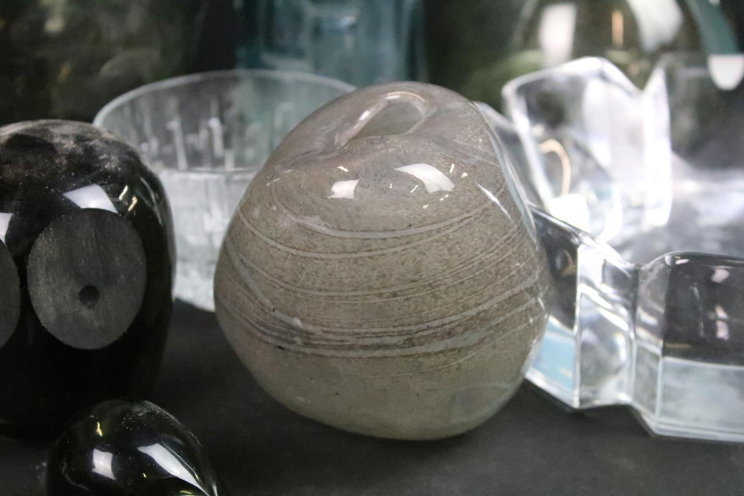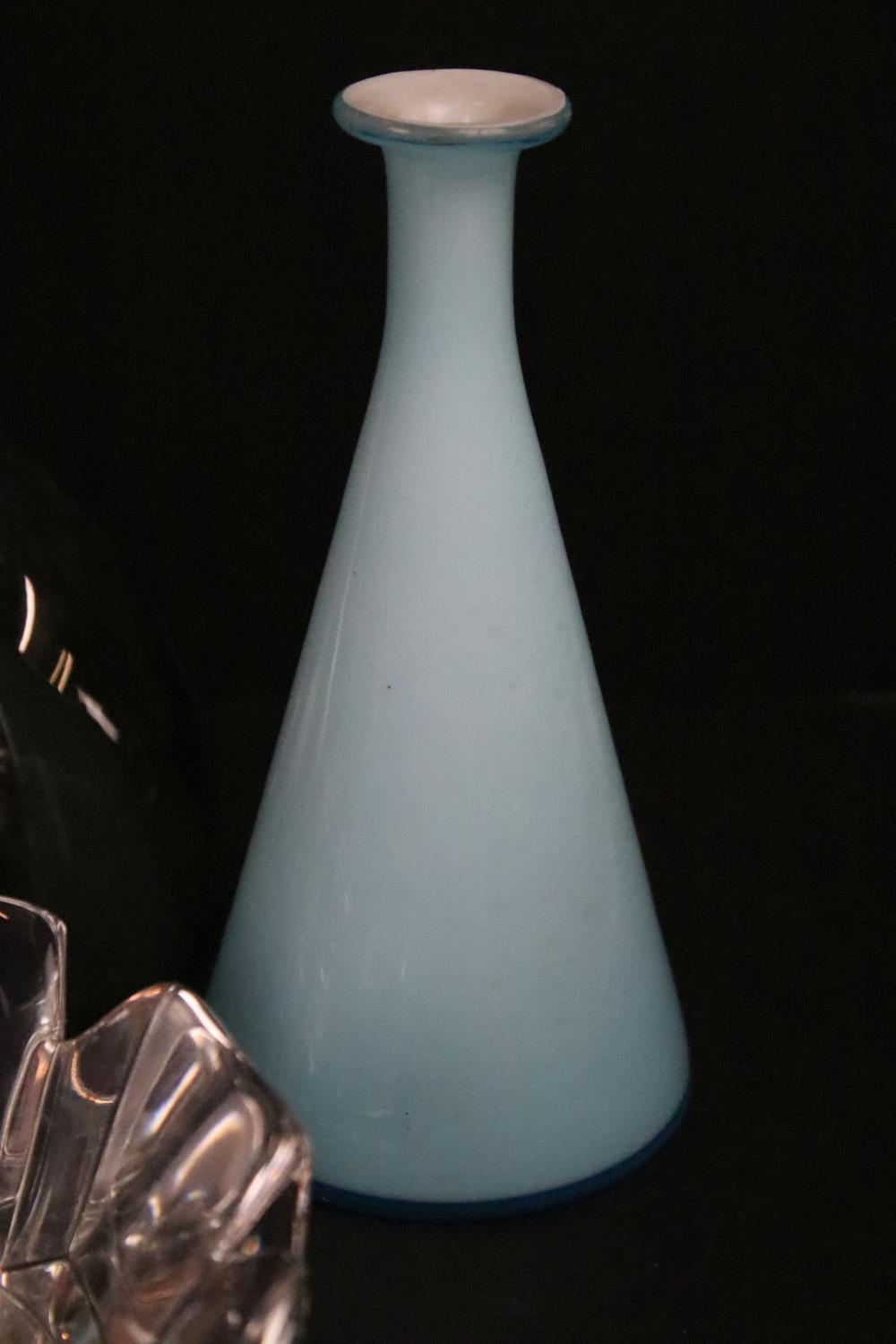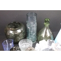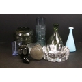 Selection of modern glass to include Orrefors chucky art glass dish, Kosta Boda small blue rainbow vase, Wilhelm Wagenfield style cut glass bowl vase, green glass decanter, Bo Borgstrom textured bamboo vase and other glass items