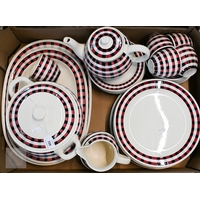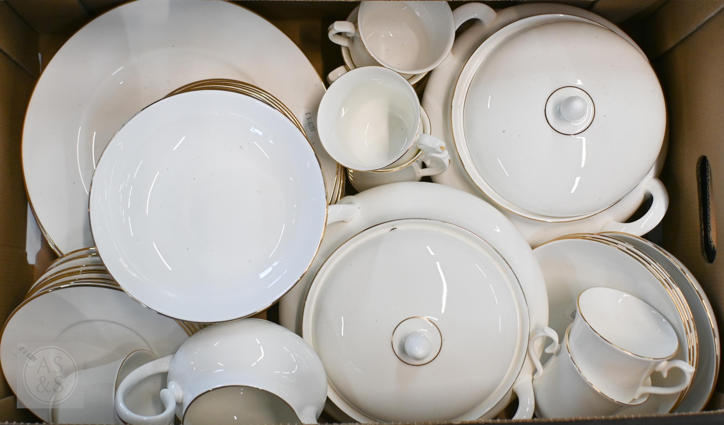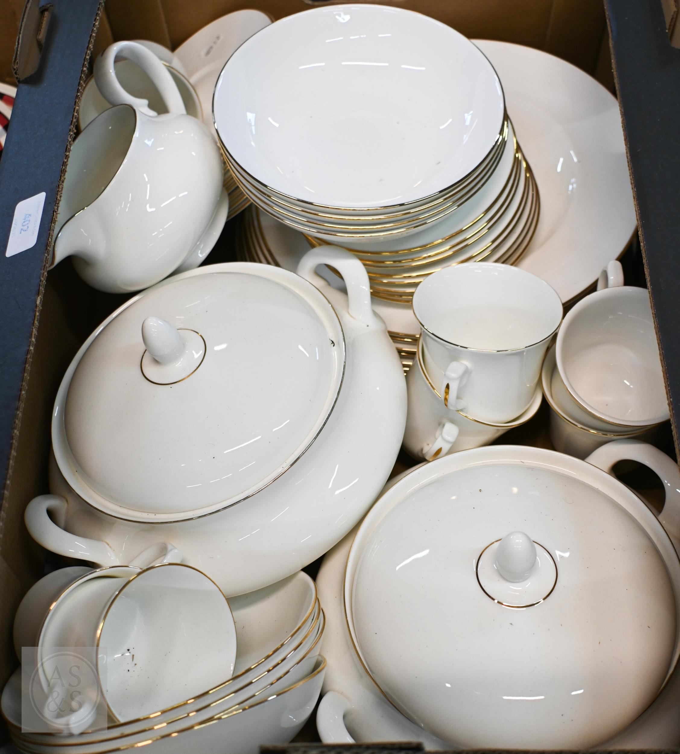 A Queen Anne (manufacturer) gilt-rimmed dinner/tea service, 46 pieces (box)