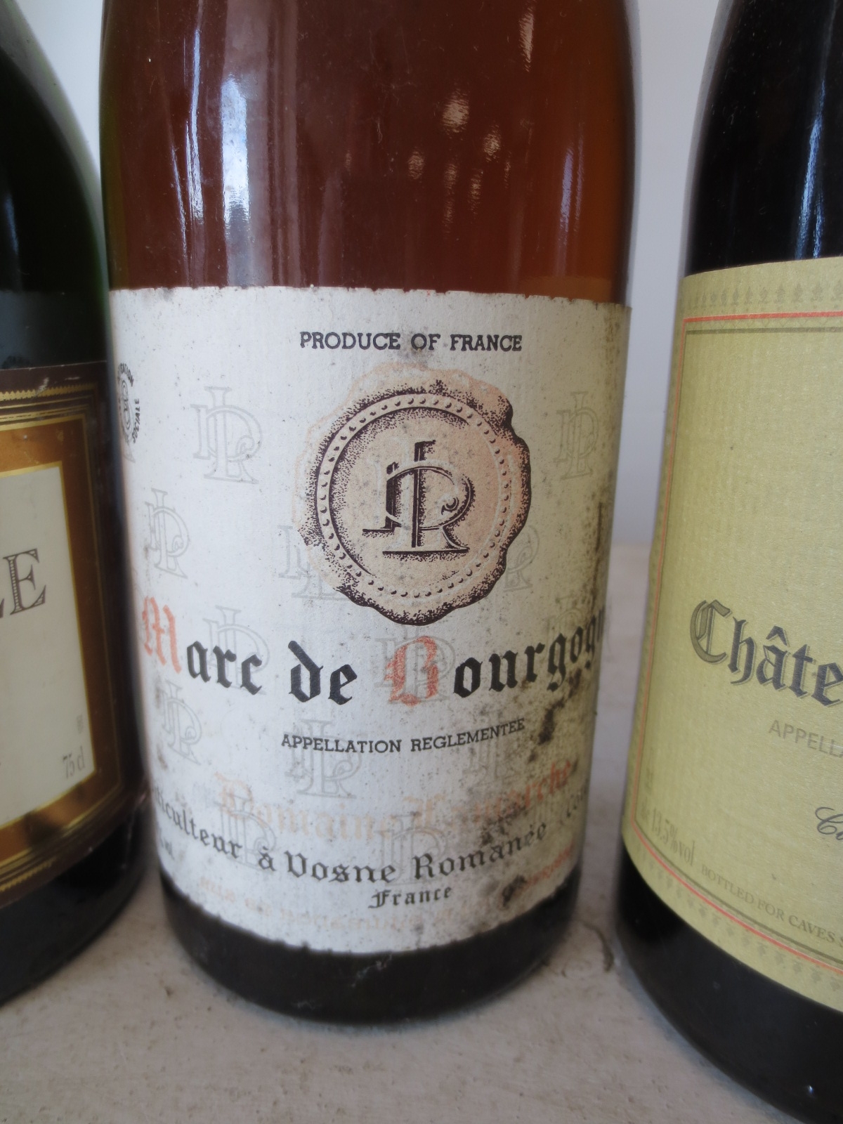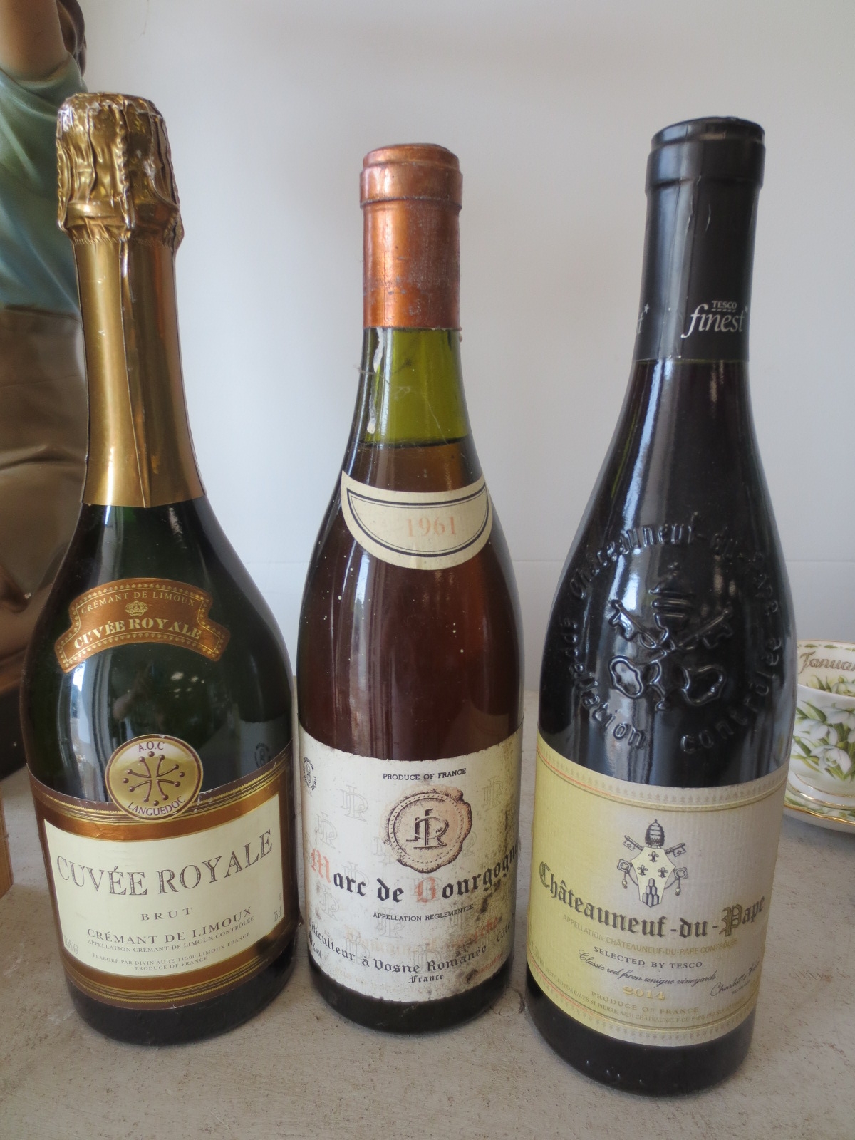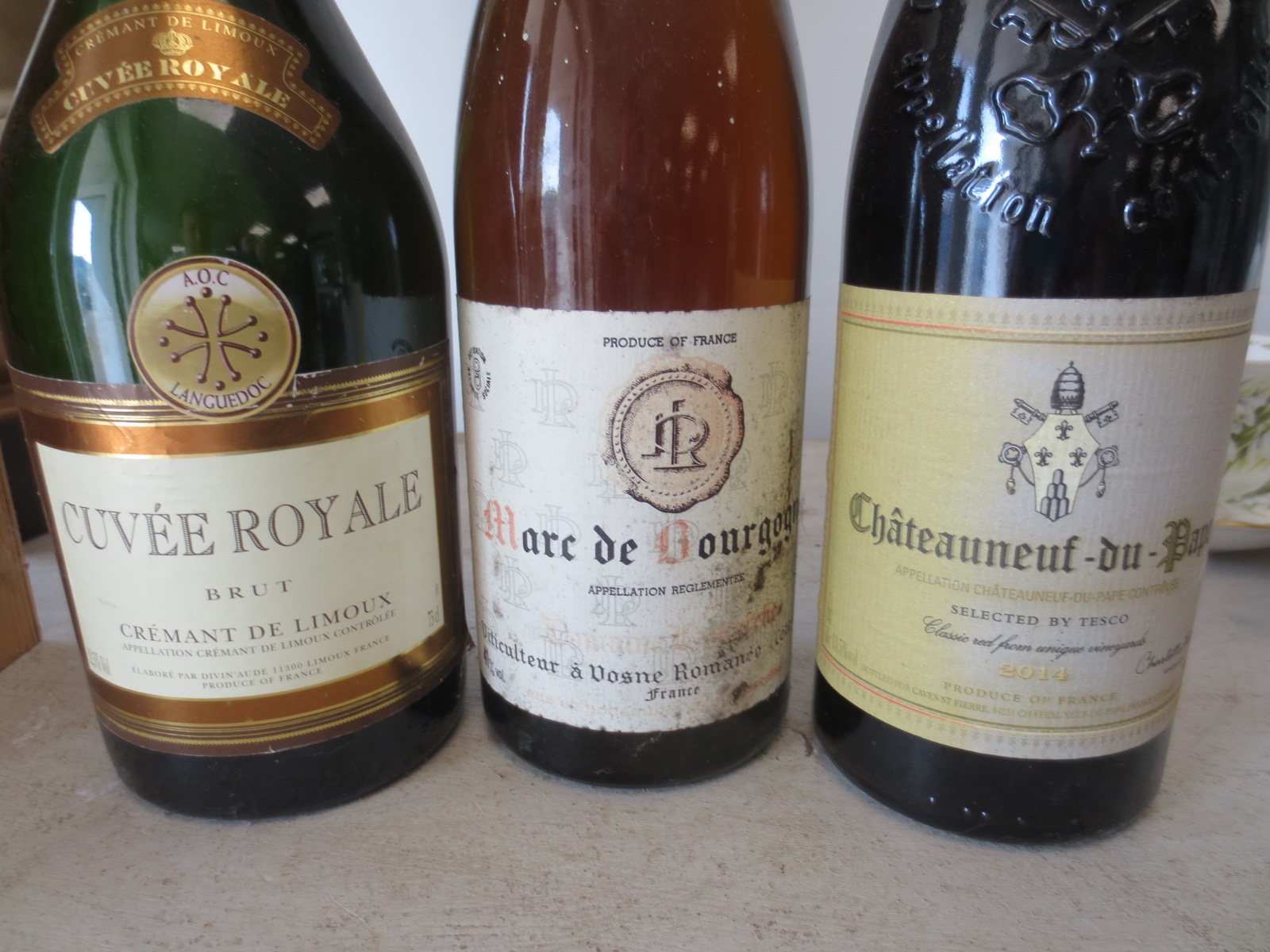 A bottle of 1961 Marc de Bourgogne, a bottle of 2014 Chateauneuf du Pape and a bottle of Cuvee Royale
