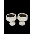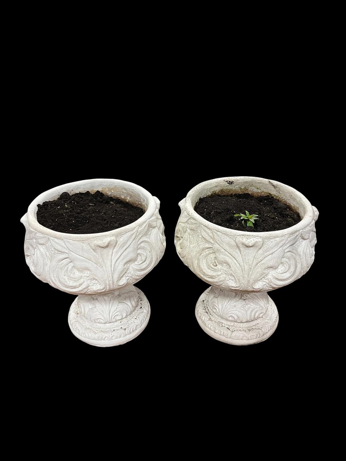 A PAIR OF COMPOSITION STONE GARDEN URNS each of cylindrical form moulded in relief with stylised foliage above a baluster column raised on a circular foot 50cm (h) x 39cm (d)