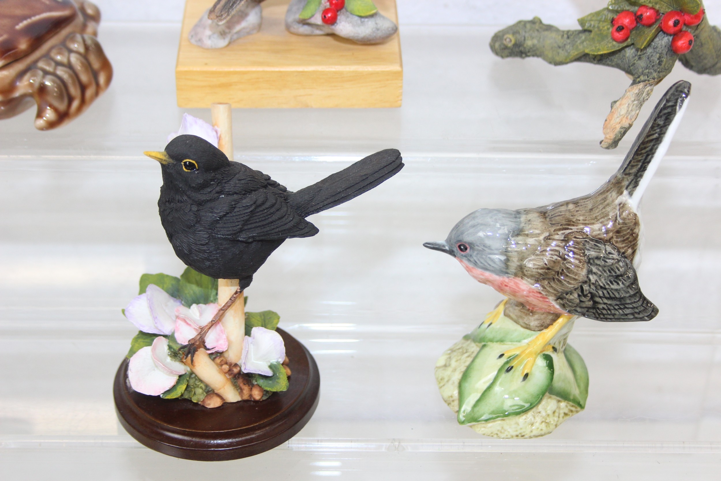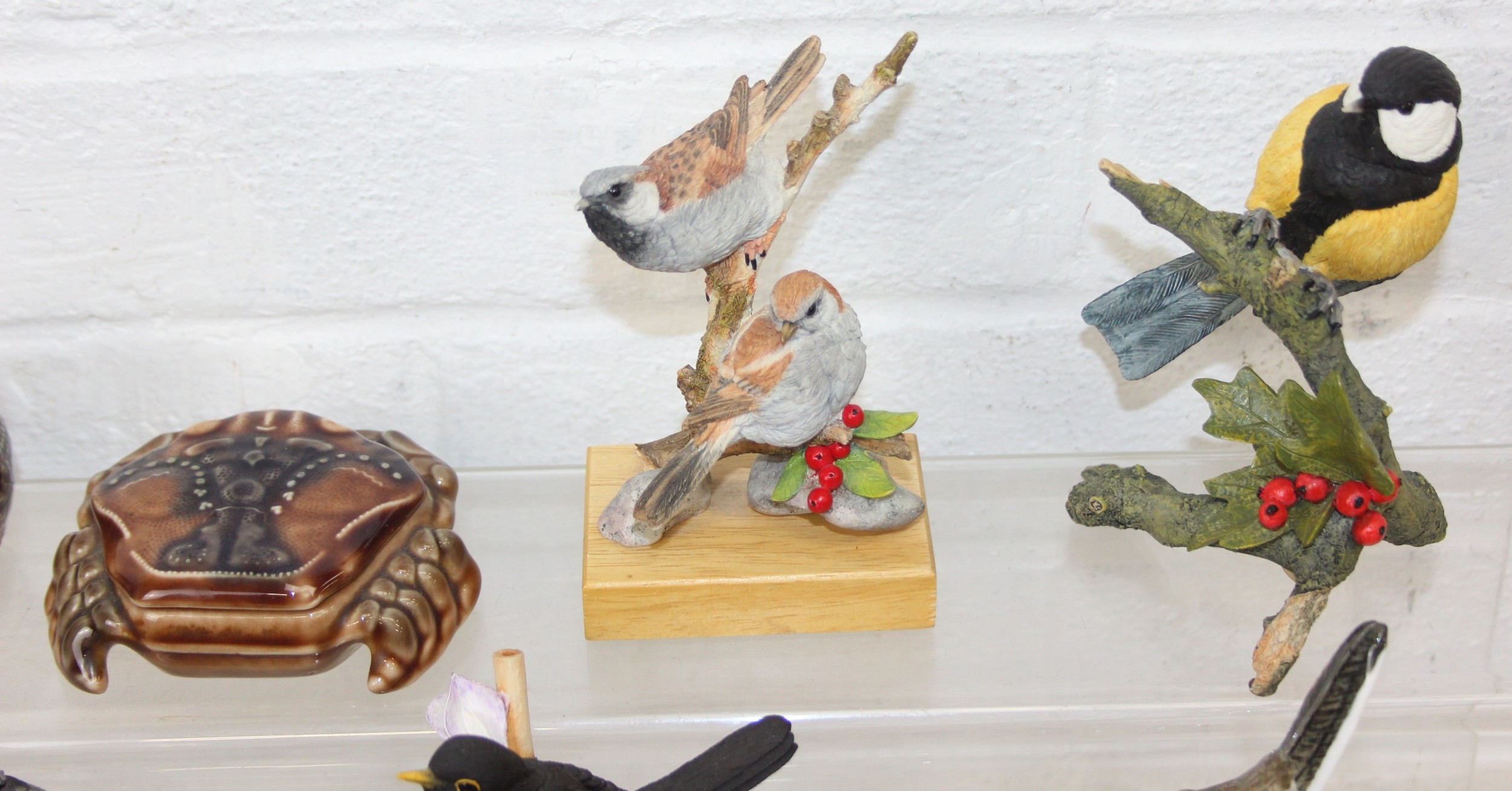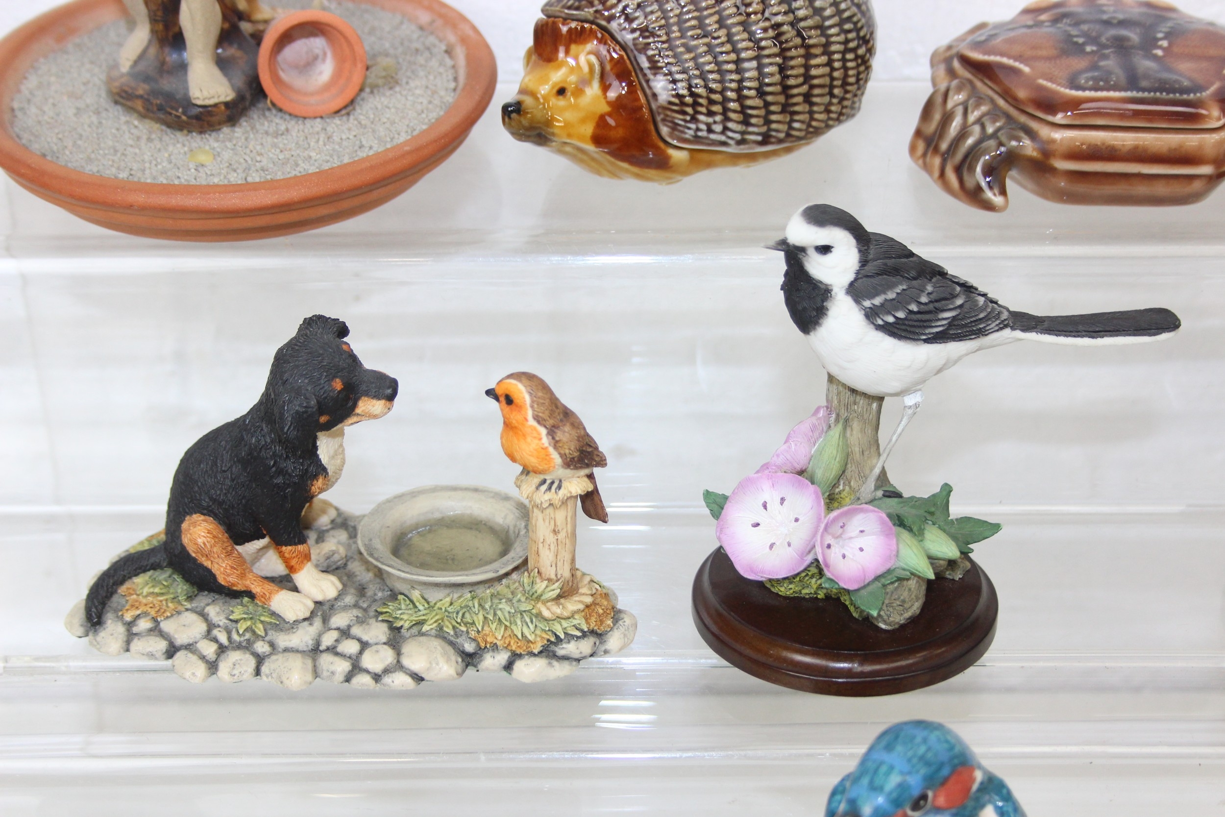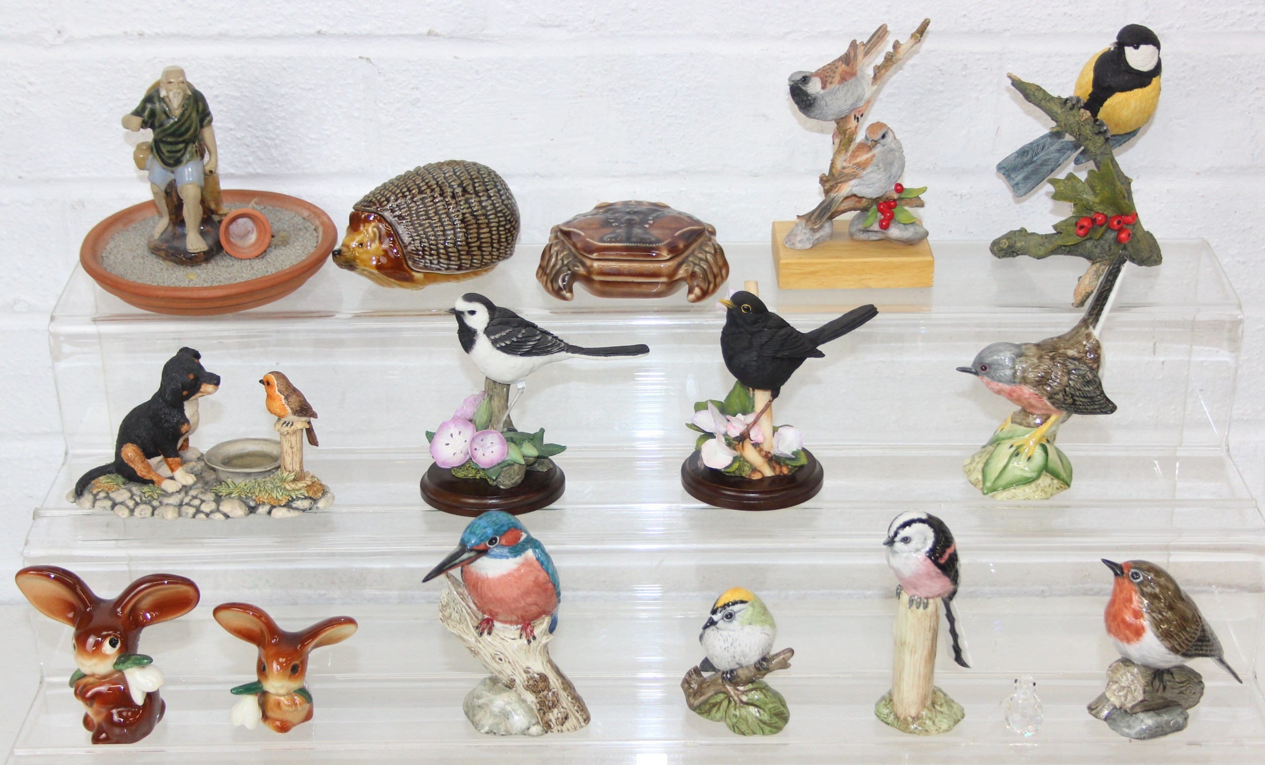 Various named china animals, etc, to include Wade hedgehog and crab trinket pots, Mack birds, Country Artists and Border Fine Arts plus a Chinese figure