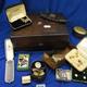 Gents Rolled Gold & Yellow Metal Studs, boxed studs, gold crowned lion pin, enamelled & white metal cufflinks, coronation commemorative cufflinks, school championship fobs, tin Owz That, children's game etc. in rosewood box