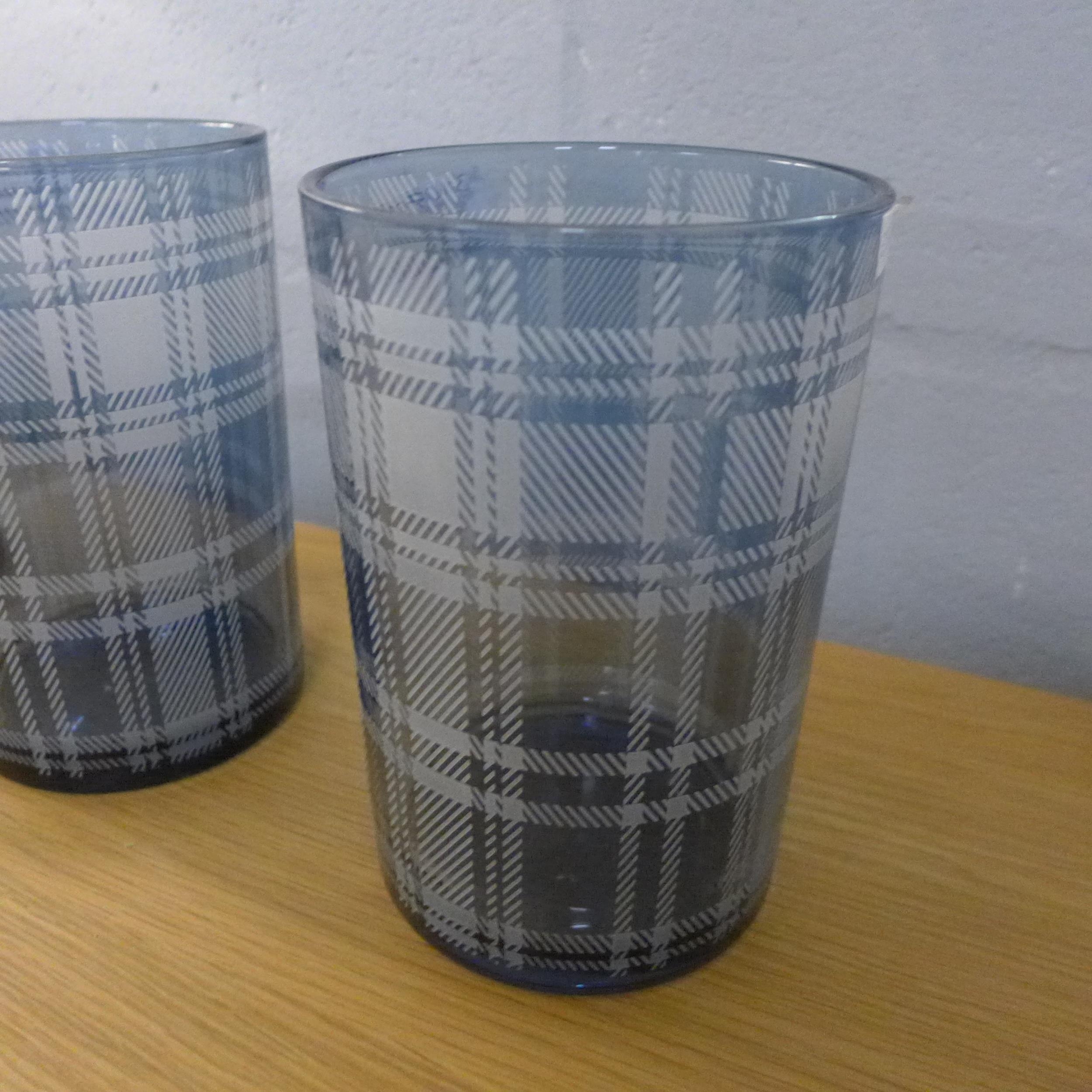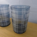 A set of three blue tartan glass hurricane candle holders