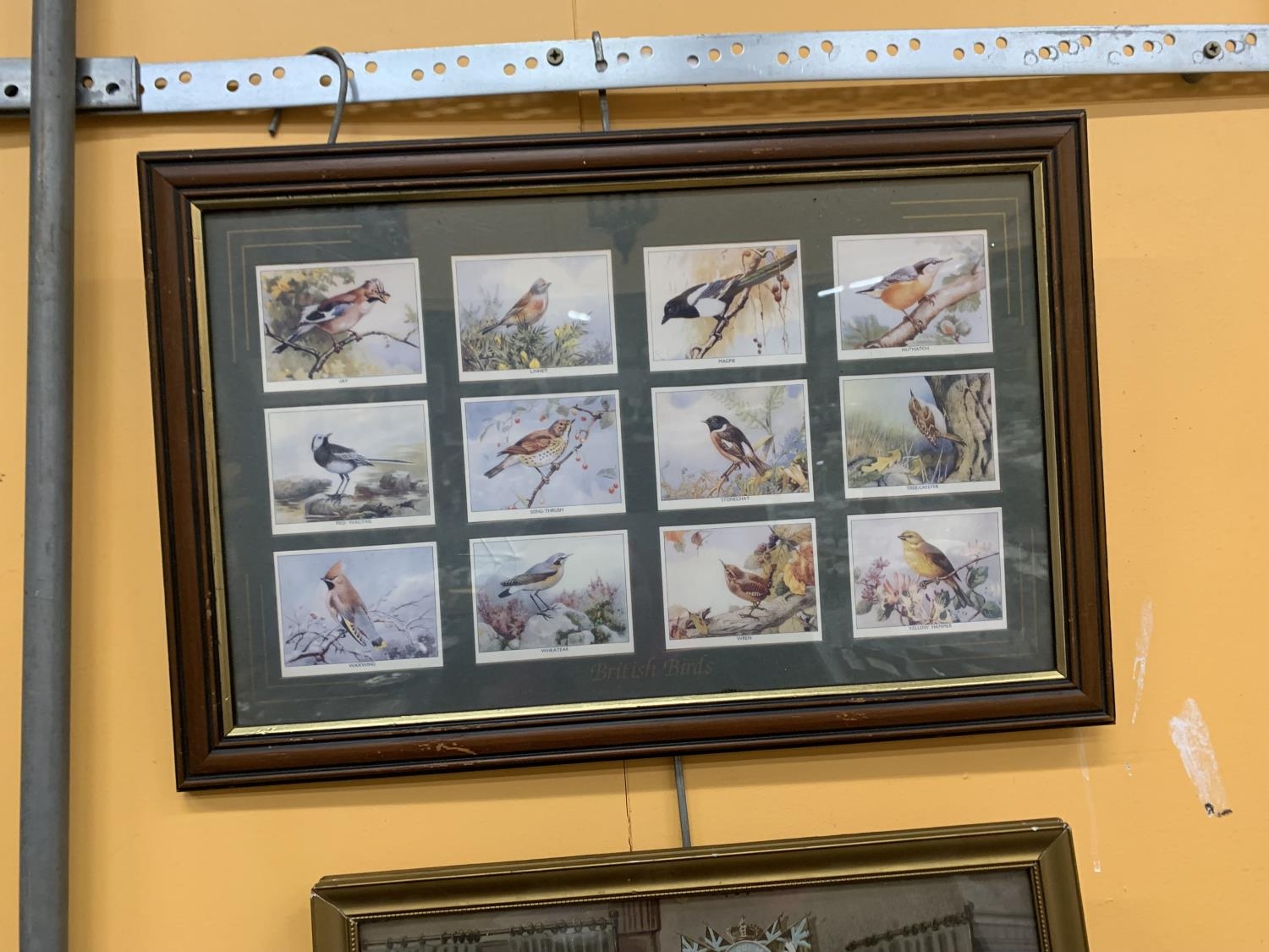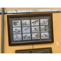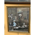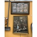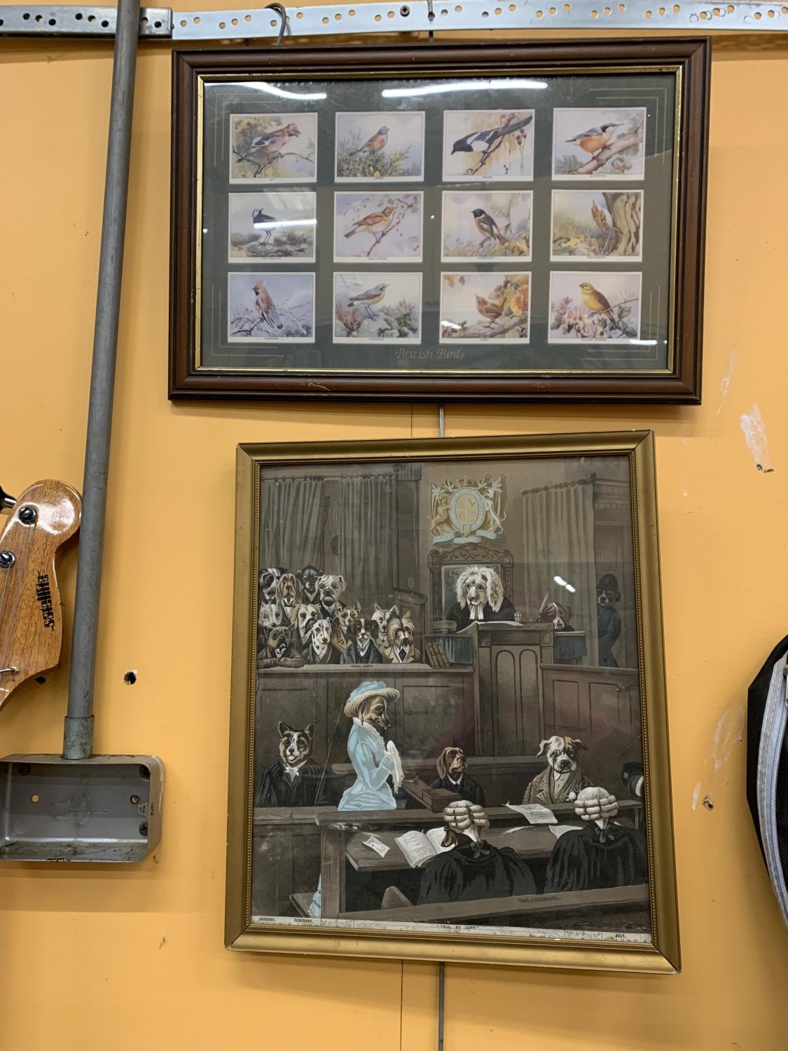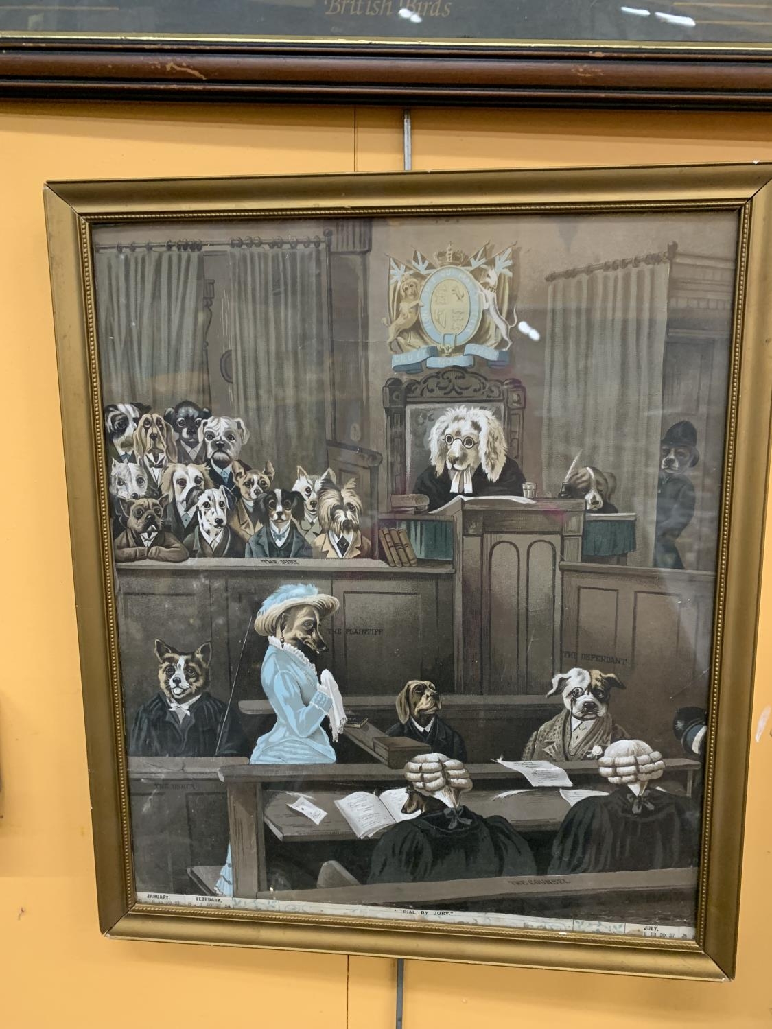AN AFRICAN HARDWOOD FISHING SPEAR (LACKING BARBS) WITH DECORATIVE TIP AND TURNED WOOD DECORATION, LENGTH 221CM, FRAMED PRINT OF BIRDS AND A LOUIS WAIN TYPE DOG CARICATURE COURTROOM SCENE (3)