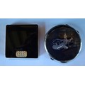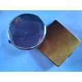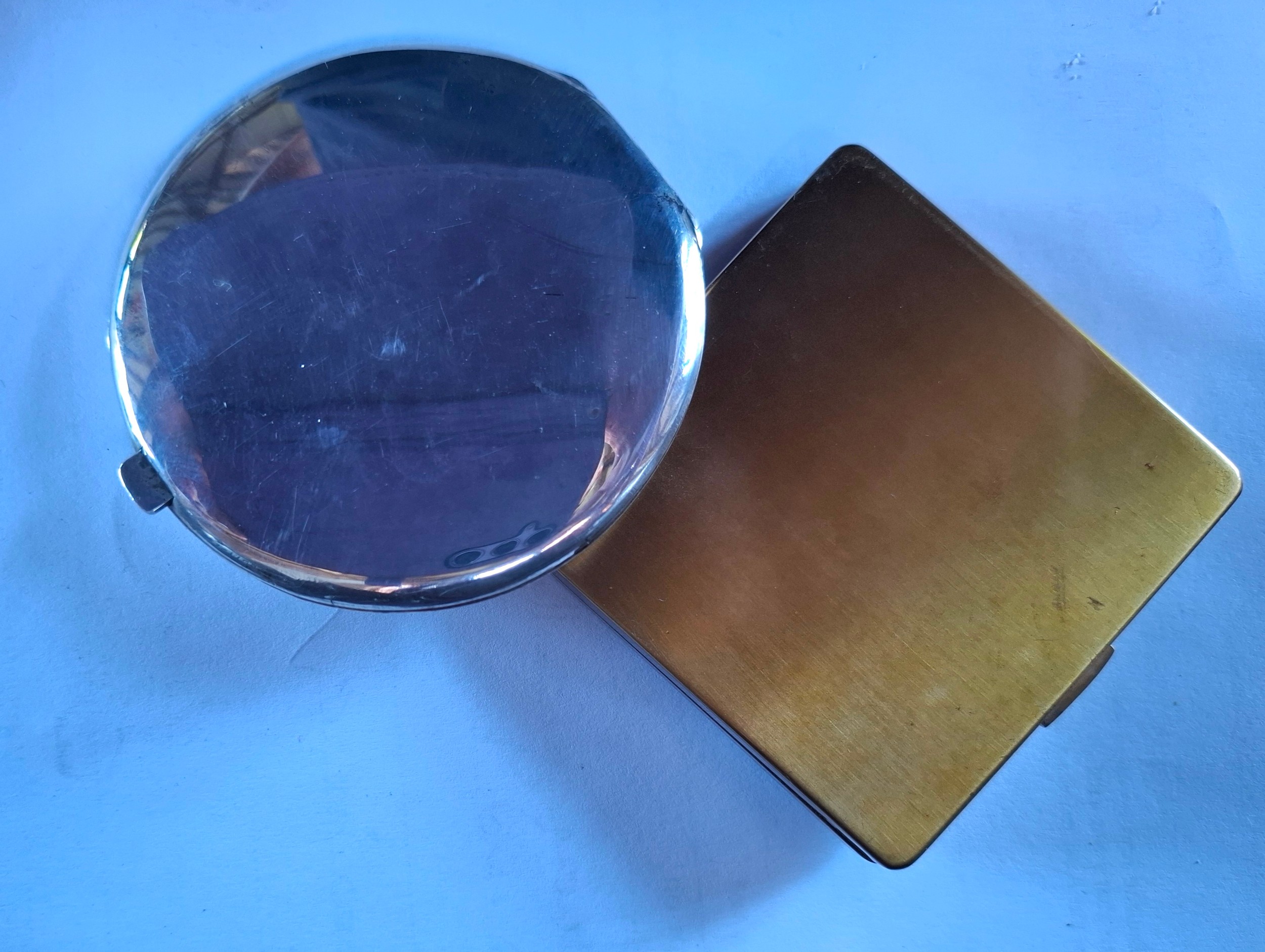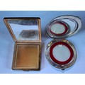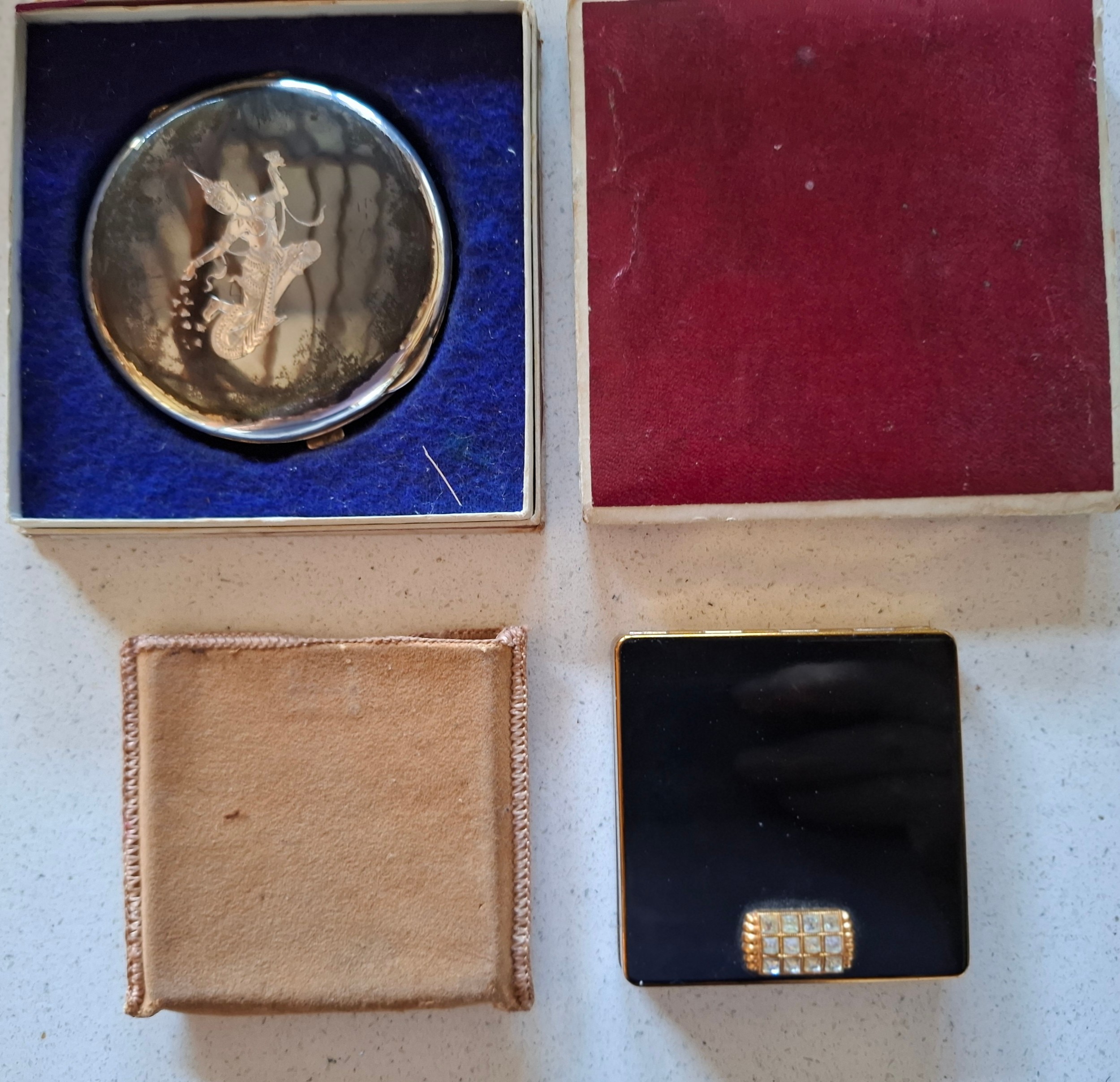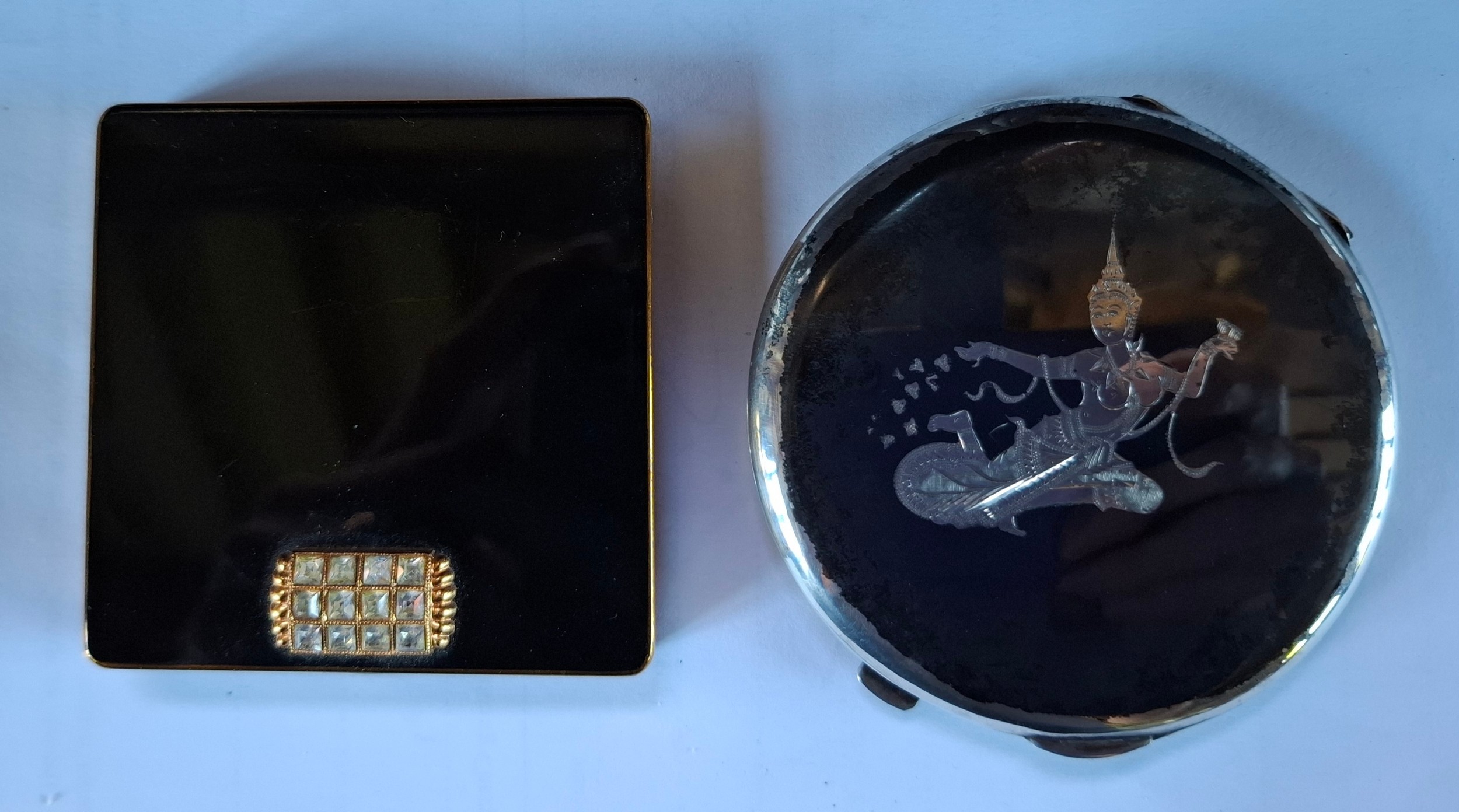 A Sterling silver Niello compact and a Vogue gold tone and black enamel style compact with white glass stones. Location:RAB