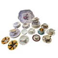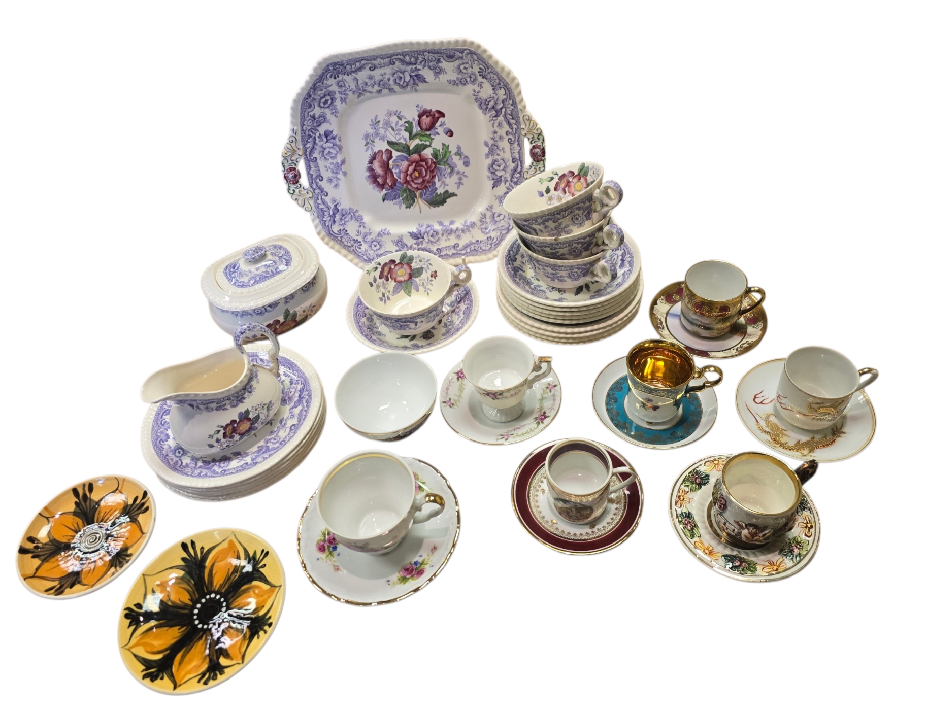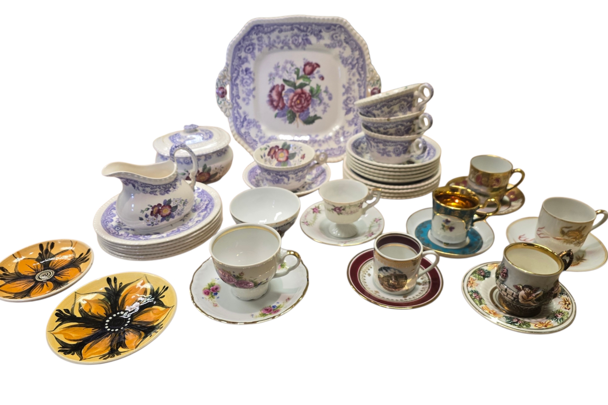 A mixed group of ceramics including a Copeland “Mayflower” pattern part service (cups, saucers, plates, jug, lidded sugar bowl and serving dish), together with assorted cabinet cups and saucers by makers including Noritake, Capodimonte, Hummendorfer Kronach and others.