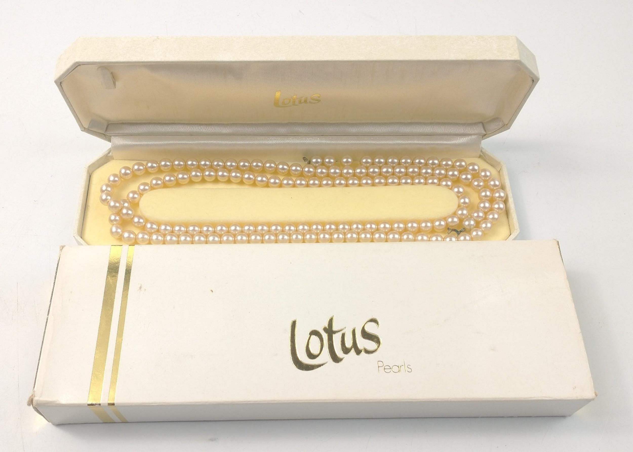 A boxed and cased set of well presented simulated LORUS pearls. 110cm long single strand with worn clasp.
