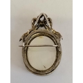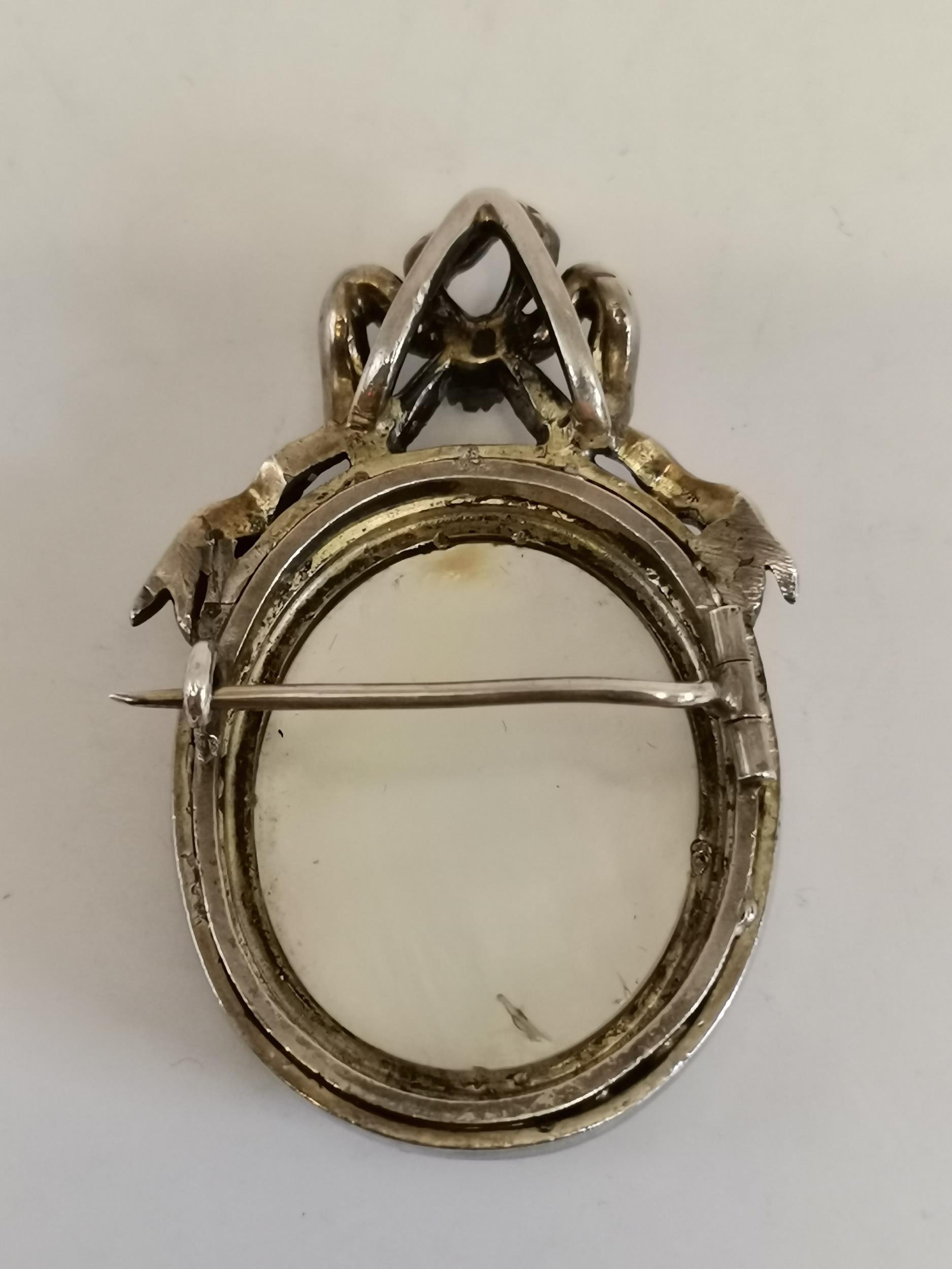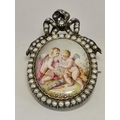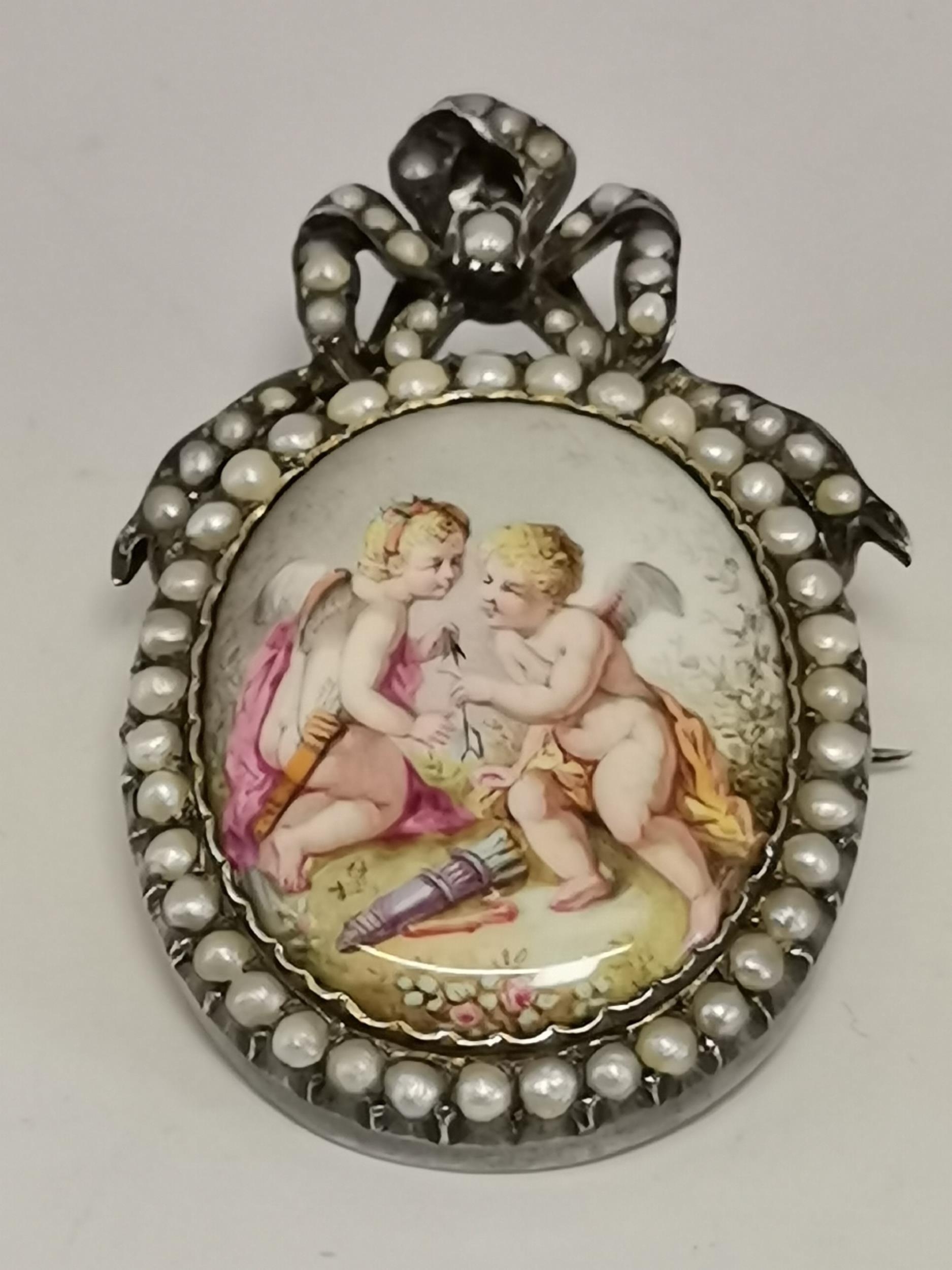 A 19th Century Continental white metal enamelled mourning brooch, the oval plaque decorated with two winged cherubs in a naturalistic setting with flowers, bordered and surmounted by a ribbon-tied bow set with split seed pearls, with mother-of-pearl to the reverse, glass back panel deficient. 46mm high