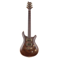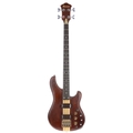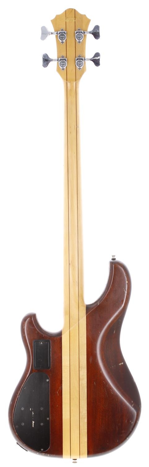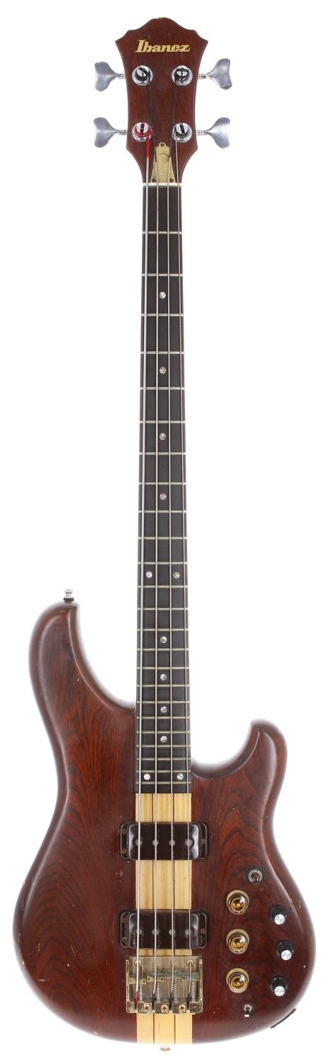 1981 Ibanez Musician MC924 bass guitar, made in Japan; Body: walnut finished sen ash wings with maple centre, heavy dings and marks throughout; Neck: maple through neck, various dings; Fretboard: ebony; Frets: good; Electrics: working although with some jack intermittence; Hardware: some gold plating loss and oxidisation to bridge and saddles, slight bend to coil switch; Case: oblong hard case; Weight: 4.61kg; Overall condition: fair
