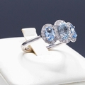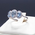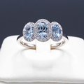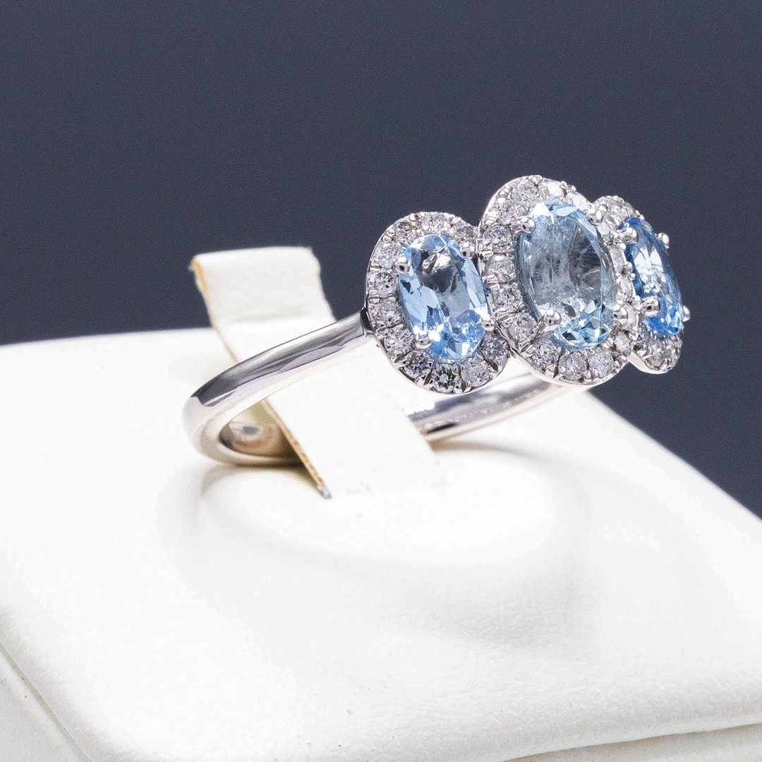 A PLATINUM AQUAMARINE AND DIAMOND TRILOGY RING. set with three oval aquamarines each surrounded by round brilliant cut diamonds. Aquamarine 0.86ct. Diamonds 0.26ct, with box.
