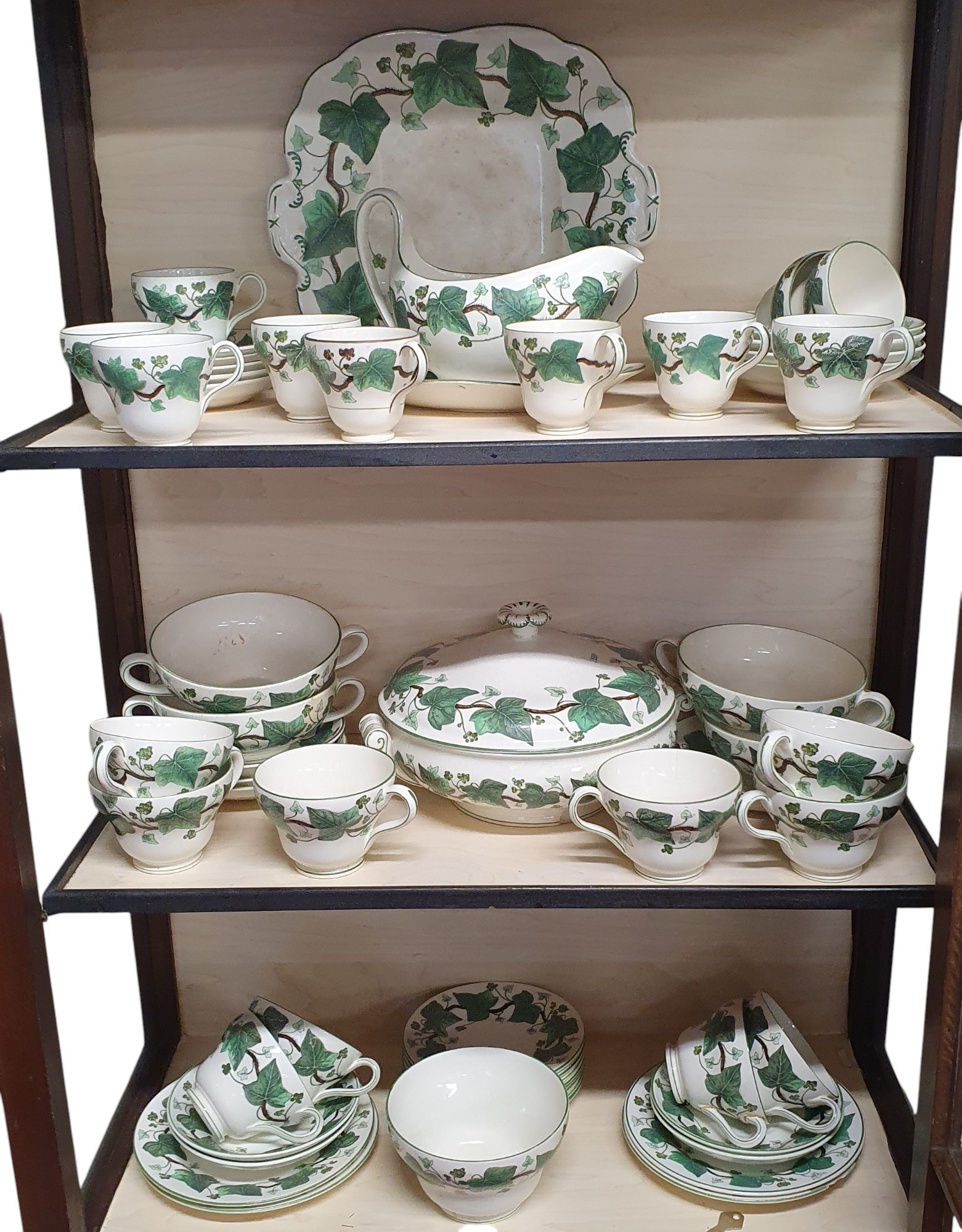 A good quantity of Wedgwood Napoleon Ivy pattern Dinnerwares on three shelves.