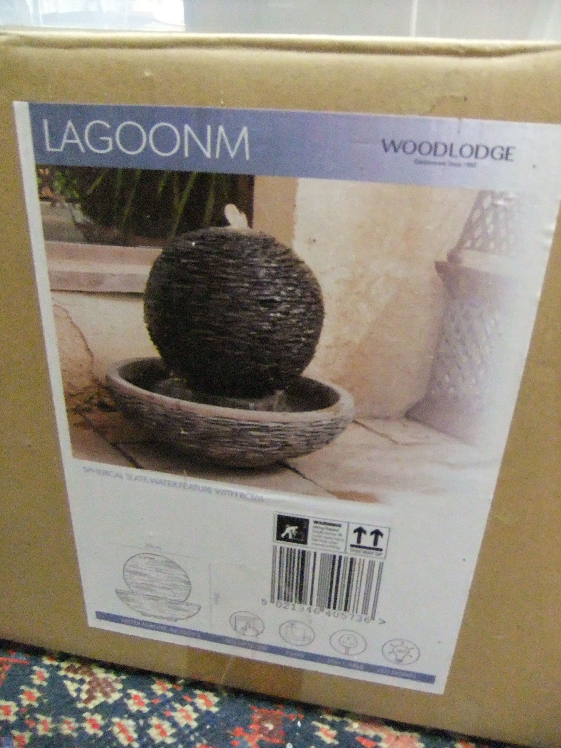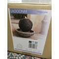 A stoneware garden water featuring featuring a globe, boxed and unused