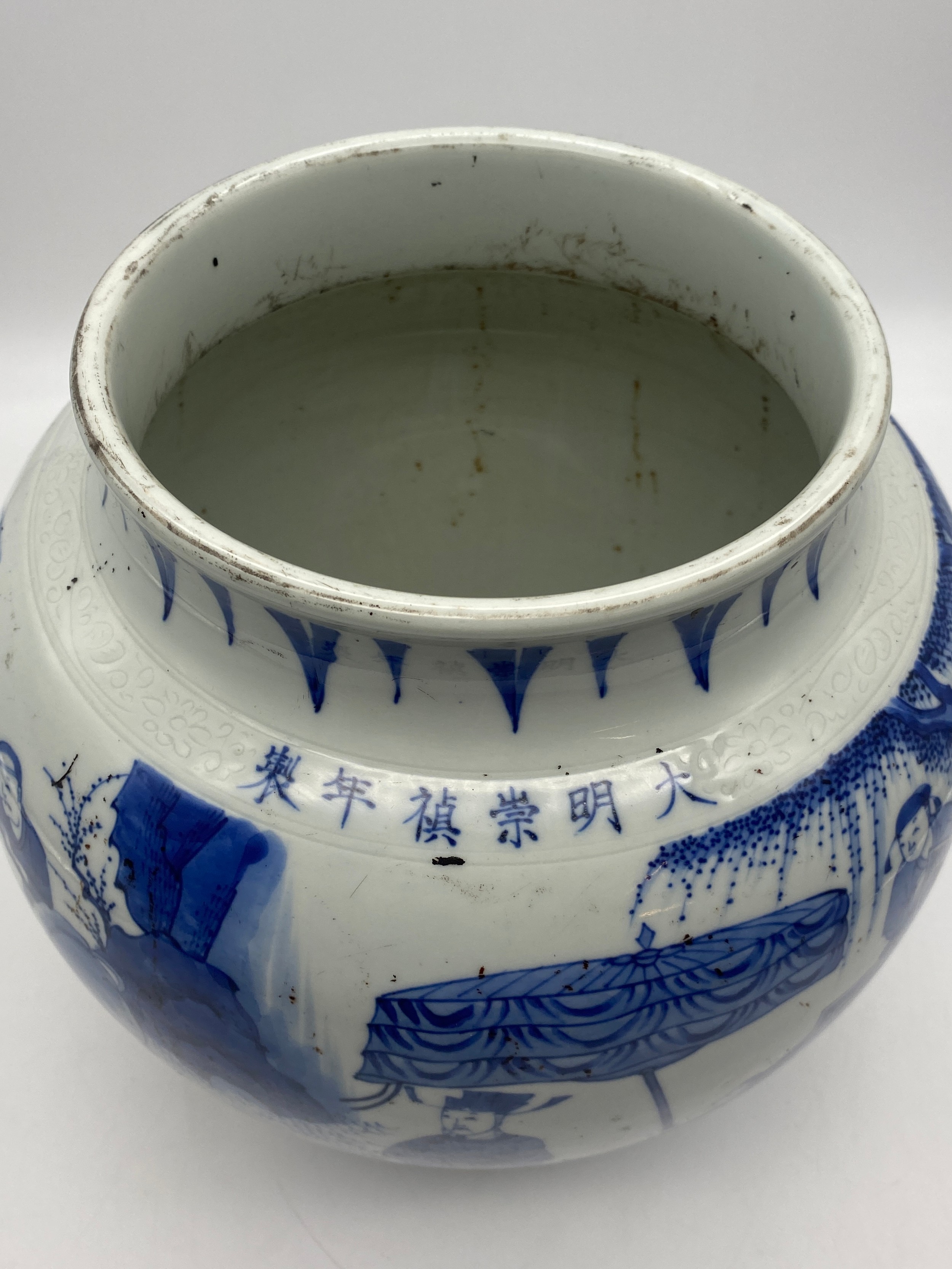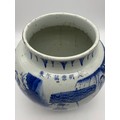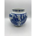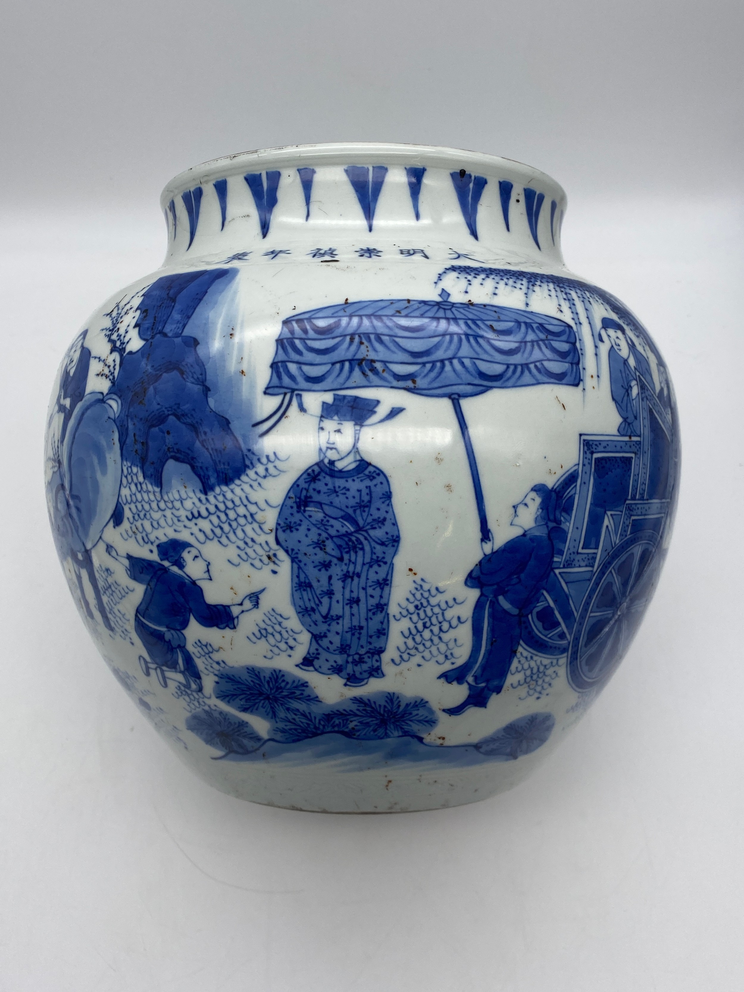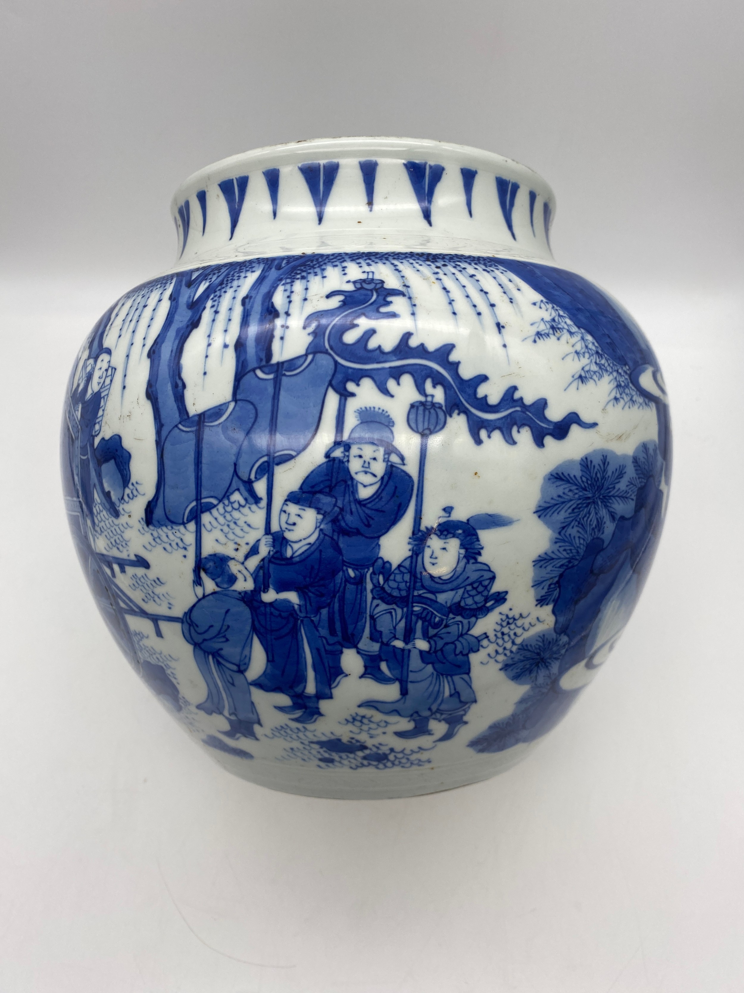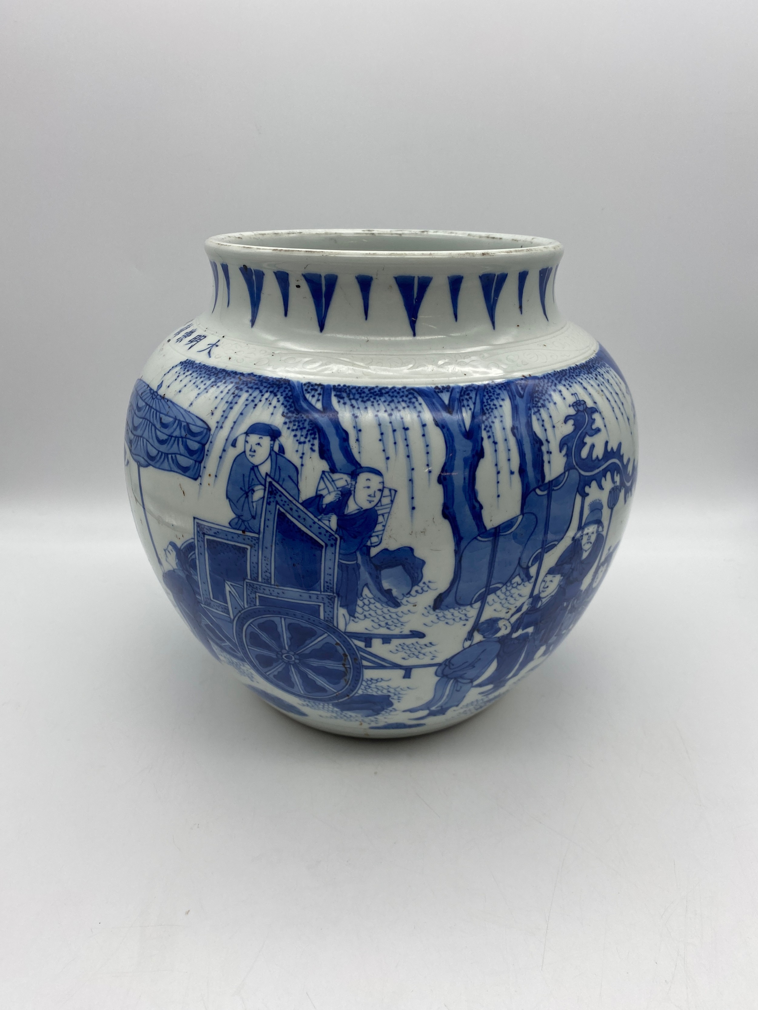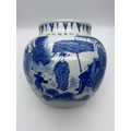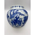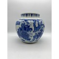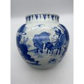 CHINESE BLUE AND WHITE BULBOUS VASE DECORATED WITH A DIGNITARY WITH ATTENDANTS HEIGHT 22.5CM APPROX