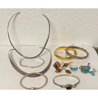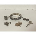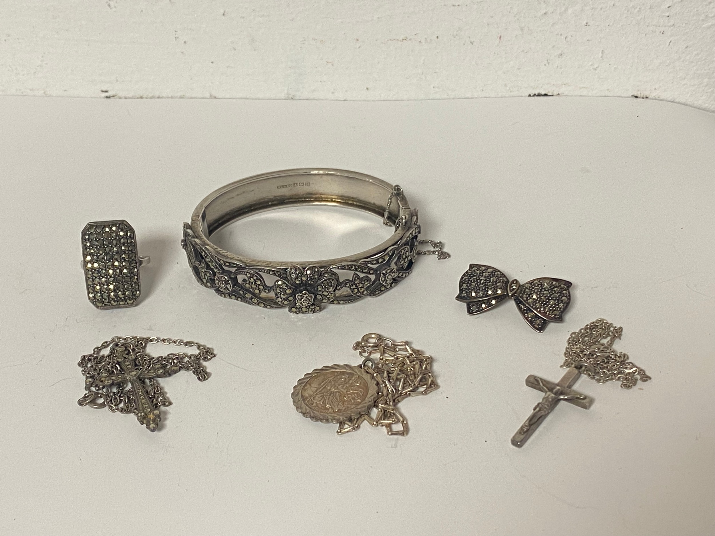 A silver and marcasite set hinged bangle, together with silver and marcasite ring and brooch, silver St Christopher and silver cross pendants etc -