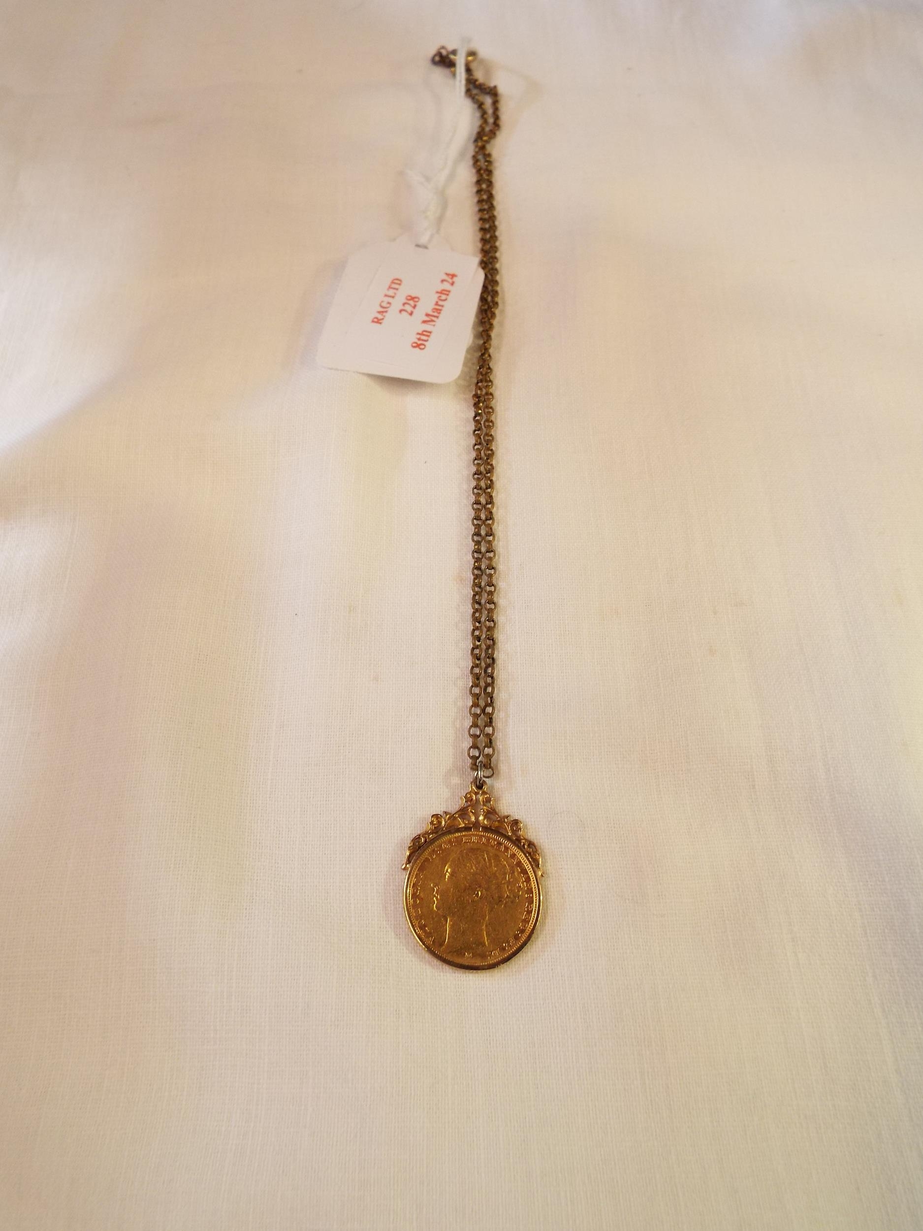 A Victorian 1884 gold sovereign with 9ct gold mount and chain total weight 14.53 gms