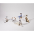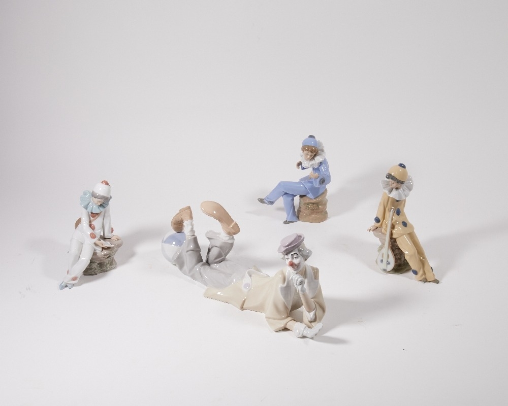 Four Lladro and Nao porcelain figures of clowns, late 20th century, comprising: a large figure of a recumbent clown with a beach ball, printed and impressed marks, 37cm long, 15cm high; and three figures of young clowns with guitars (one lacking a guitar), printed and impressed marks, the tallest 19.8cm high (4)