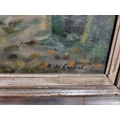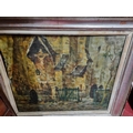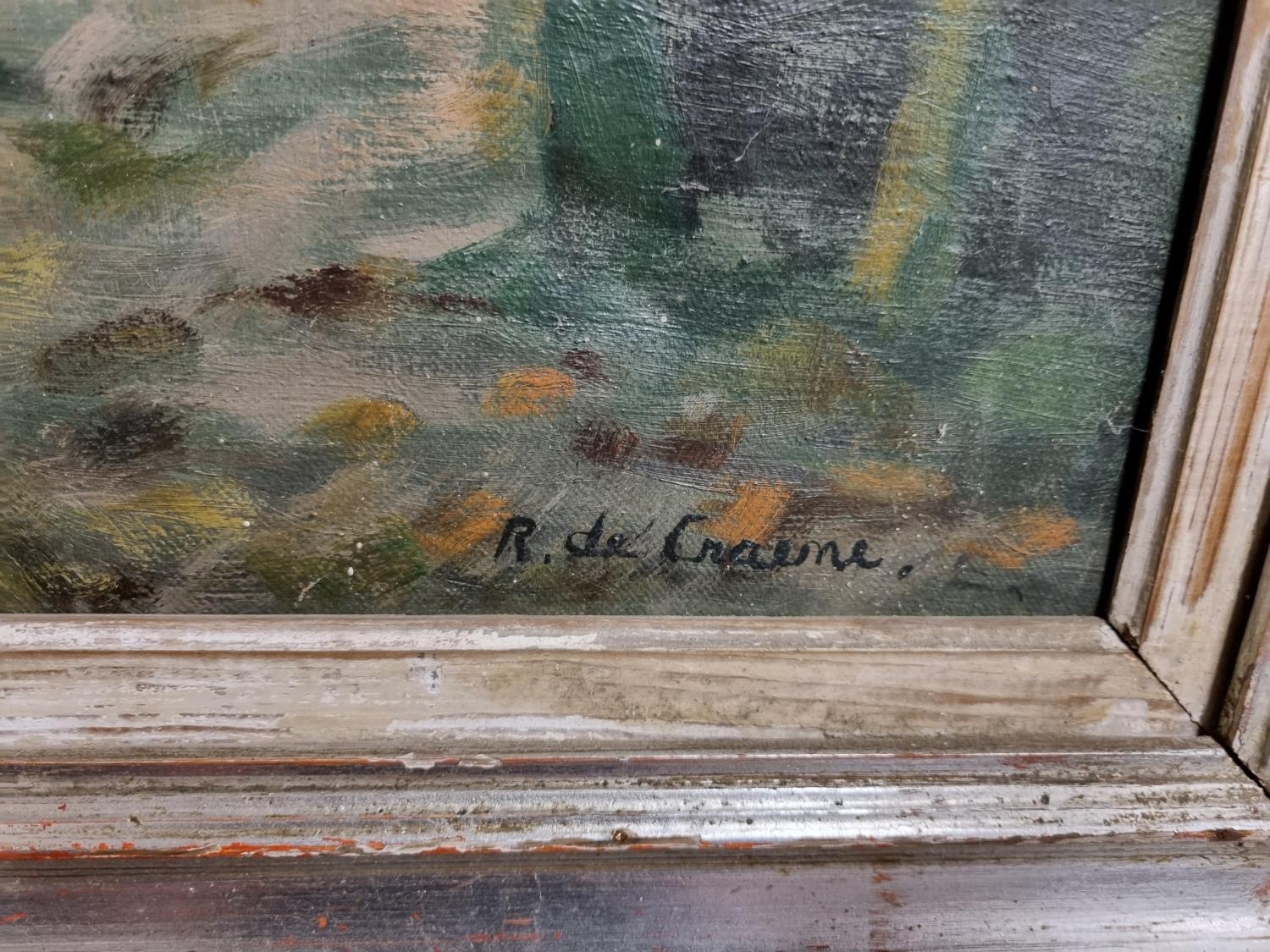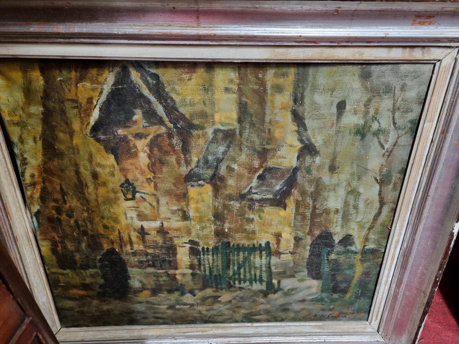 Oil on canvas of a impressionist style church and street scene, possibly french school signed R De Crecune ?. 49 x 59 in a silver and ebonised modern frame 50 x 60 cms approx.